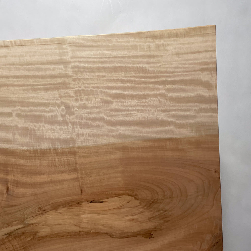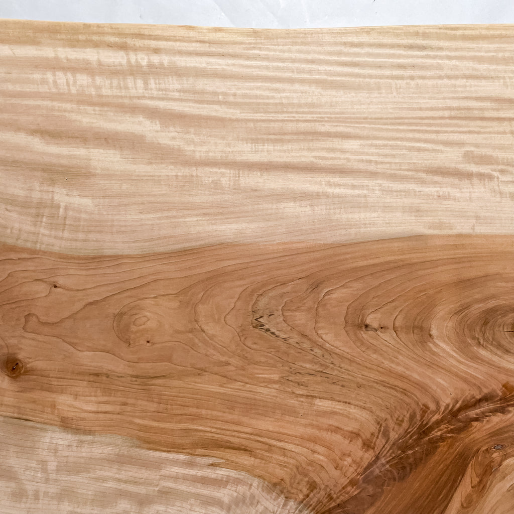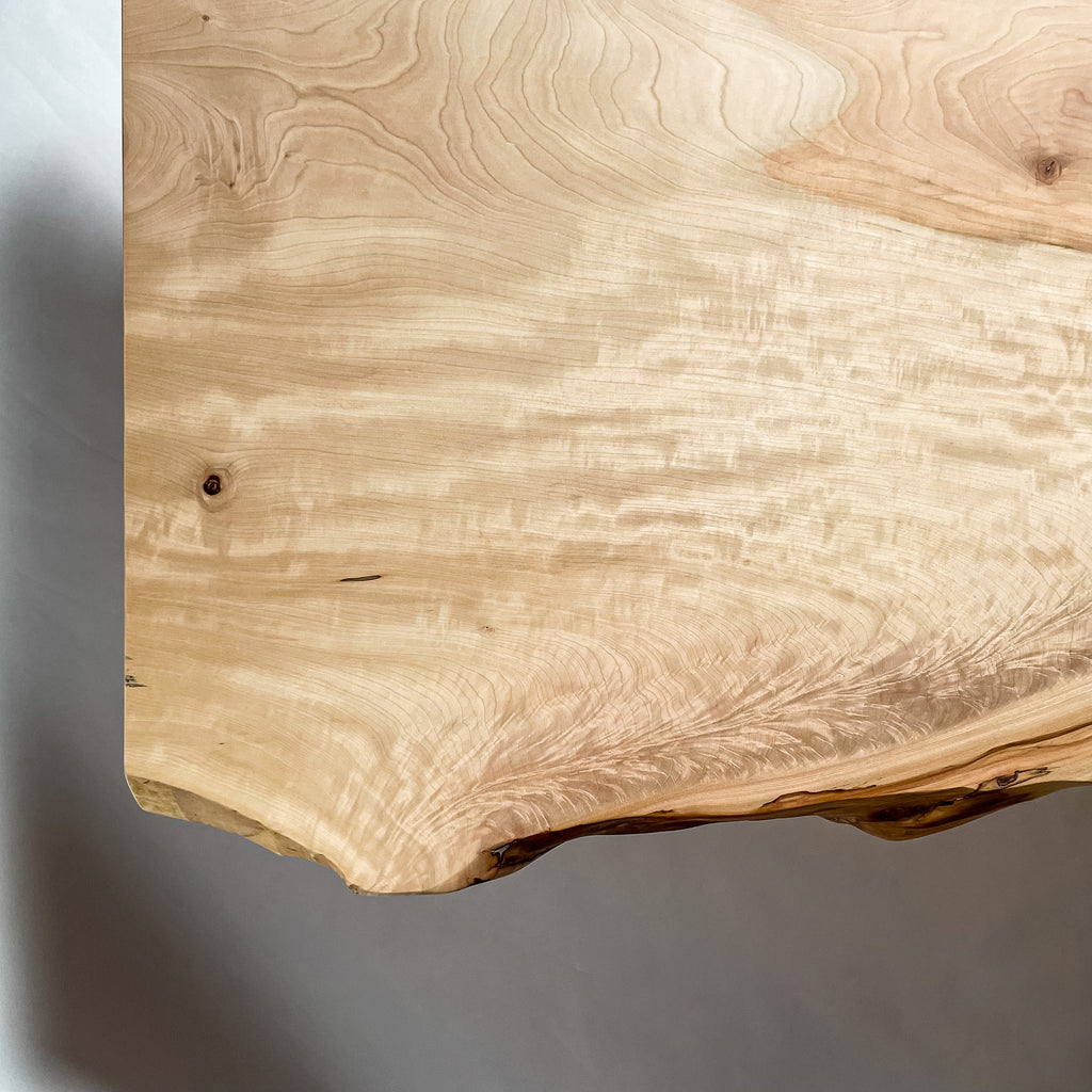 栃の木が大地に根を張り、長い歳月を重ねて刻まれた杢目が、川の流れのように広がります。淡い白と温かな飴色が織りなす表情に、縮み杢が光を受けてきらめきを添え、自然の生い立ちをそのままに残した上品な仕上げです。
