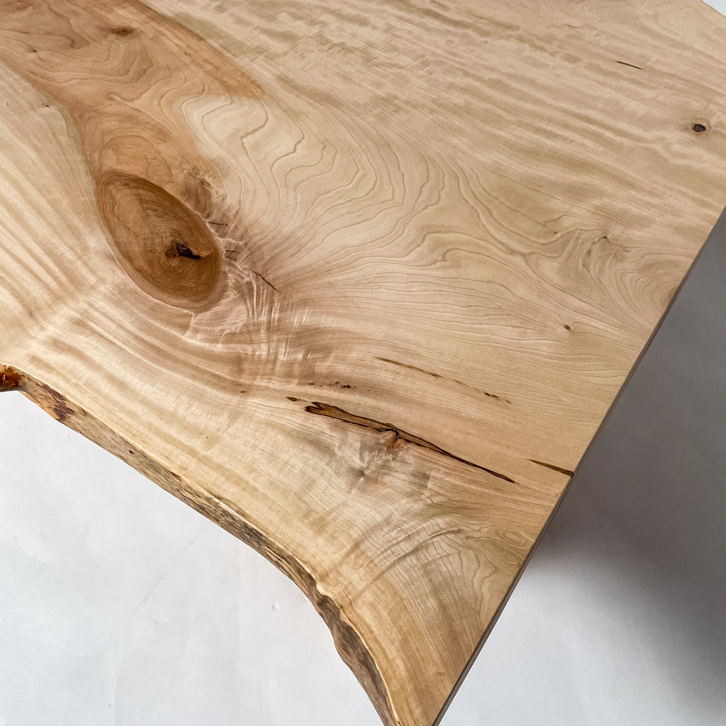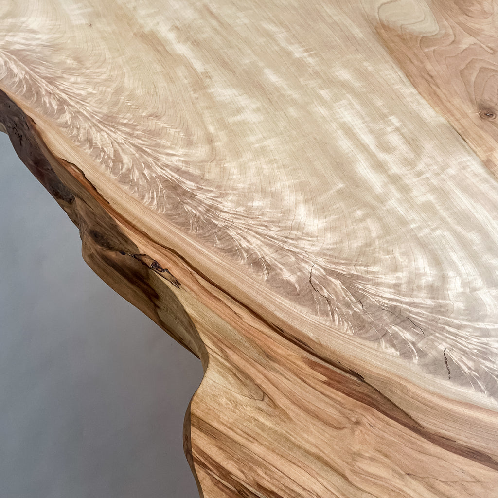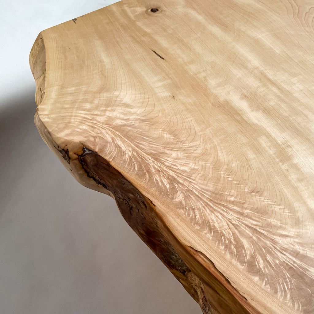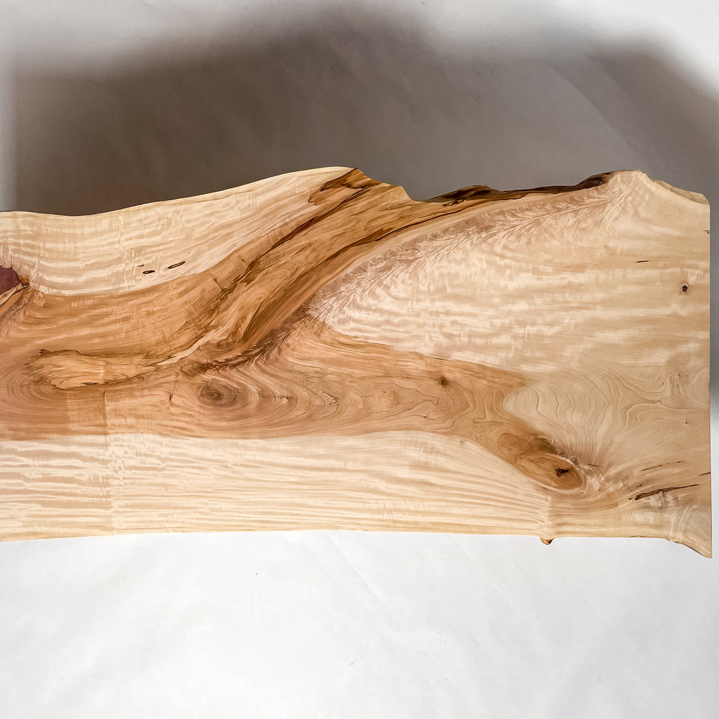 栃の木が大地に根を張り、長い歳月を重ねて刻まれた杢目が、川の流れのように広がります。淡い白と温かな飴色が織りなす表情に、縮み杢が光を受けてきらめきを添え、自然の生い立ちをそのままに残した上品な仕上げです。