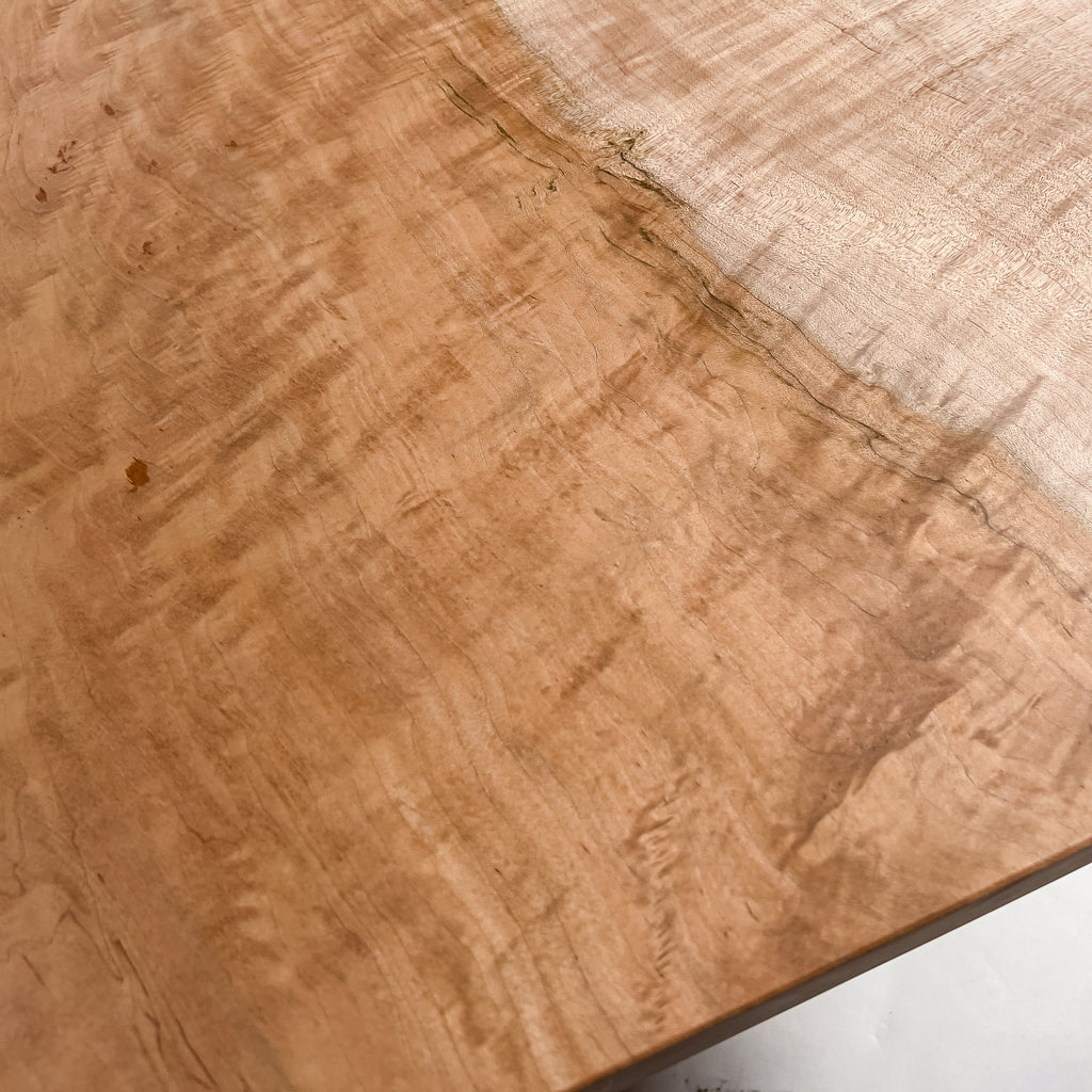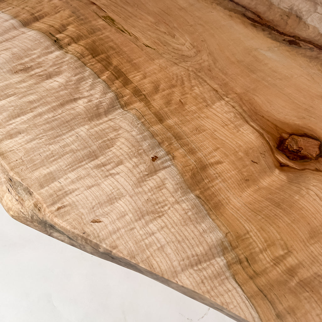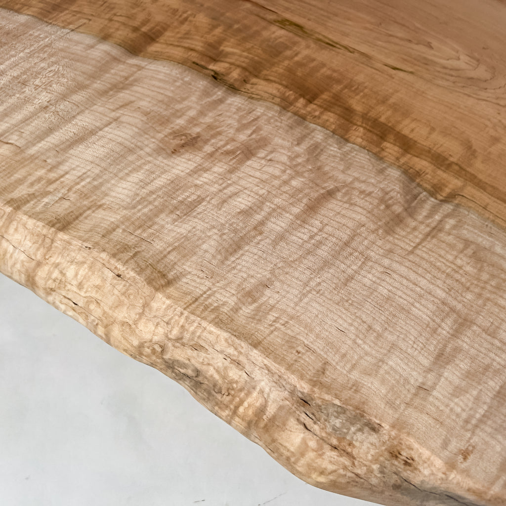 緻密で滑らかな木肌を持つ楓は、淡い乳白色と上品な光沢が魅力。硬く粘り強い性質を持つため一枚板テーブルに適し、経年変化で飴色へと深まる美しさと高い耐久性を兼ね備えています。