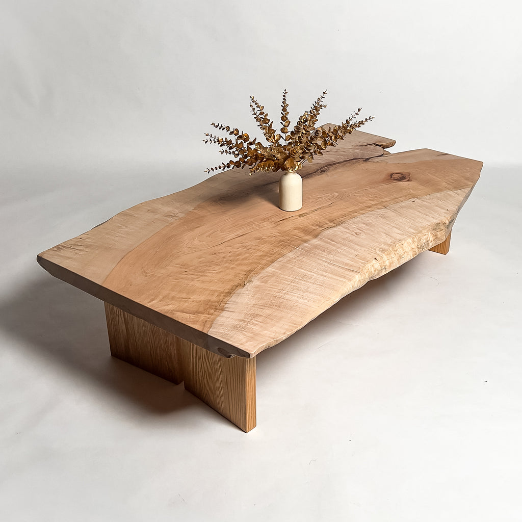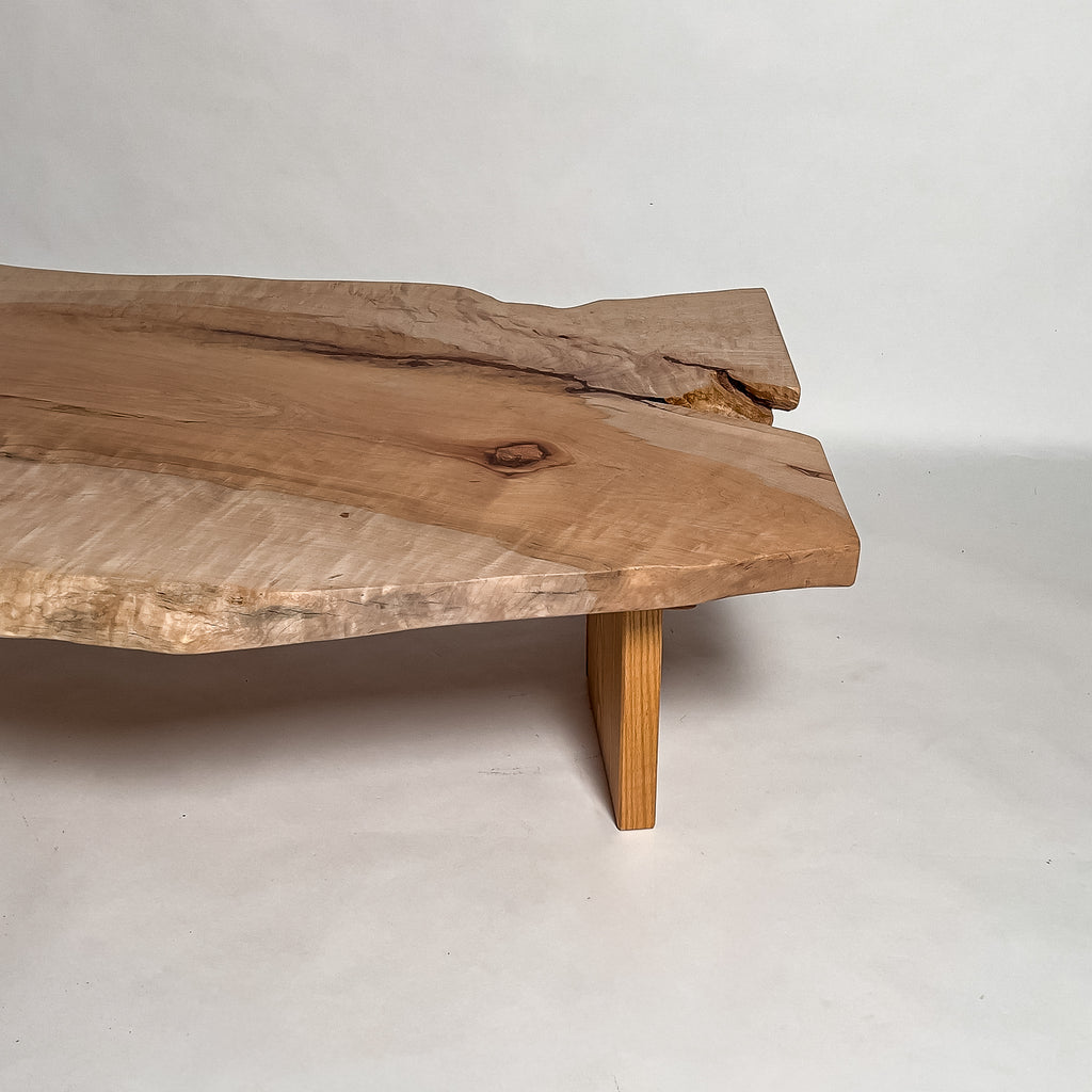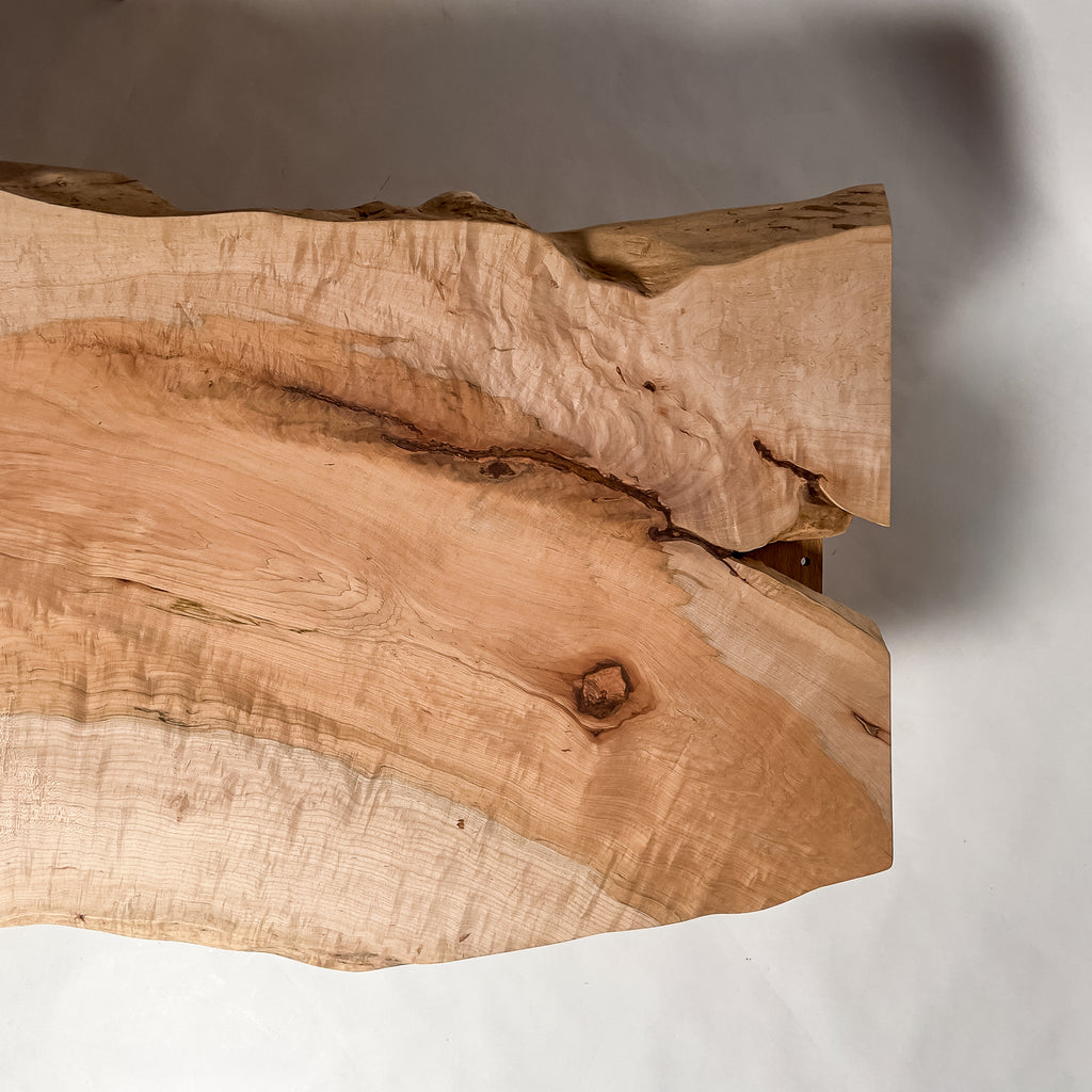 緻密で滑らかな木肌を持つ楓は、淡い乳白色と上品な光沢が魅力。硬く粘り強い性質を持つため一枚板テーブルに適し、経年変化で飴色へと深まる美しさと高い耐久性を兼ね備えています。