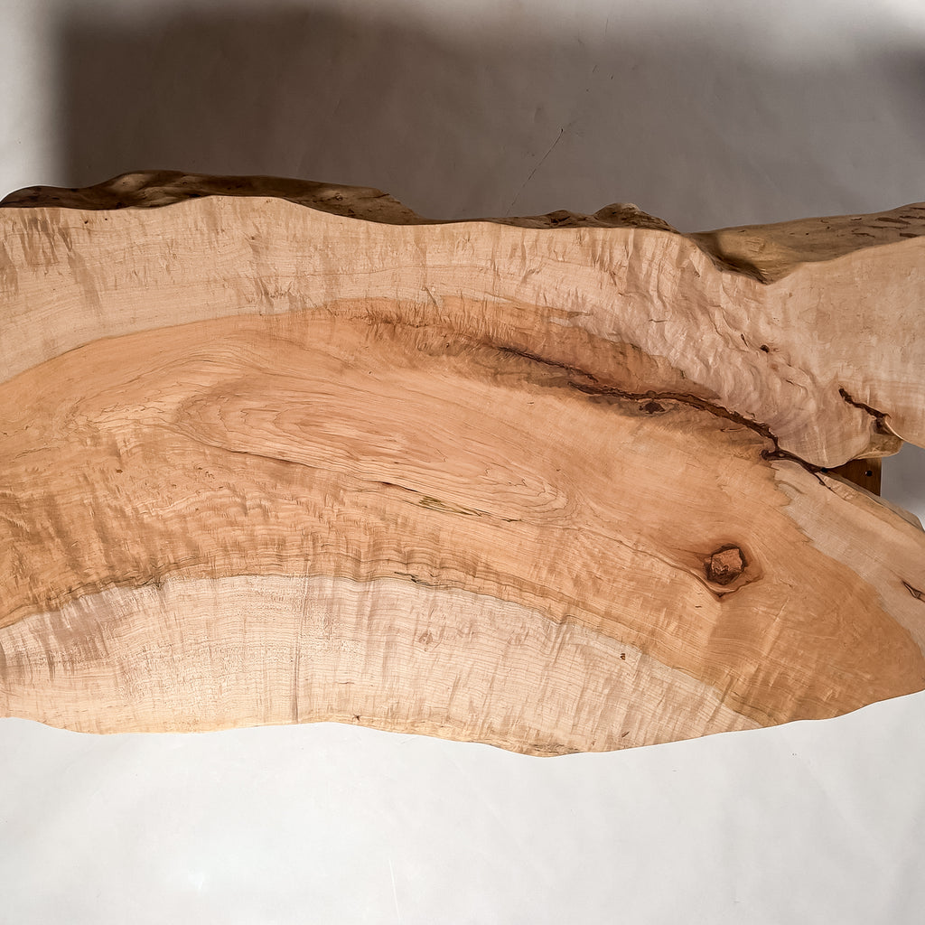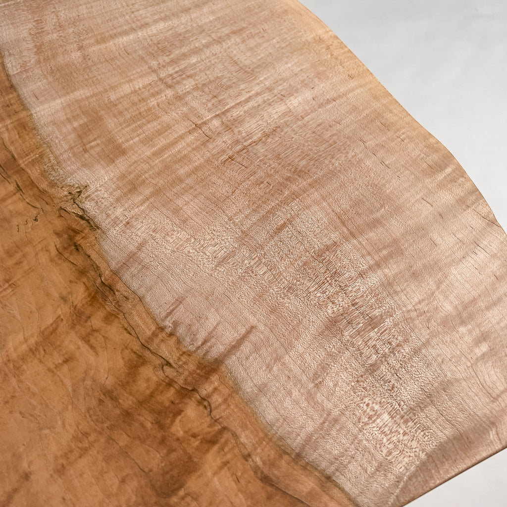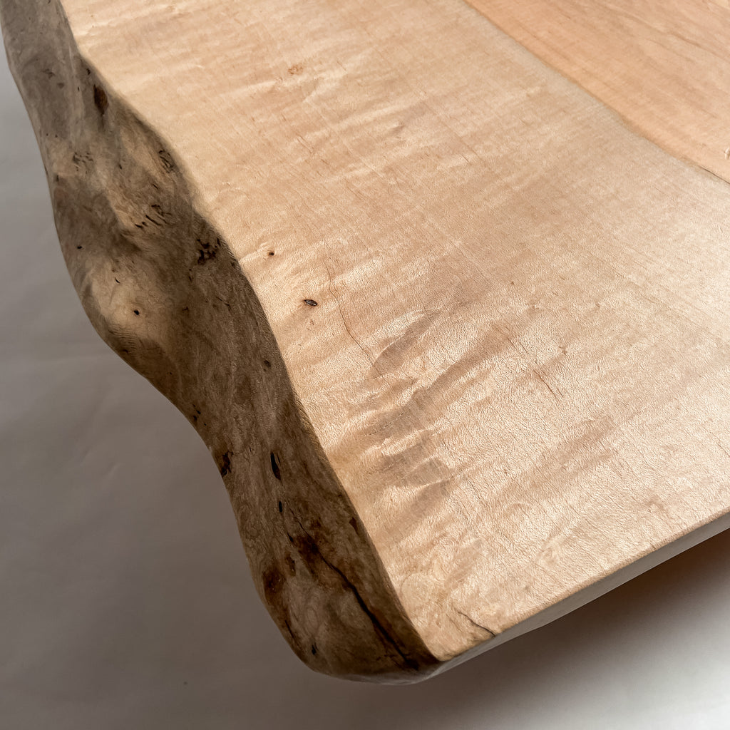 やわらかな乳白色から飴色へと移ろう楓の色味が、水面の波紋のように広がります。雪深い地で育ったからこそ現れた縮み杢がやさしく揺れ、自然の形を丁寧に生かした加工により、木が育んだ歳月をそのまま感じられる一枚です。