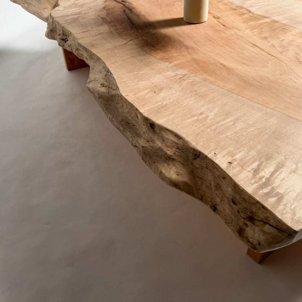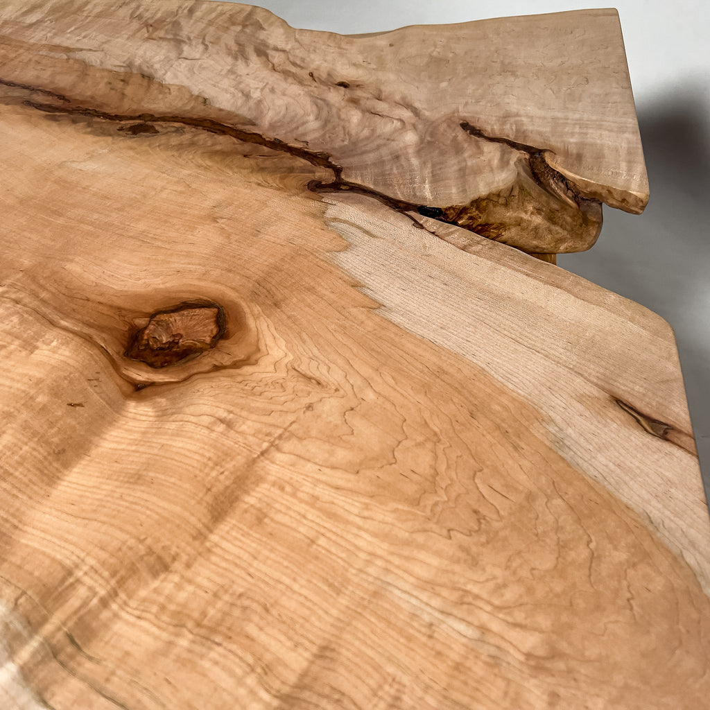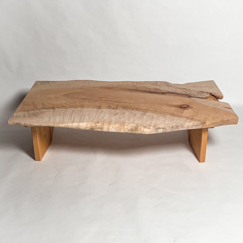 やわらかな乳白色から飴色へと移ろう楓の色味が、水面の波紋のように広がります。雪深い地で育ったからこそ現れた縮み杢がやさしく揺れ、自然の形を丁寧に生かした加工により、木が育んだ歳月をそのまま感じられる一枚です。