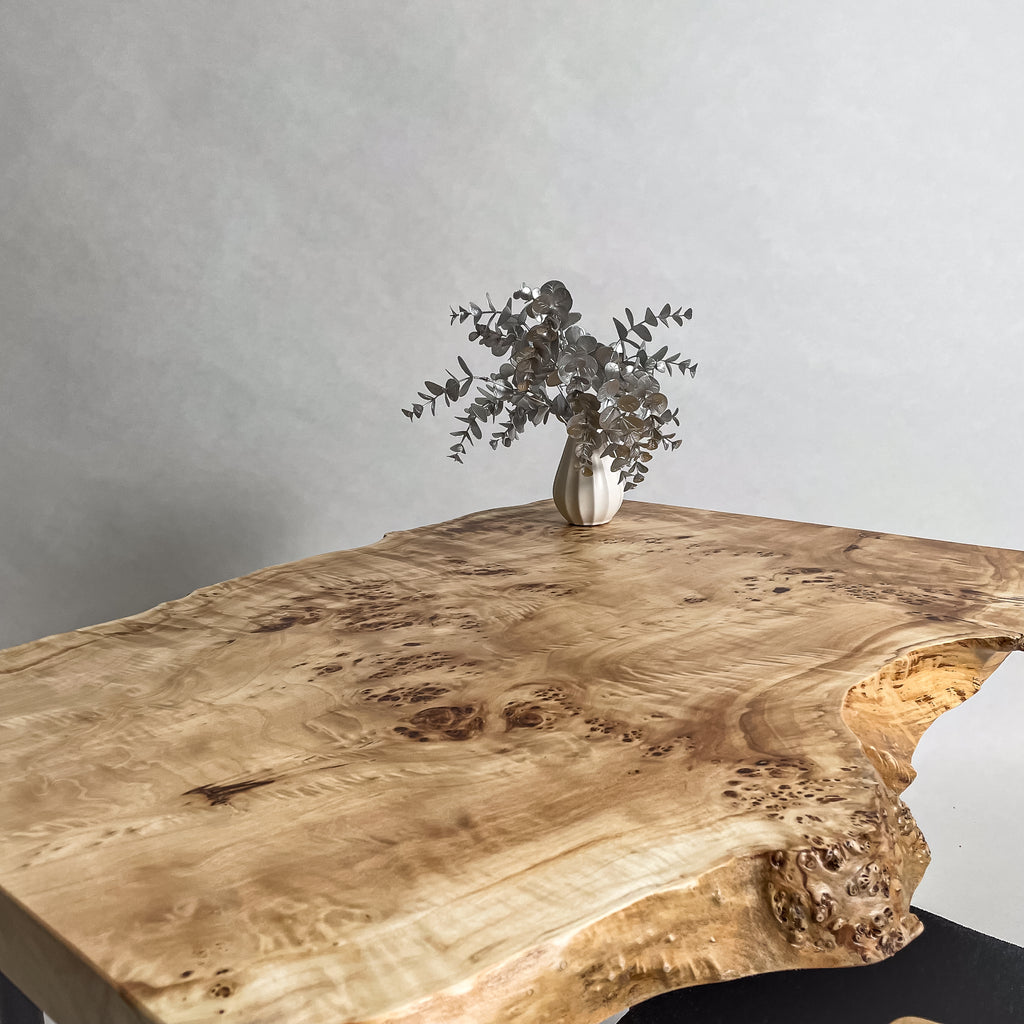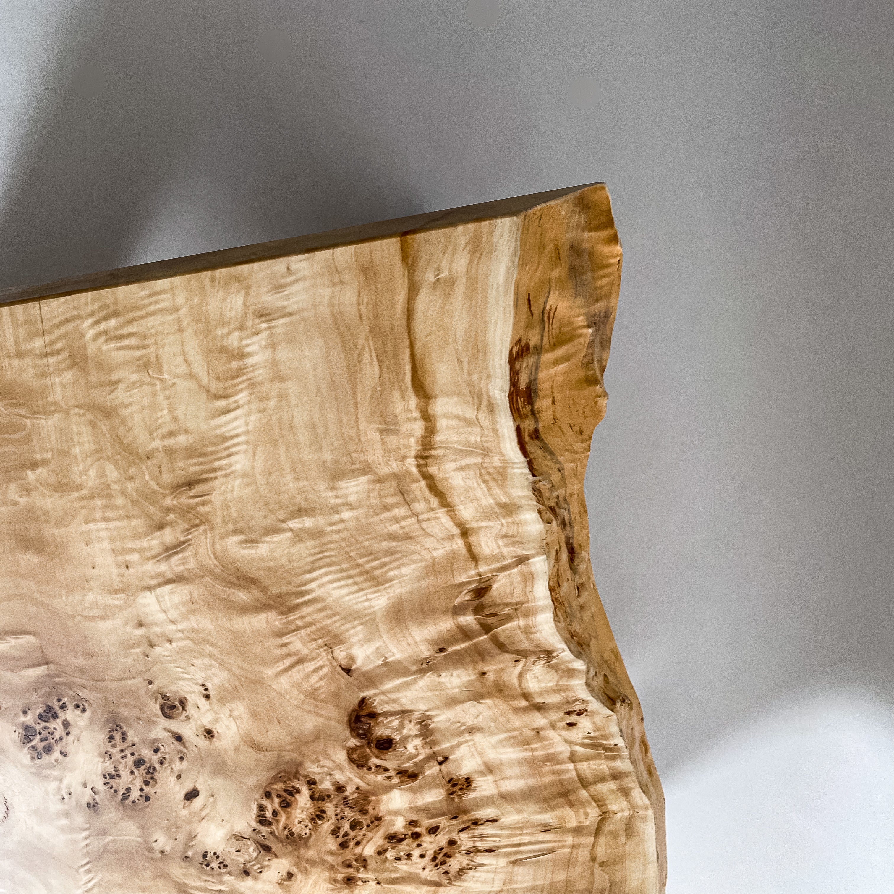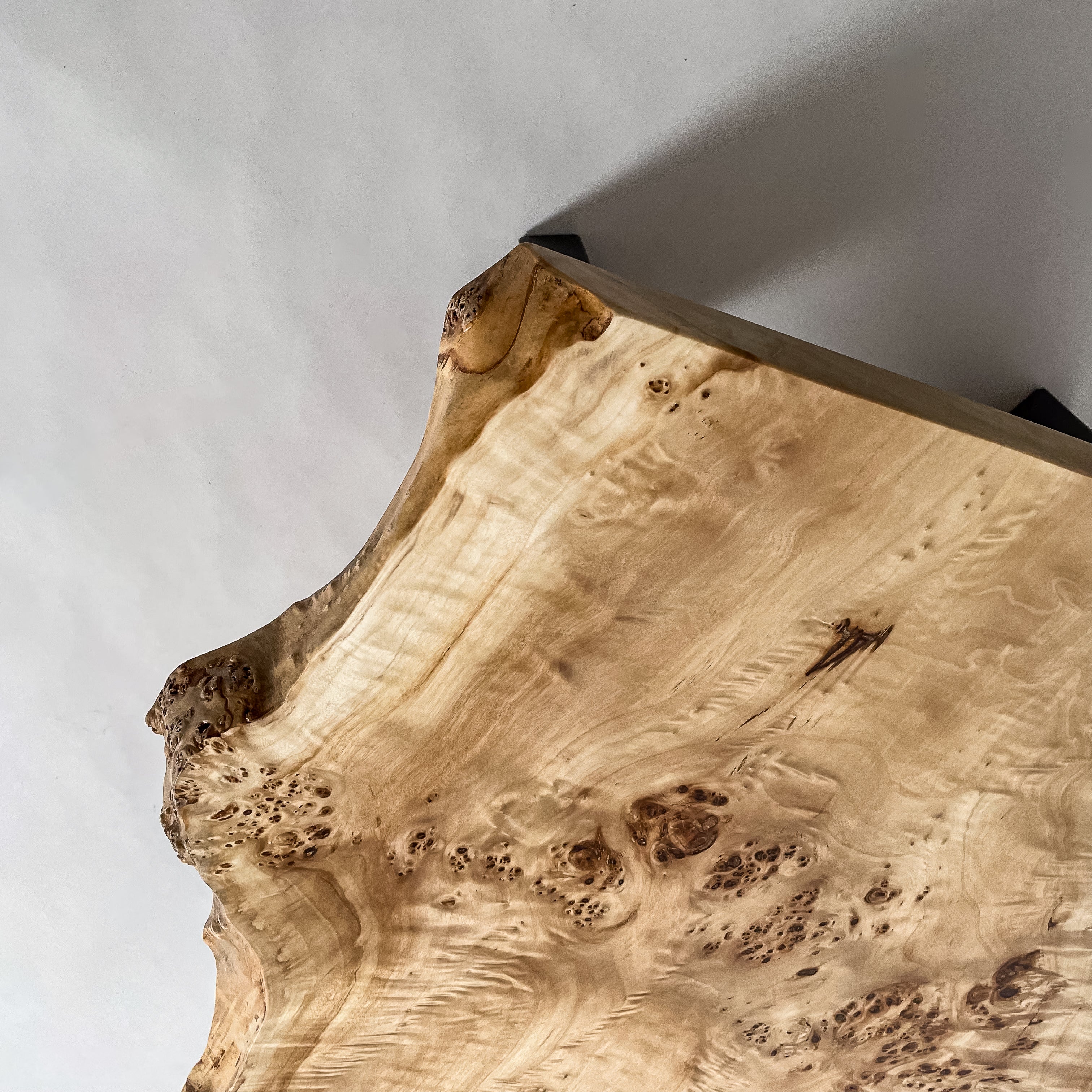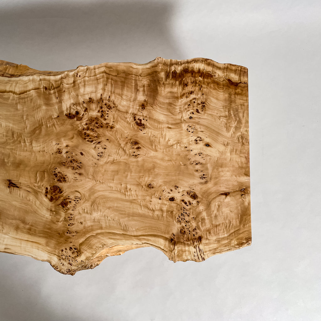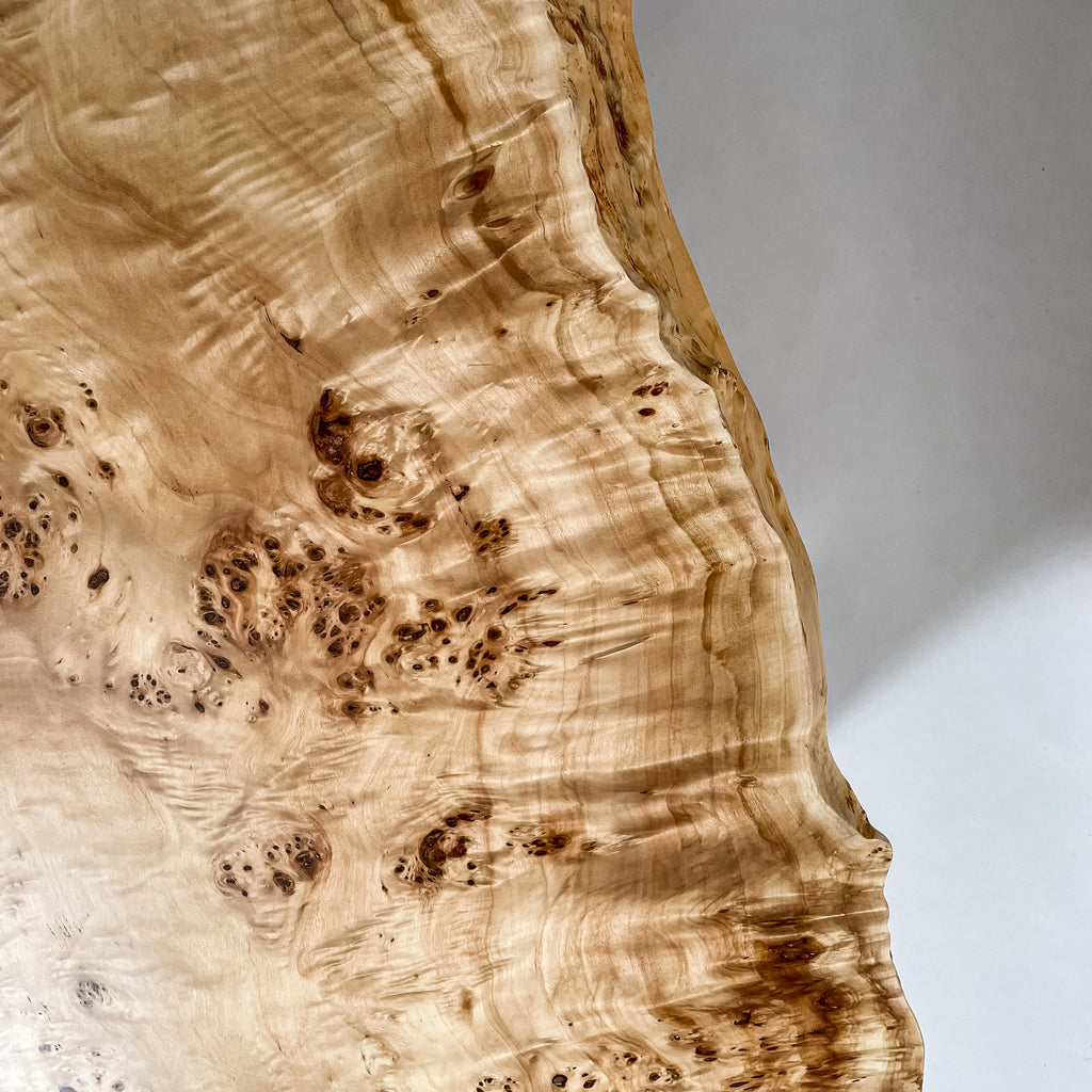 深い森で育ったポプラが長い年月を重ねて生んだ瘤杢が、黄金色の中に豊かな表情を描きます。自然の形を残した加工が、木が刻んだ時間の流れと温かな息づかいを上品に伝える、味わい深い魅力の一枚です。