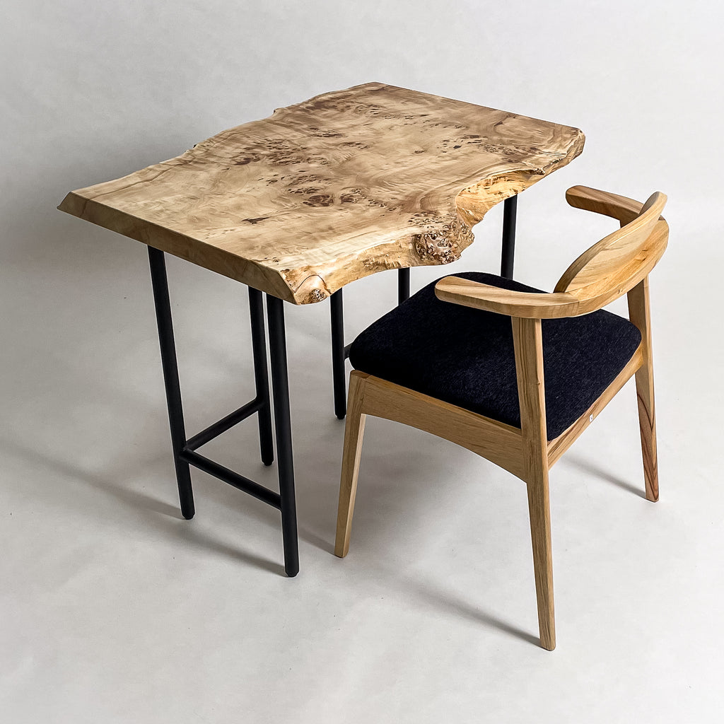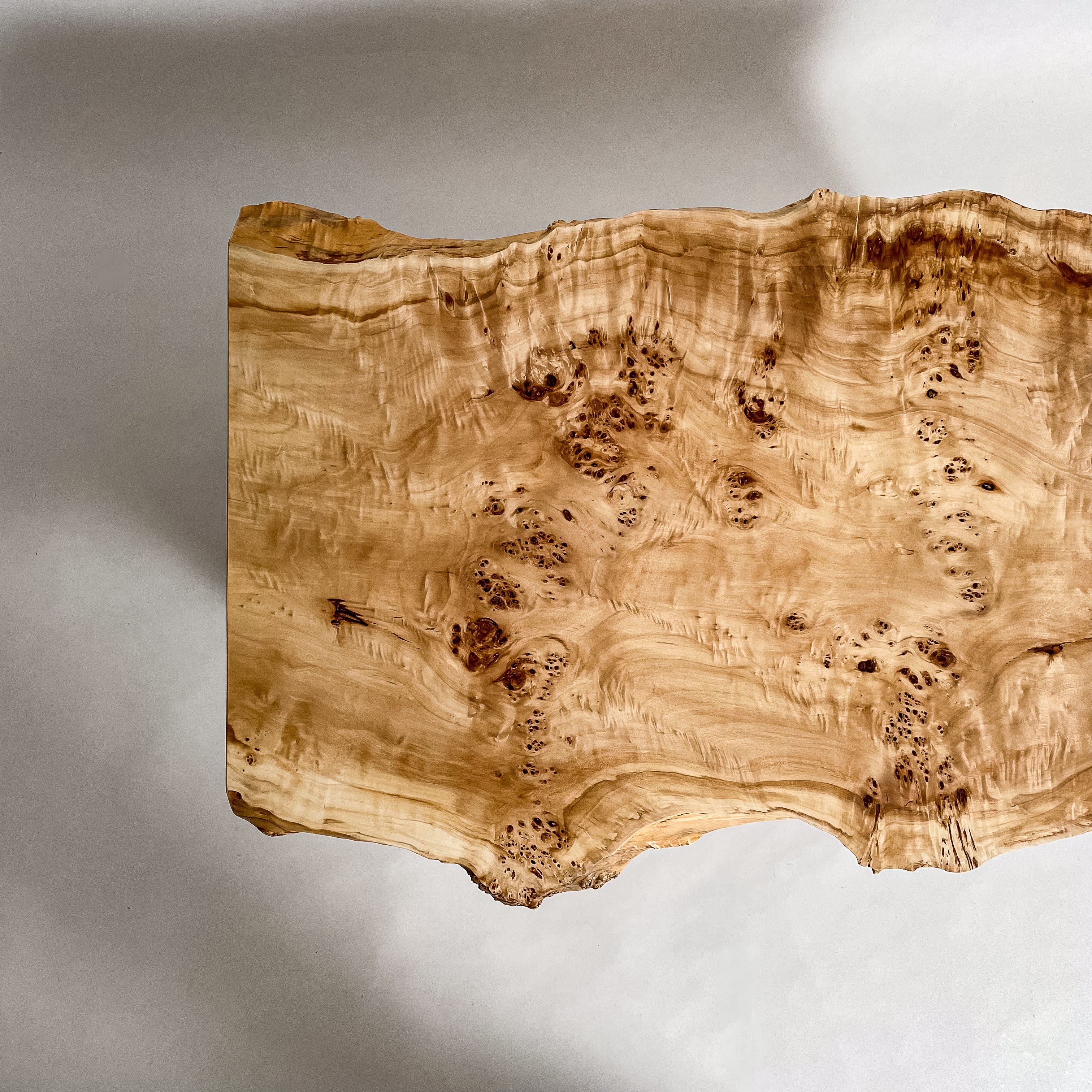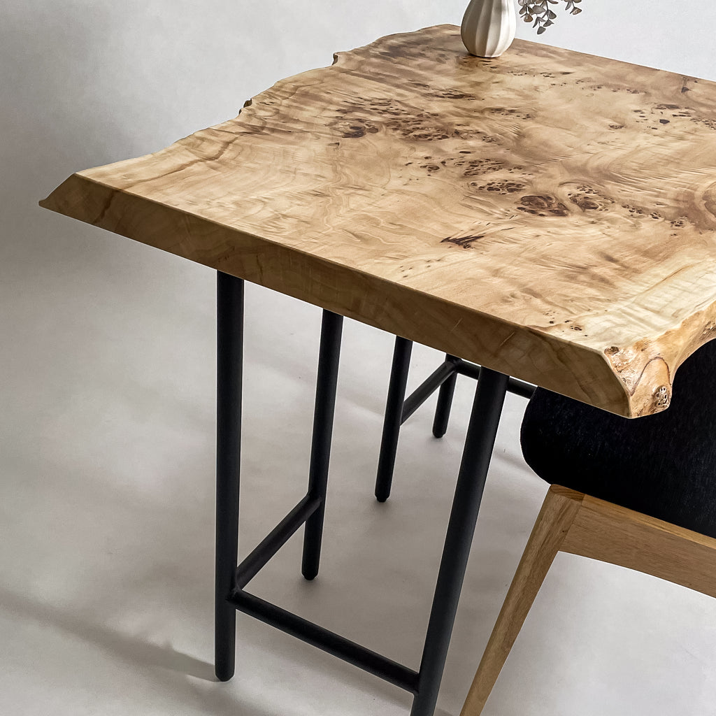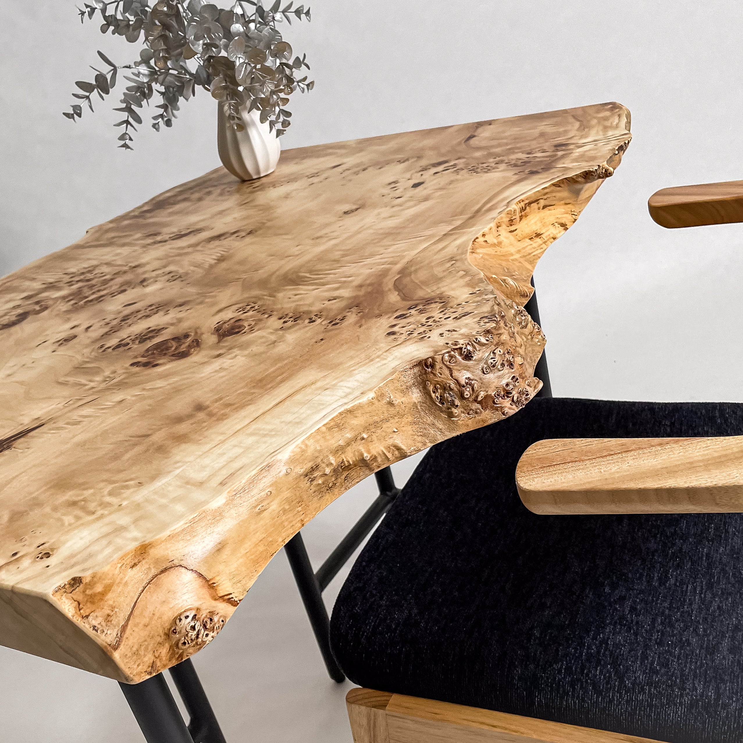 深い森で育ったポプラが長い年月を重ねて生んだ瘤杢が、黄金色の中に豊かな表情を描きます。自然の形を残した加工が、木が刻んだ時間の流れと温かな息づかいを上品に伝える、味わい深い魅力の一枚です。