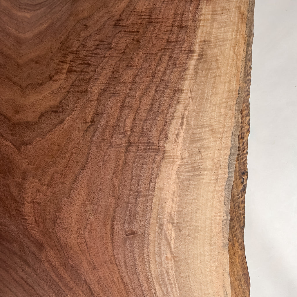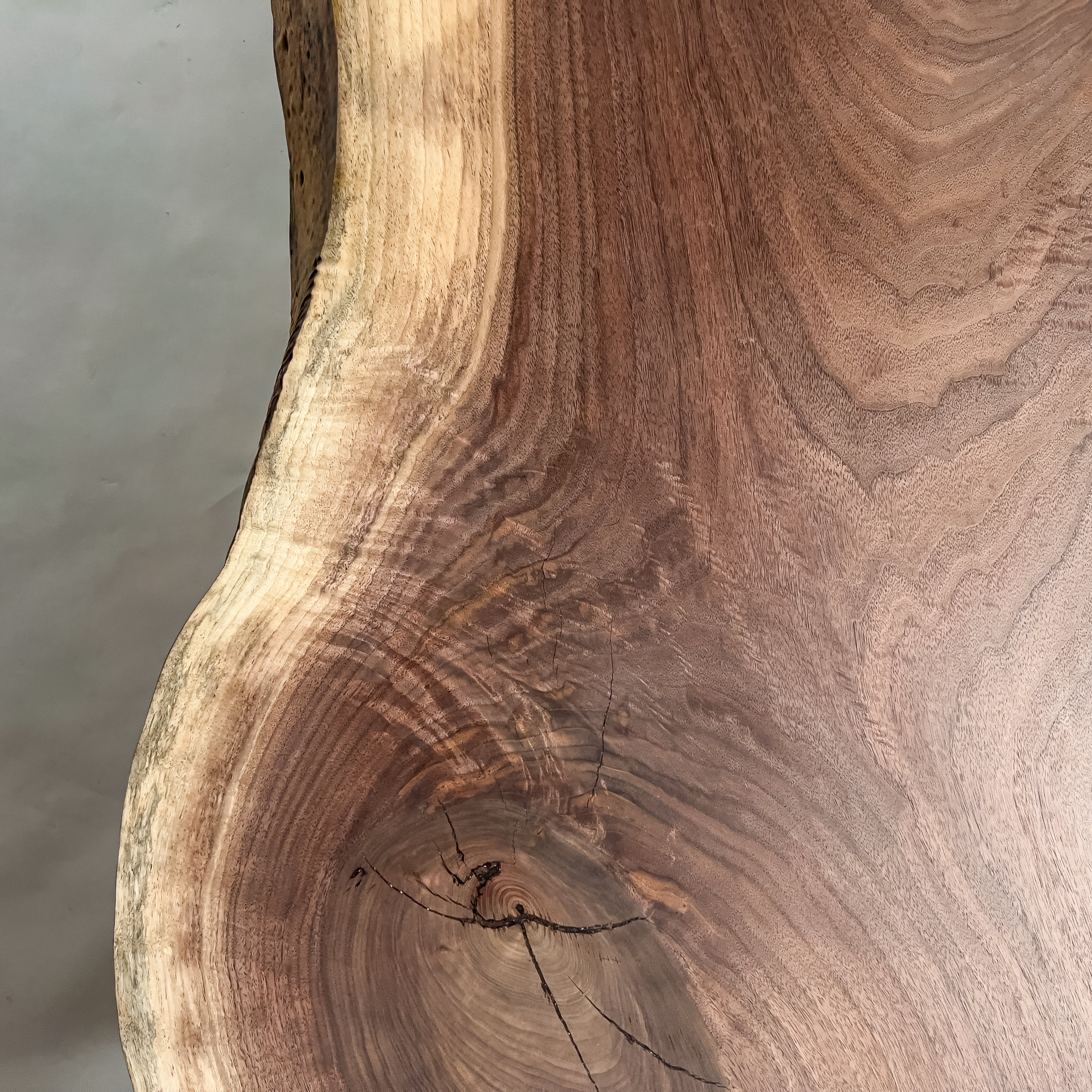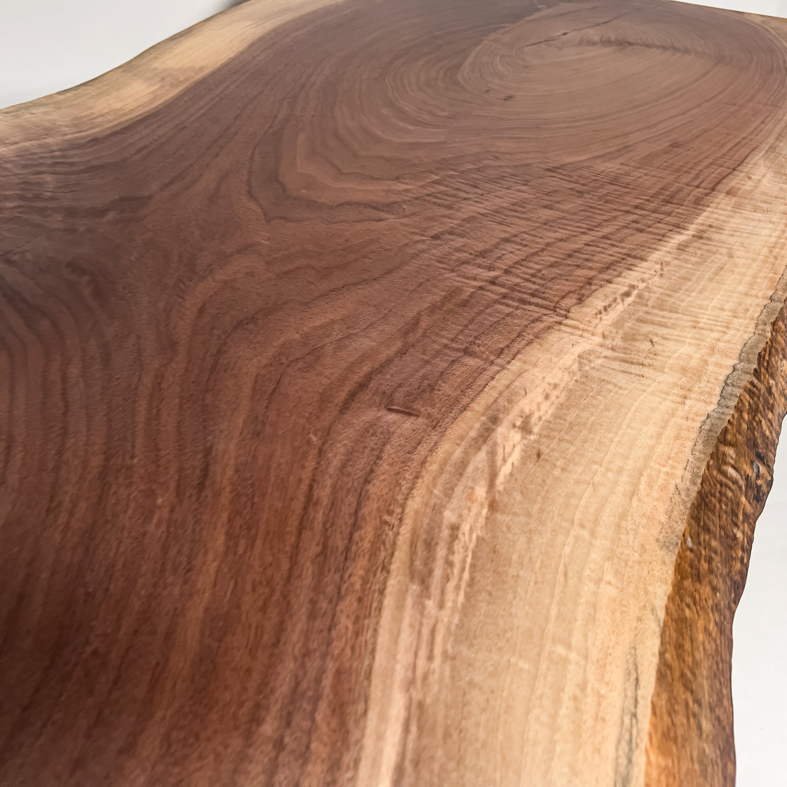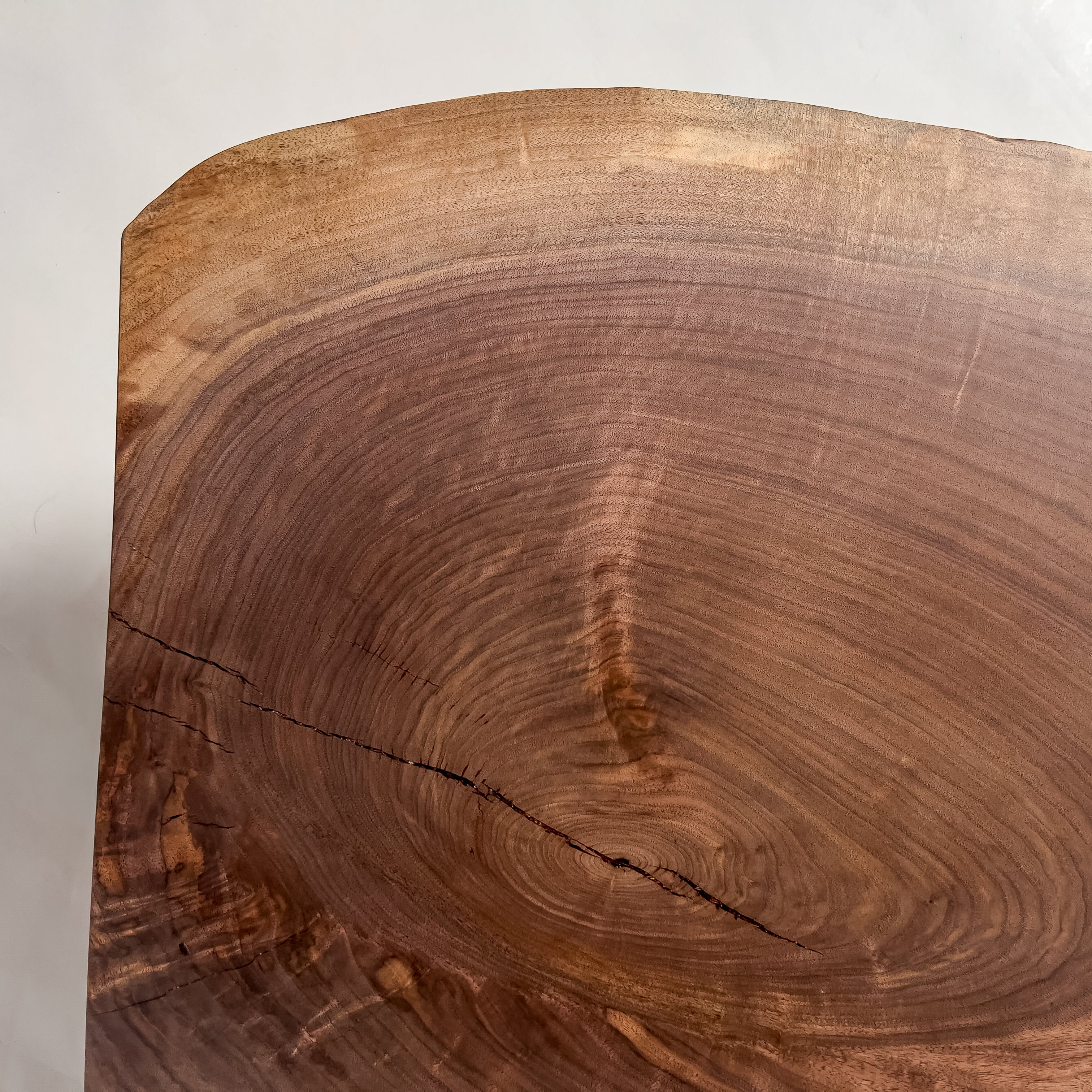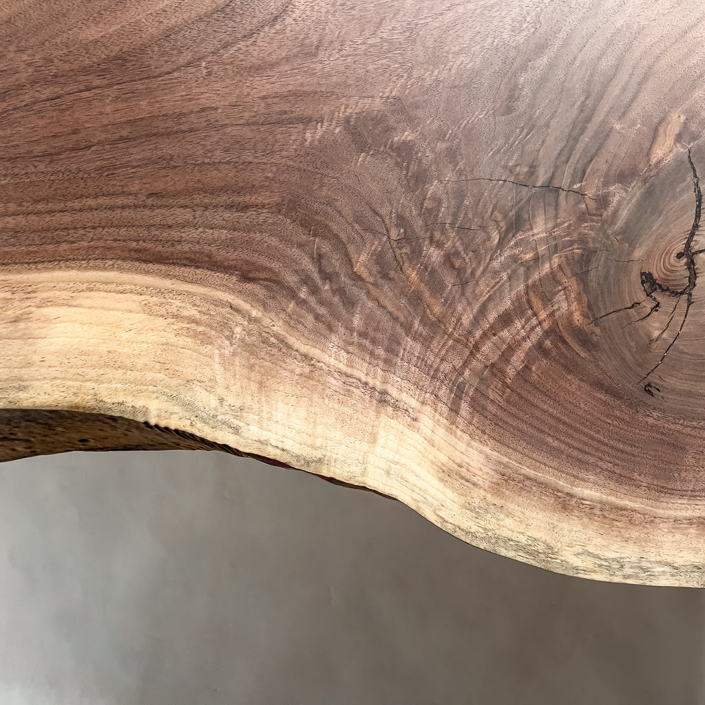 幾重にも重なる年輪が穏やかな波を描くウォールナット。長い歳月を生き抜いた木が、豊かな表情と深みのある色を纏いました。職人が木の鼓動を残すように磨き上げ、自然の力強さと温もりが調和する一枚に仕上げています。