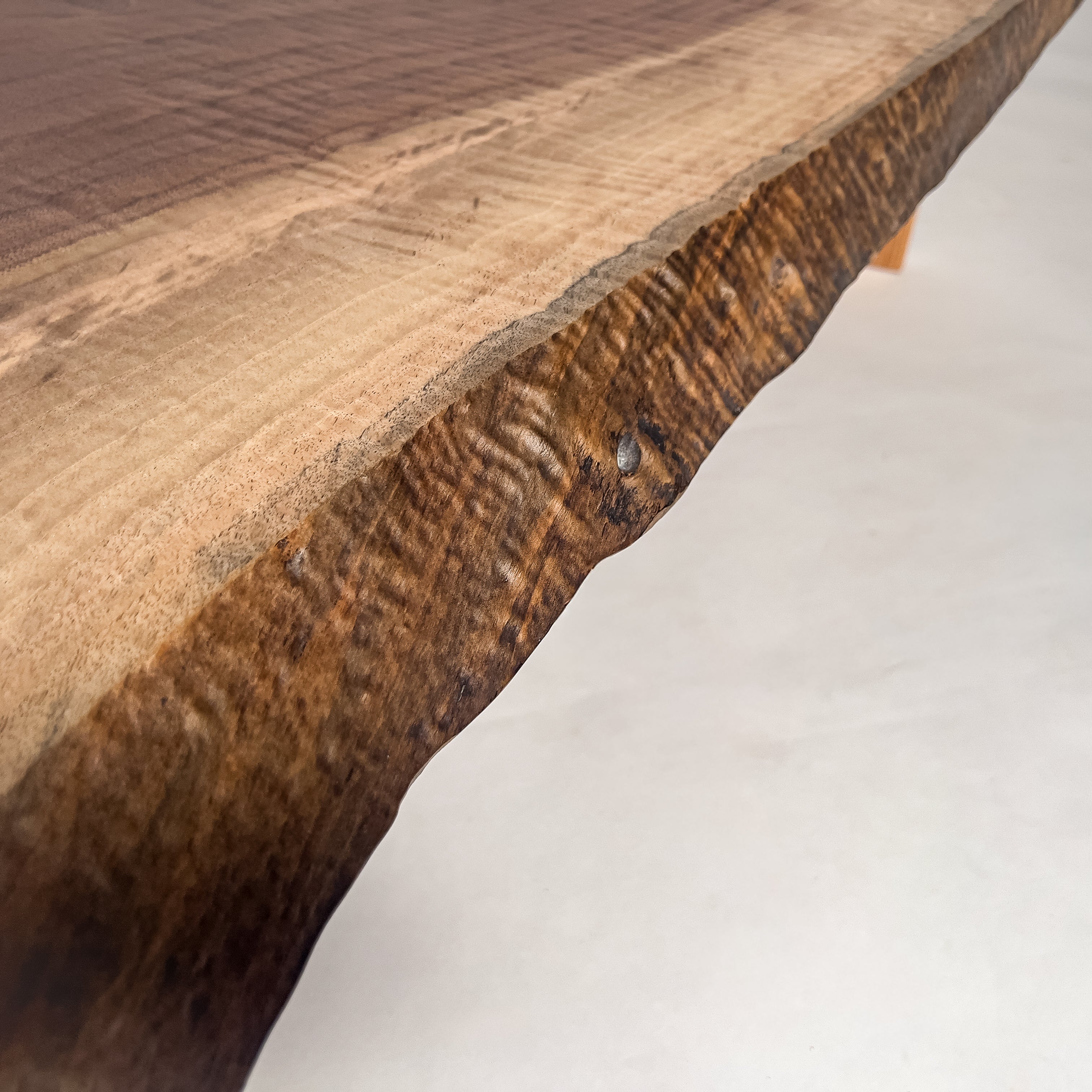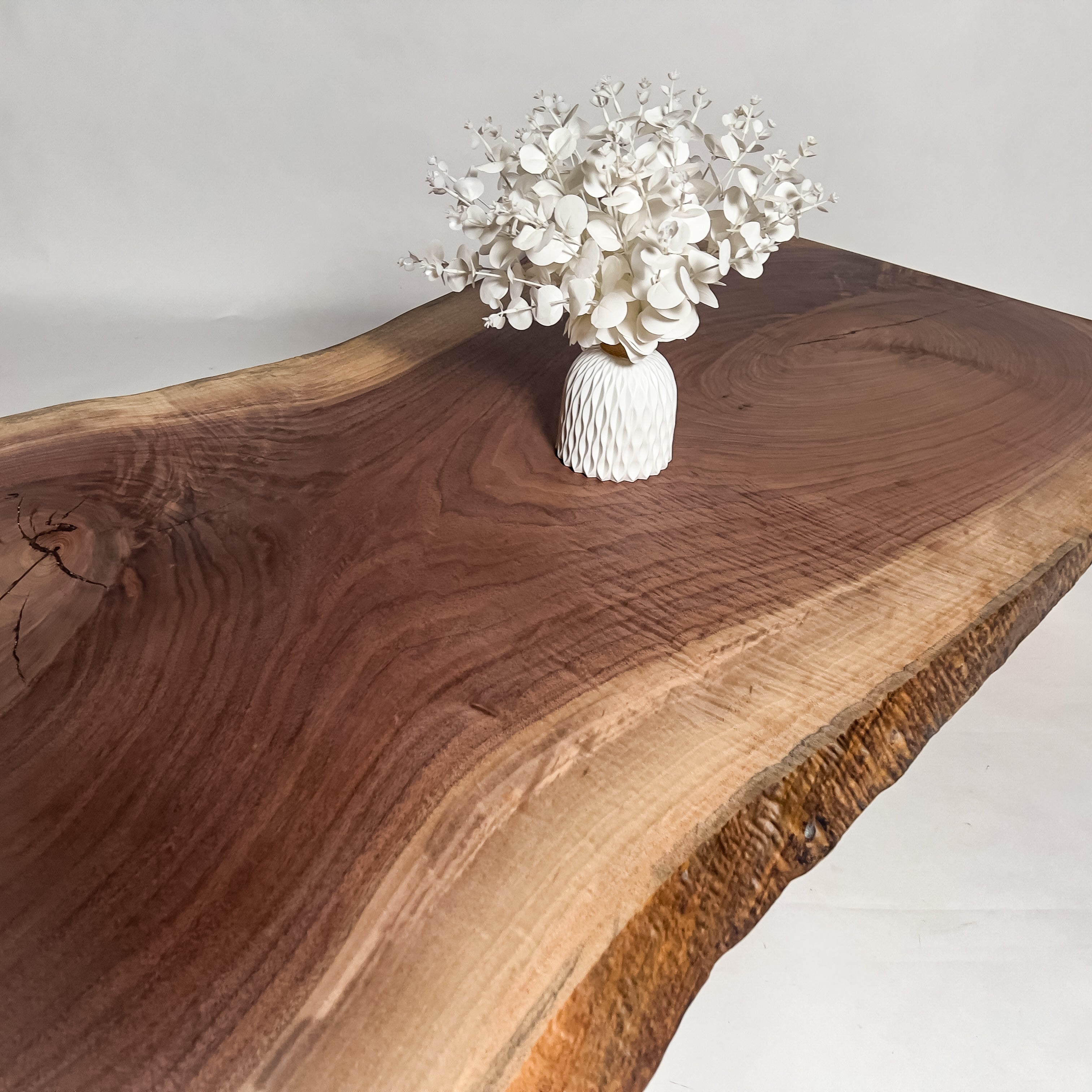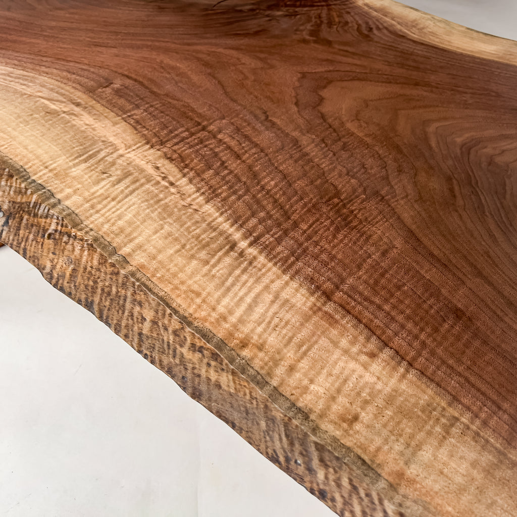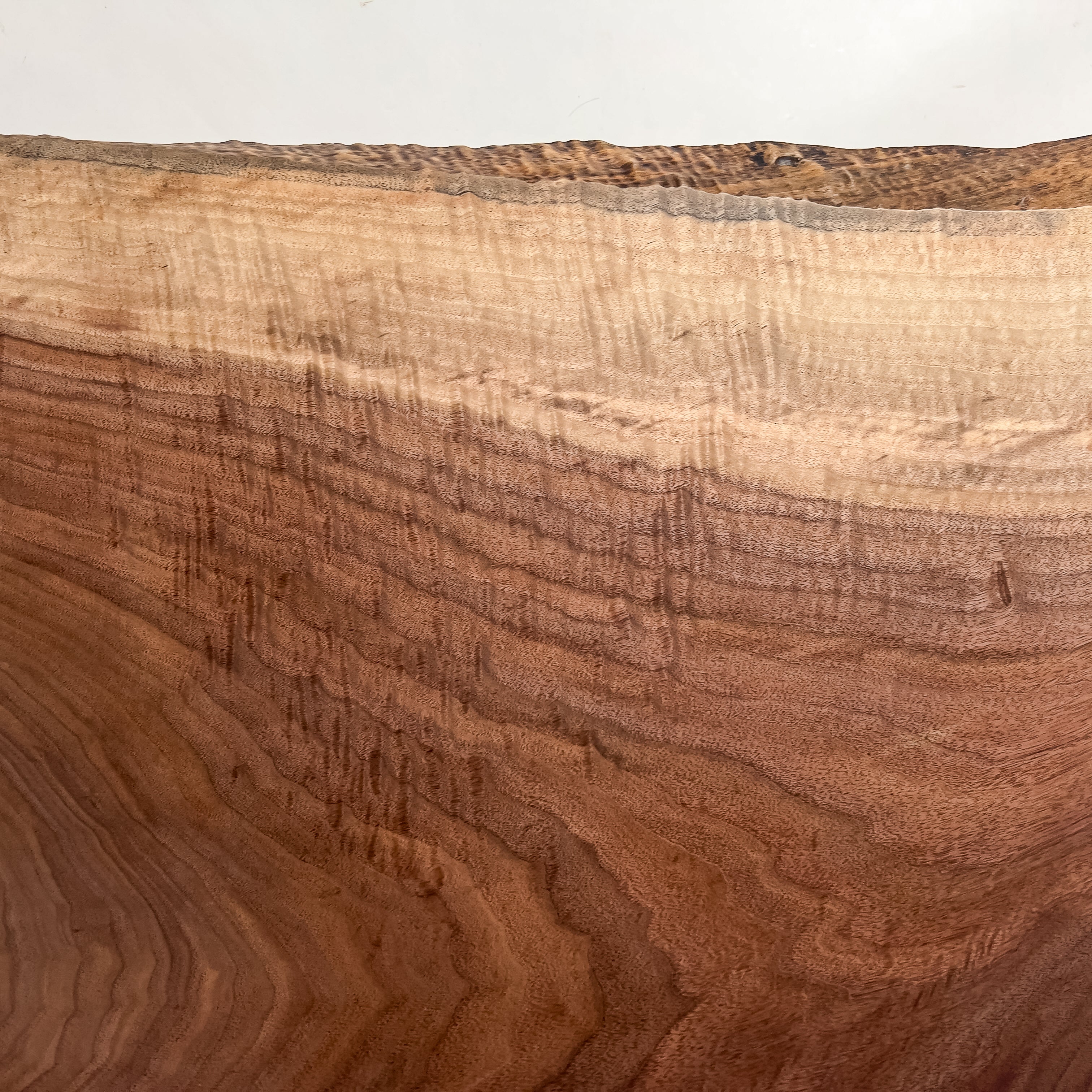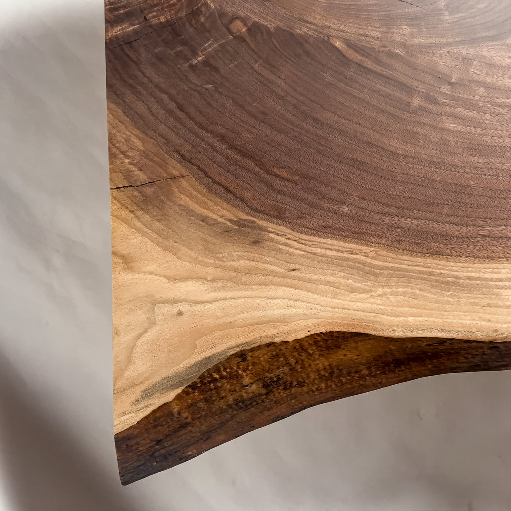 幾重にも重なる年輪が穏やかな波を描くウォールナット。長い歳月を生き抜いた木が、豊かな表情と深みのある色を纏いました。職人が木の鼓動を残すように磨き上げ、自然の力強さと温もりが調和する一枚に仕上げています。