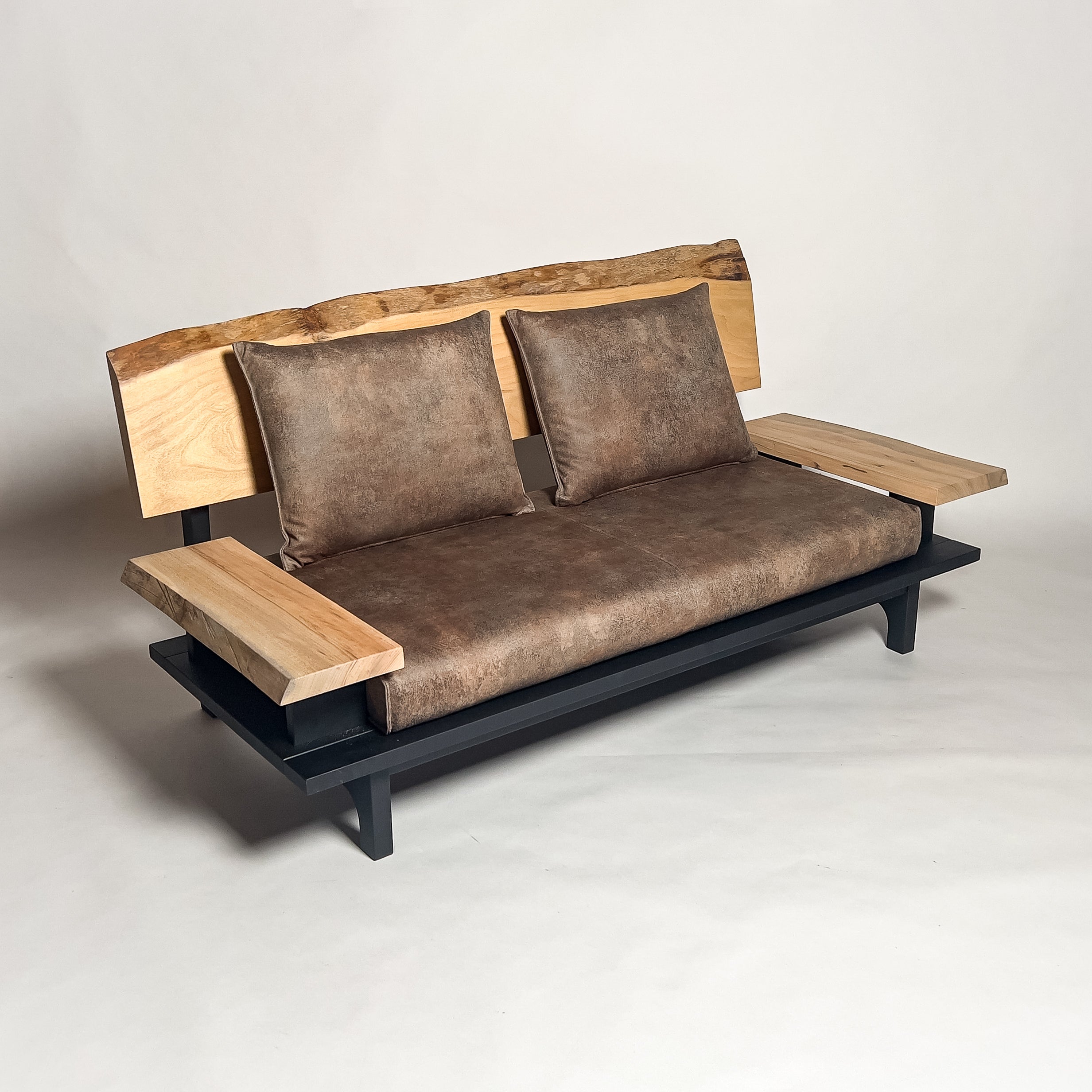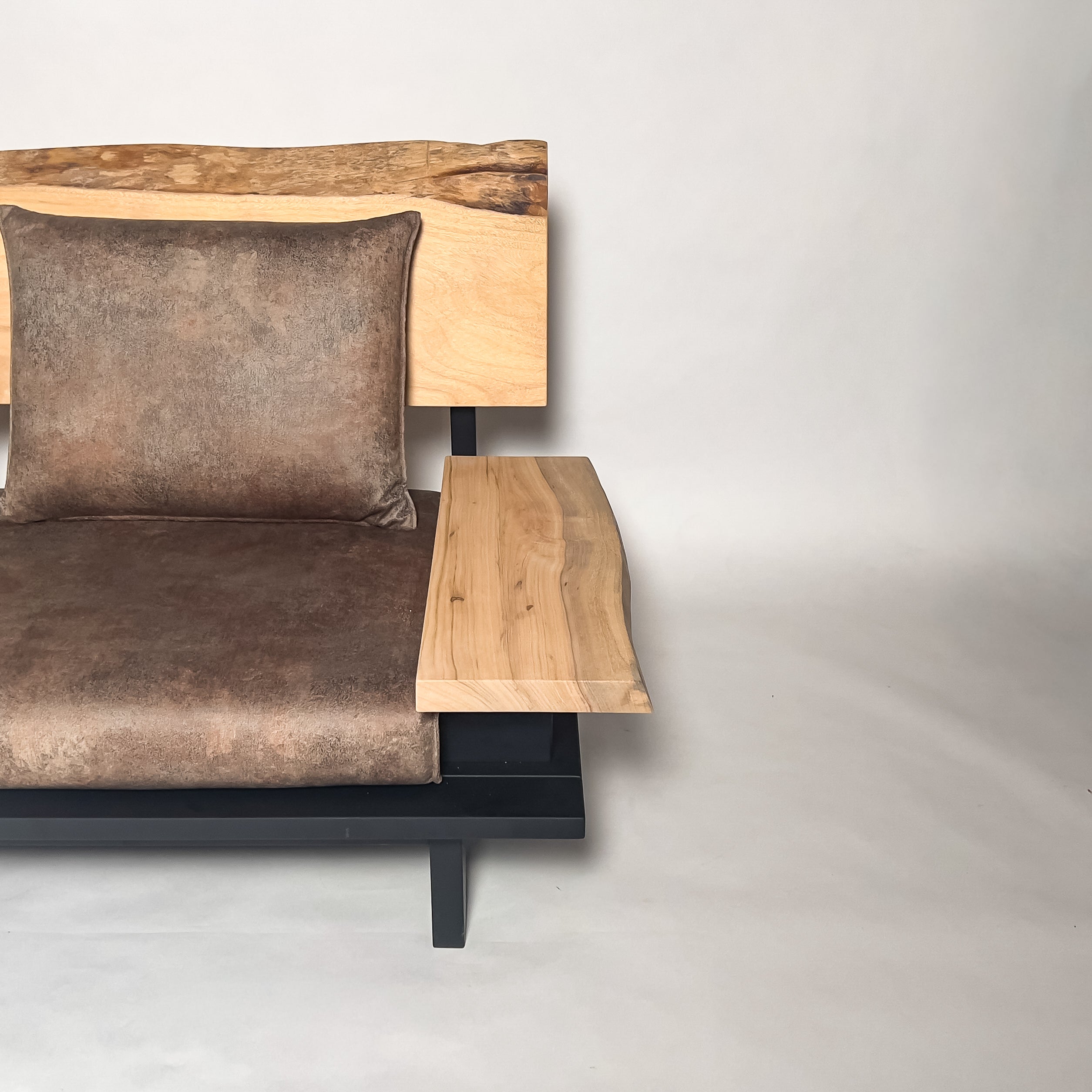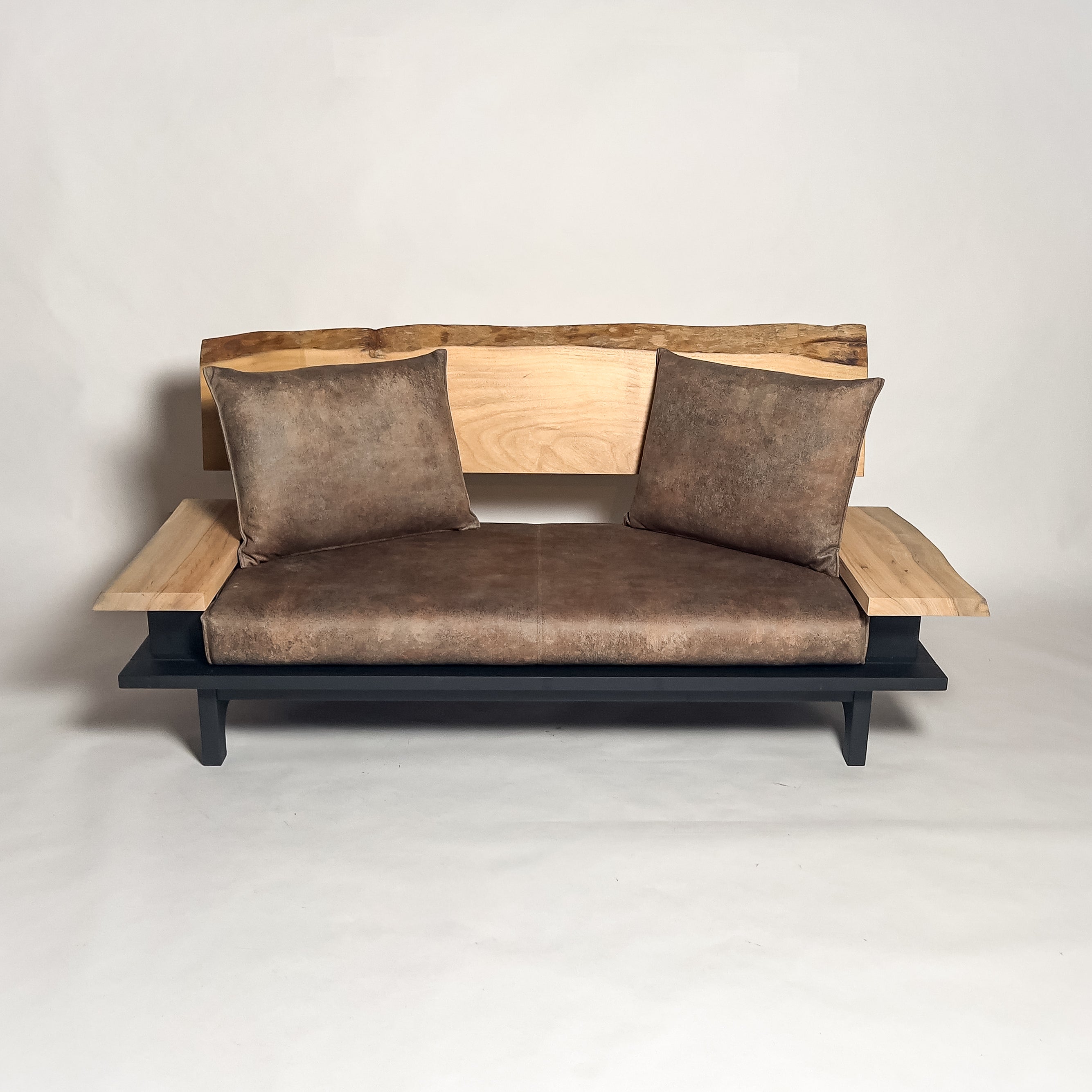 肘置き・背もたれに一枚板をあしらい、空間全体を洗練された雰囲気で包み込む2人掛けソファ。造形の美しさと素材感が空間を格調高く彩ります。さらに、緻密に設計されたクッションが身体をやさしく支え、長時間でも心地よく寛げる使いやすさを実現しました。