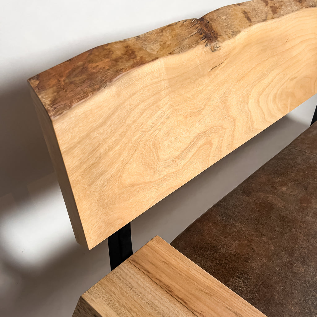 楠の一枚板を背もたれと肘置きに使用した天然木ソファです。穏やかな色合いと木目の流れが上品に映え、自然の躍動を残した造りが空間に温かさと心地よさを添え、上質な寛ぎのひとときを静かに演出します。