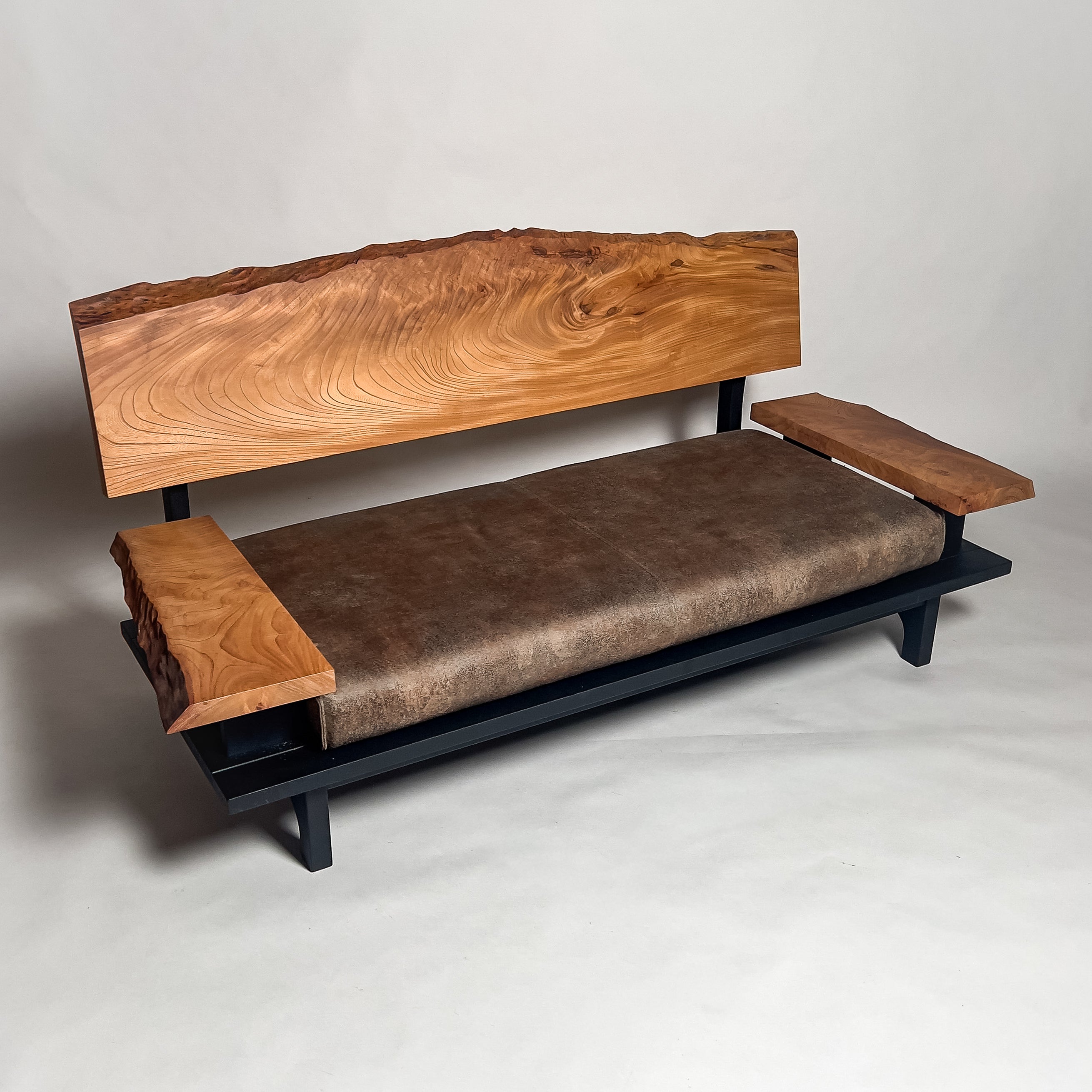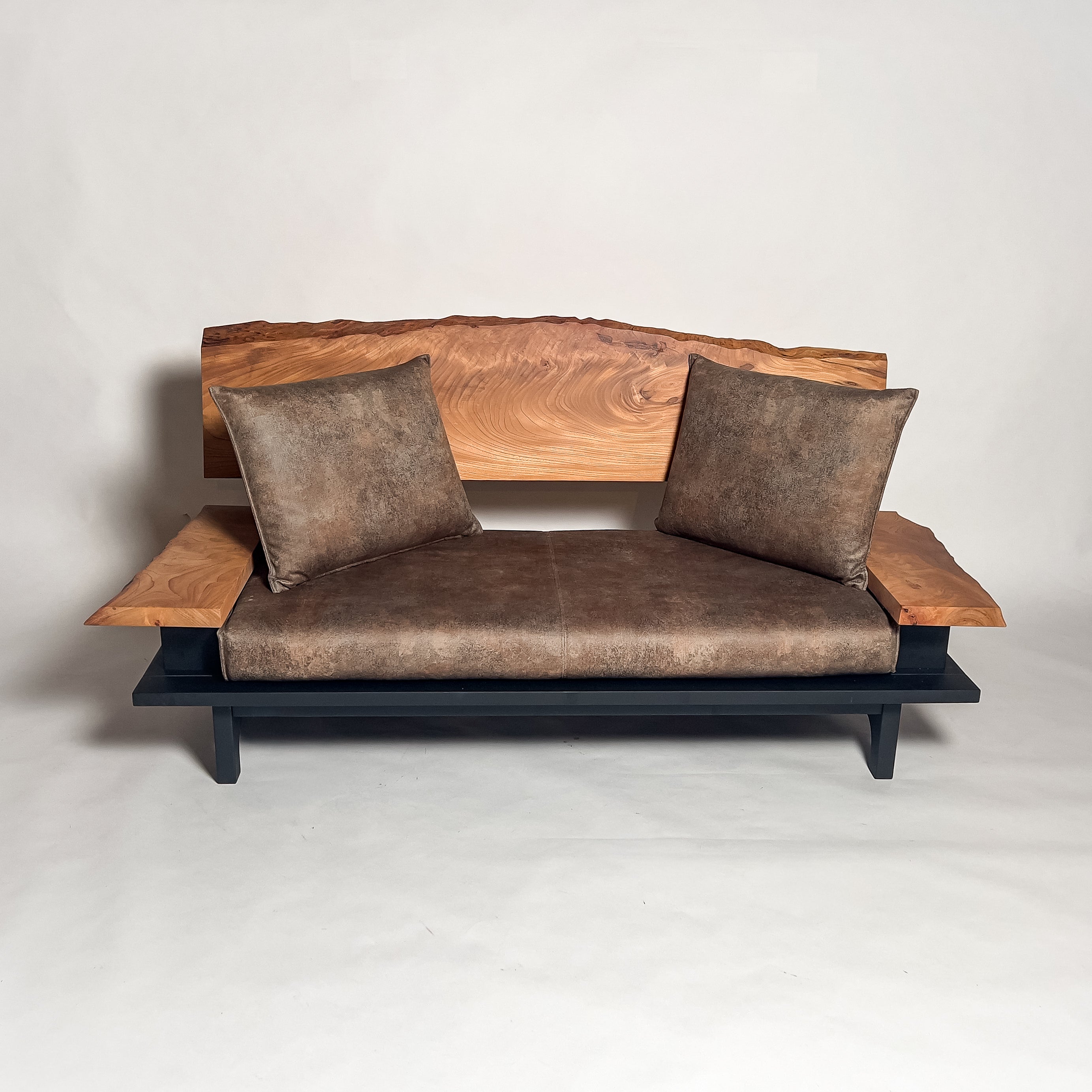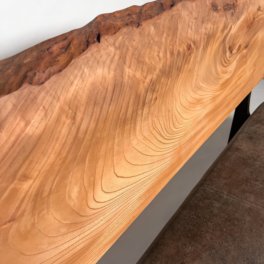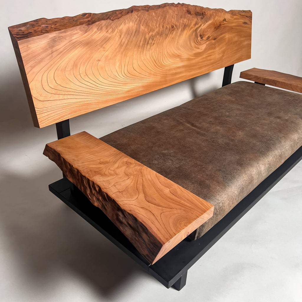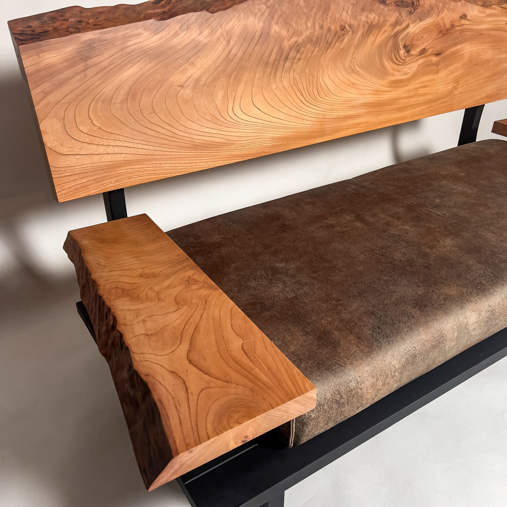 欅の一枚板を背と肘置きに用いた天然木ソファです。力強い木目が生み出す波紋のような表情は、空間に静かな存在感を添えます。直線的なフレームに映える自然の躍動を残し、寛ぎと美しさを兼ね備えた上品な仕上がりです。