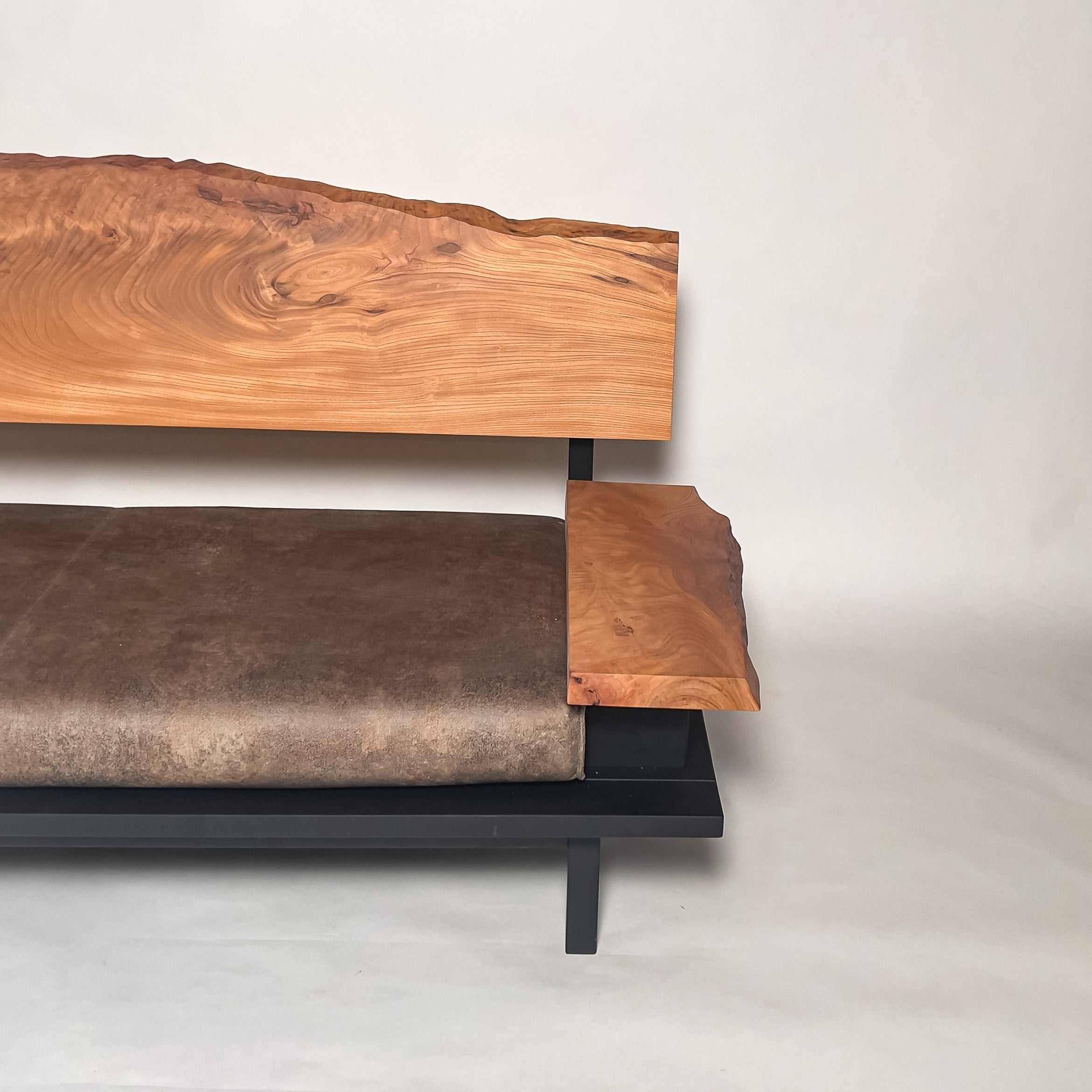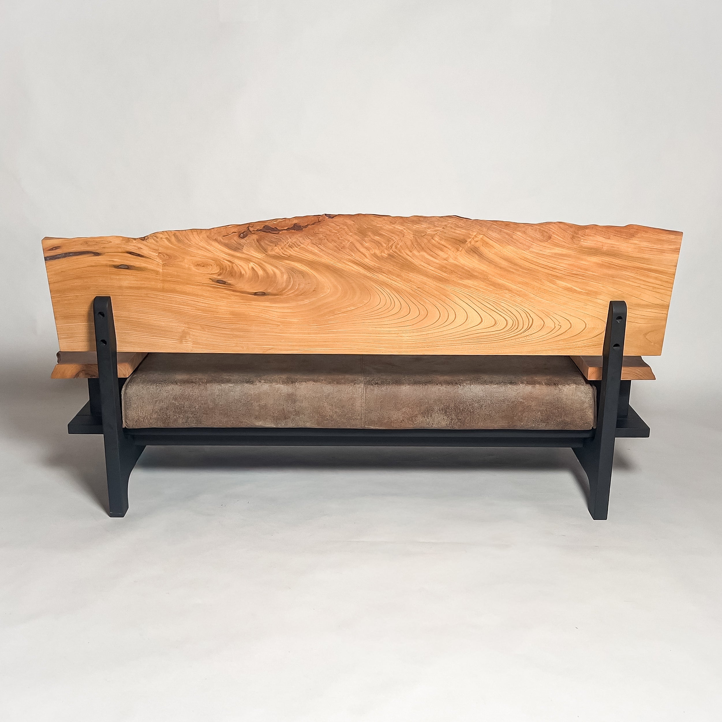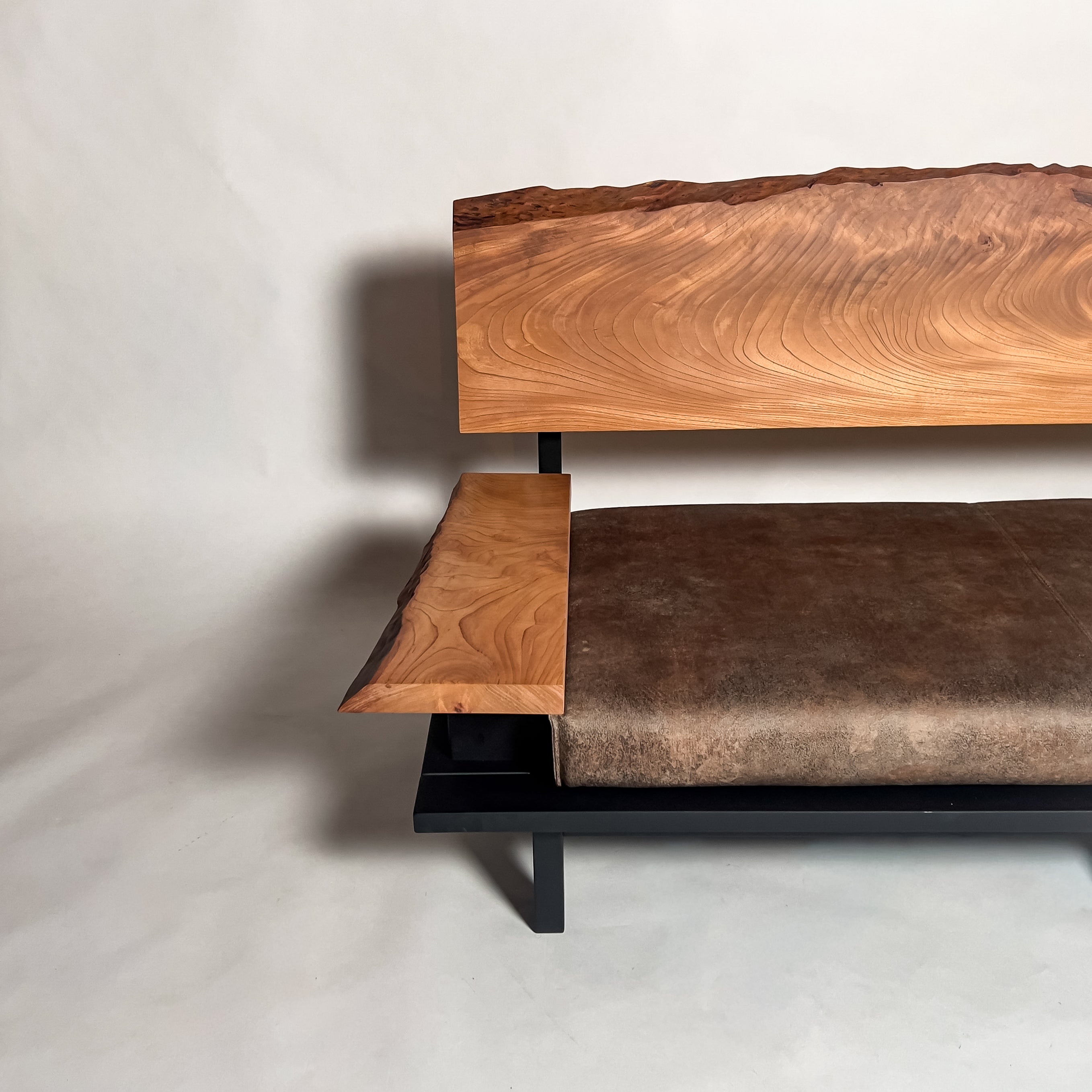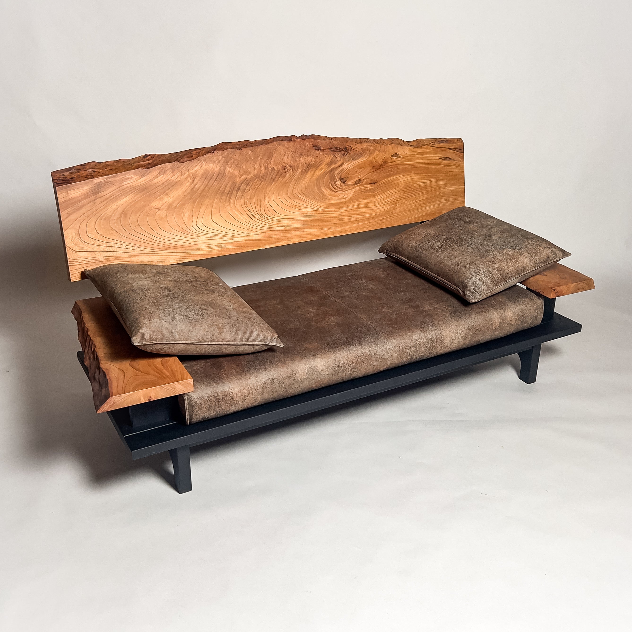 欅の一枚板を背と肘置きに用いた天然木ソファです。力強い木目が生み出す波紋のような表情は、空間に静かな存在感を添えます。直線的なフレームに映える自然の躍動を残し、寛ぎと美しさを兼ね備えた上品な仕上がりです。