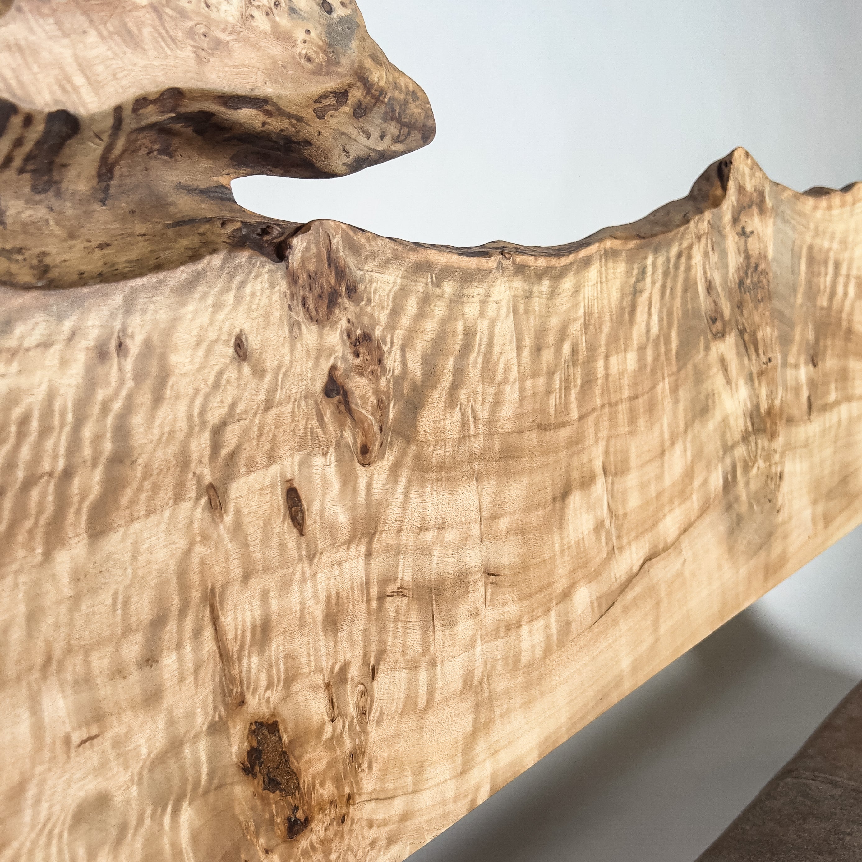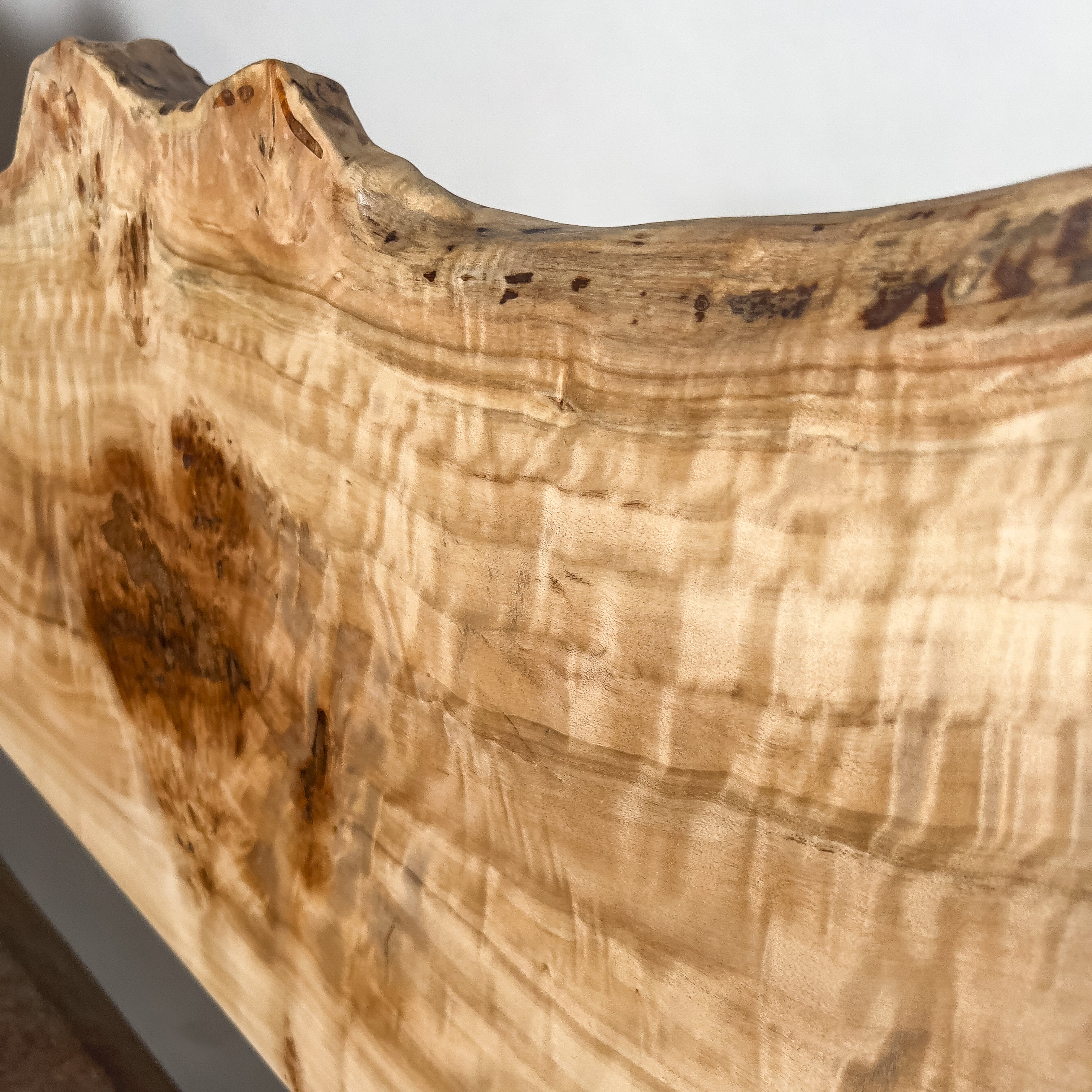 仕上がりの質感や印象にまで細やかに気を配り、使われる空間や暮らしを見据えた、やわらかな佇まいへと丁寧に仕上げる。 木が持つ節や皮、杢目の表情に寄り添い、その一つひとつを活かすことで、唯一無二の素材美を際立たせた一枚板づくりを行う。