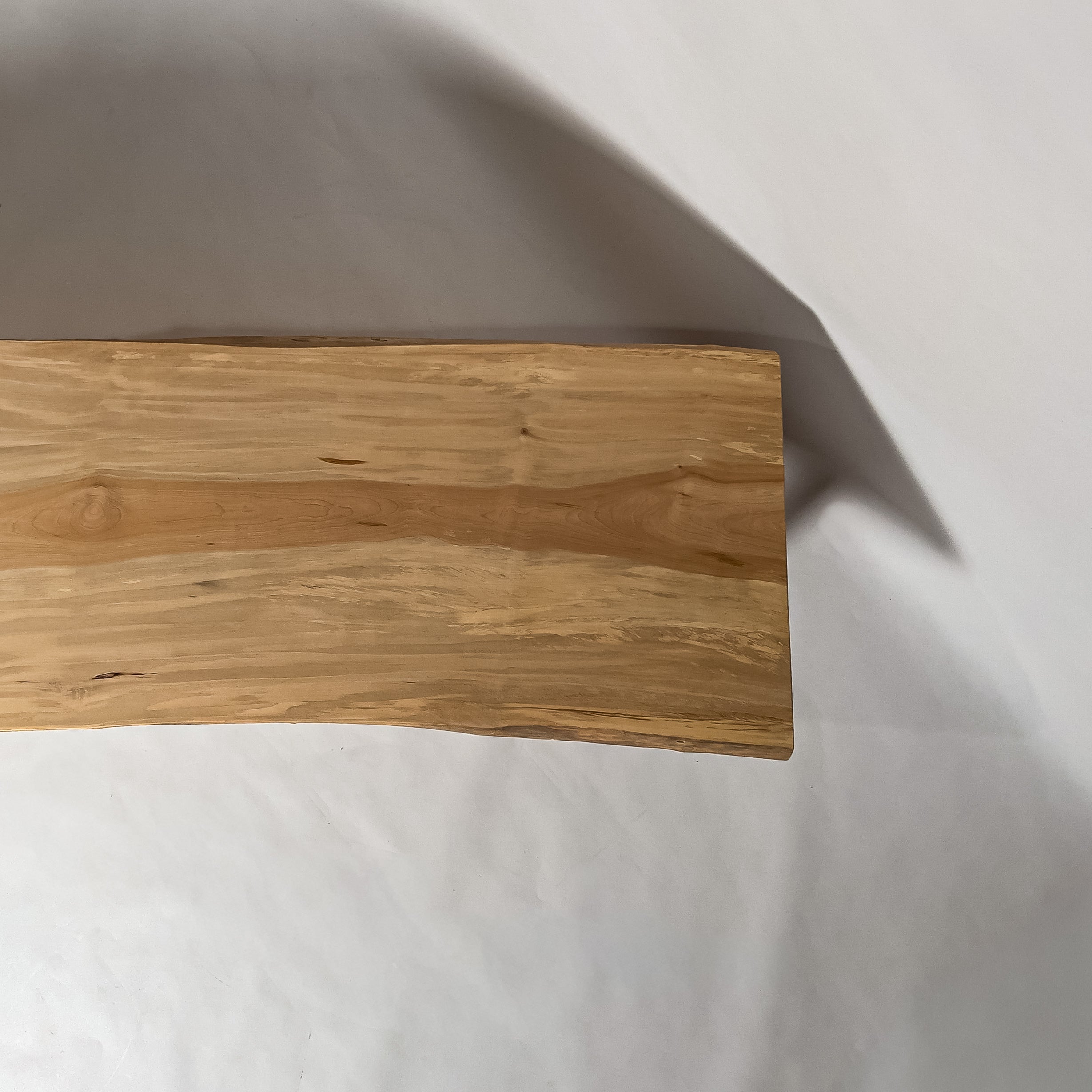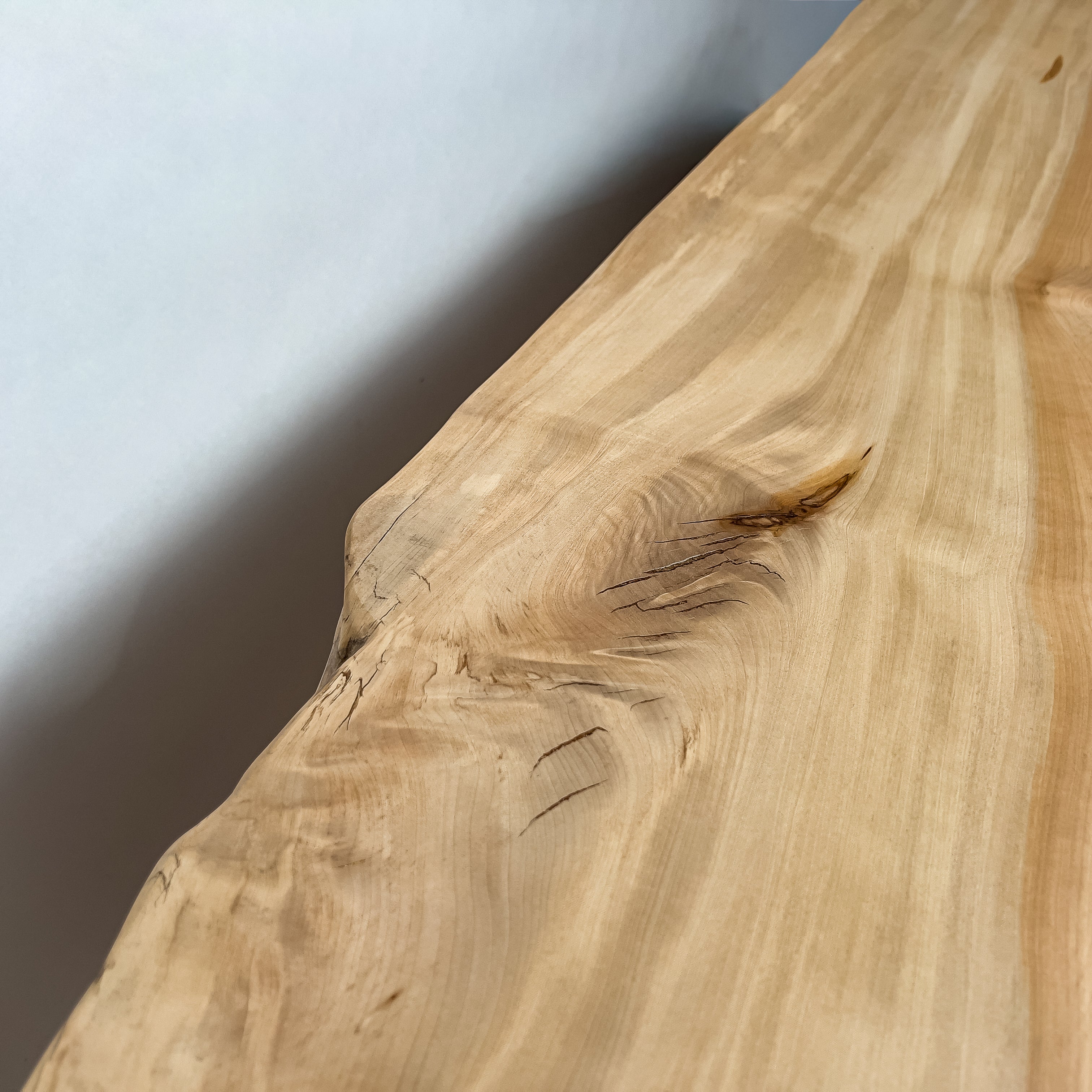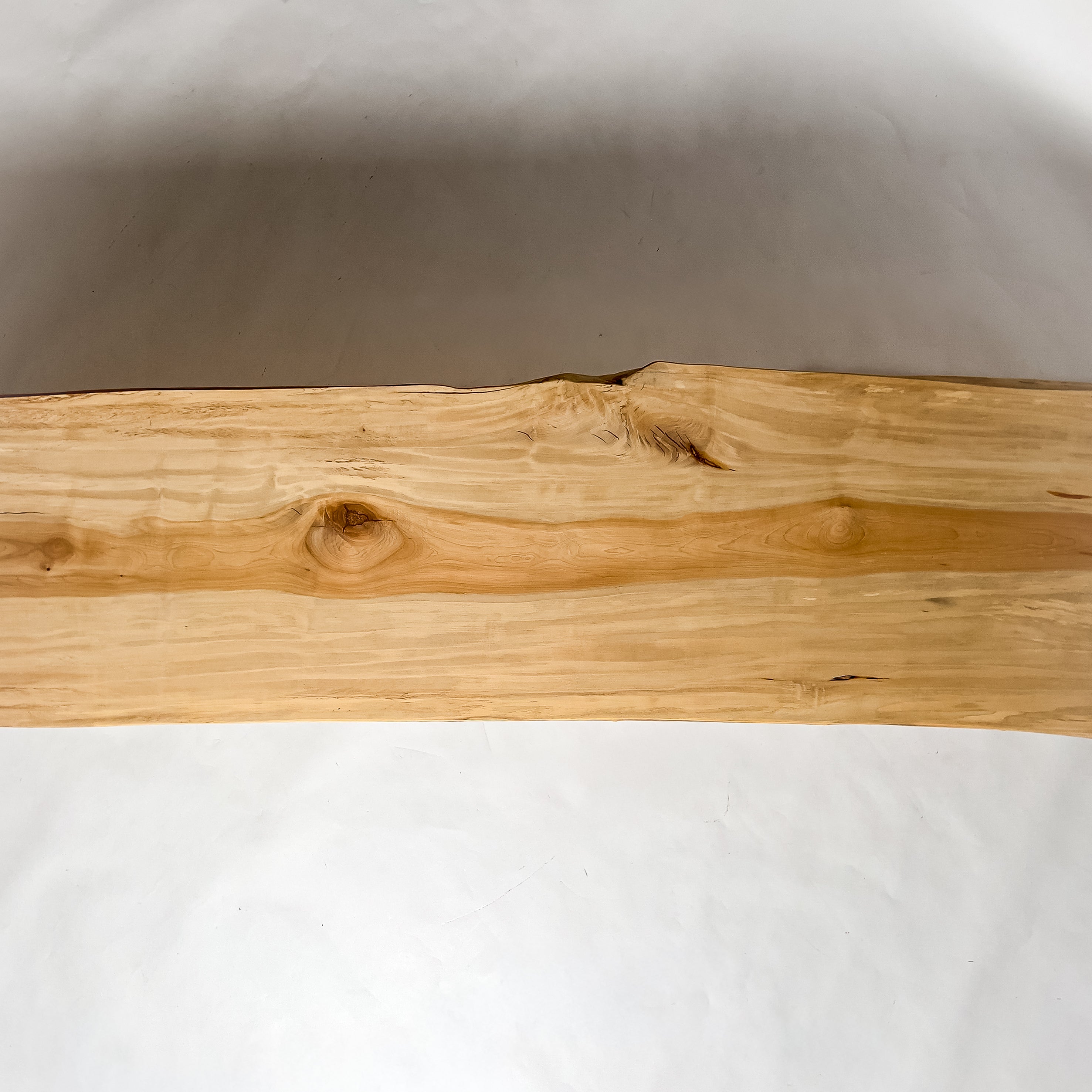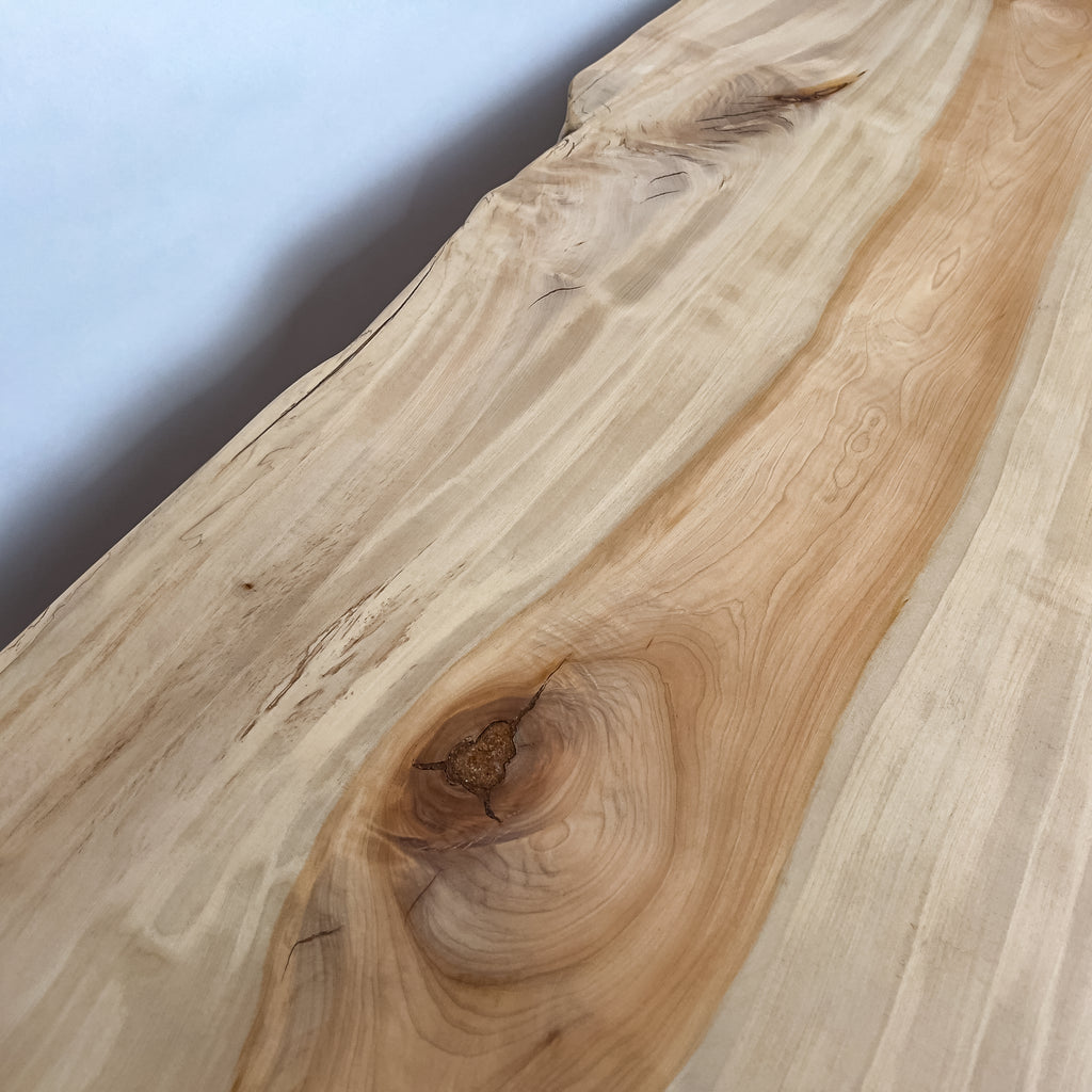 淡い乳白色に蜂蜜色が走り、年輪は穏やかに連なります。成長期の揺らぎが生んだ縮み杢が面に静かな奥行きを添え、山で伸びた時間を映す表情。躍動を残した仕上げ、空間に柔らかな光を落とします。