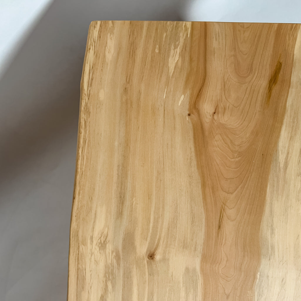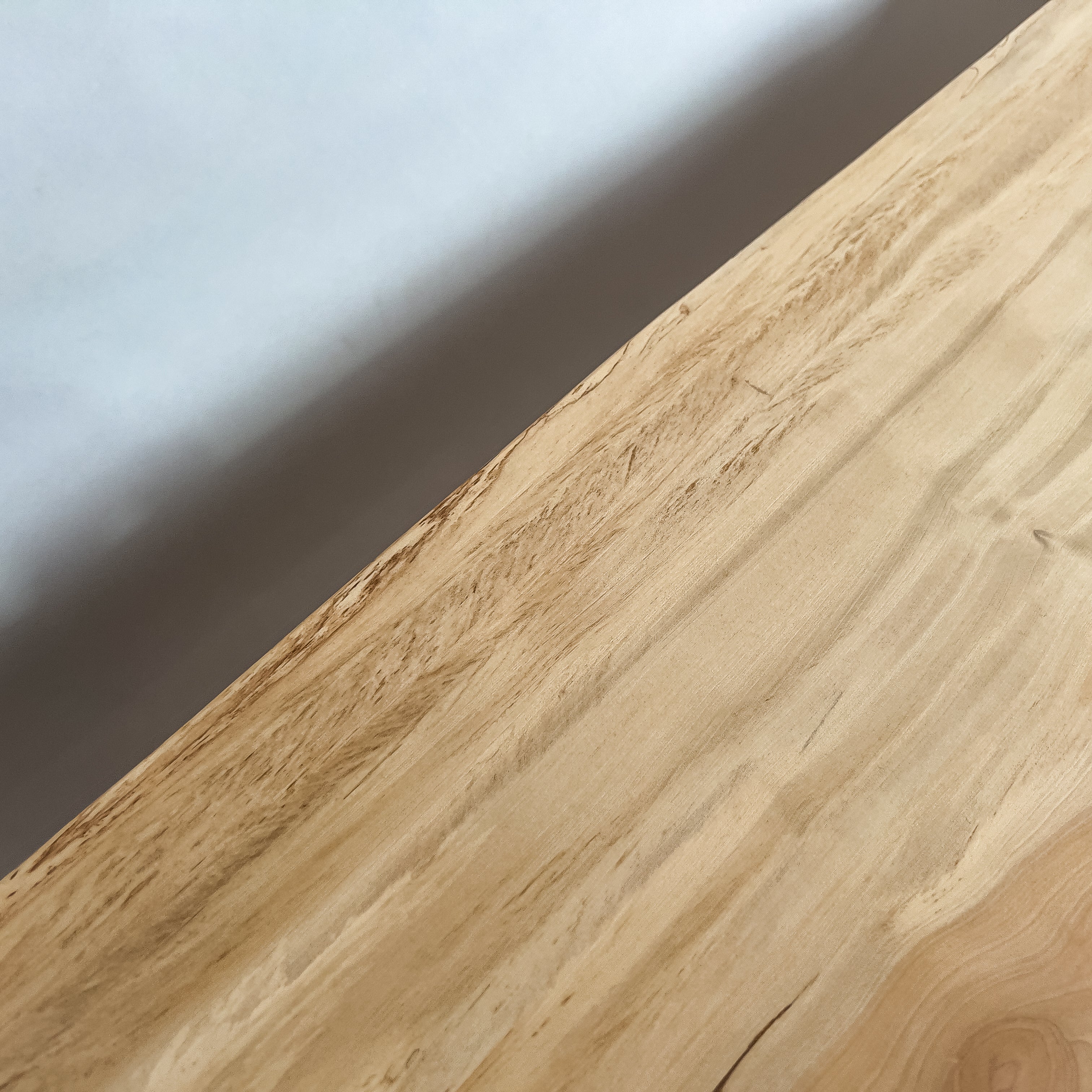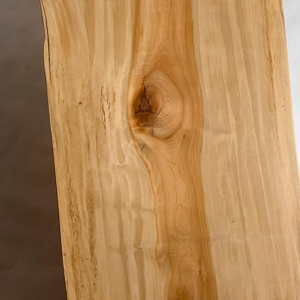 淡い乳白色に蜂蜜色が走り、年輪は穏やかに連なります。成長期の揺らぎが生んだ縮み杢が面に静かな奥行きを添え、山で伸びた時間を映す表情。躍動を残した仕上げ、空間に柔らかな光を落とします。