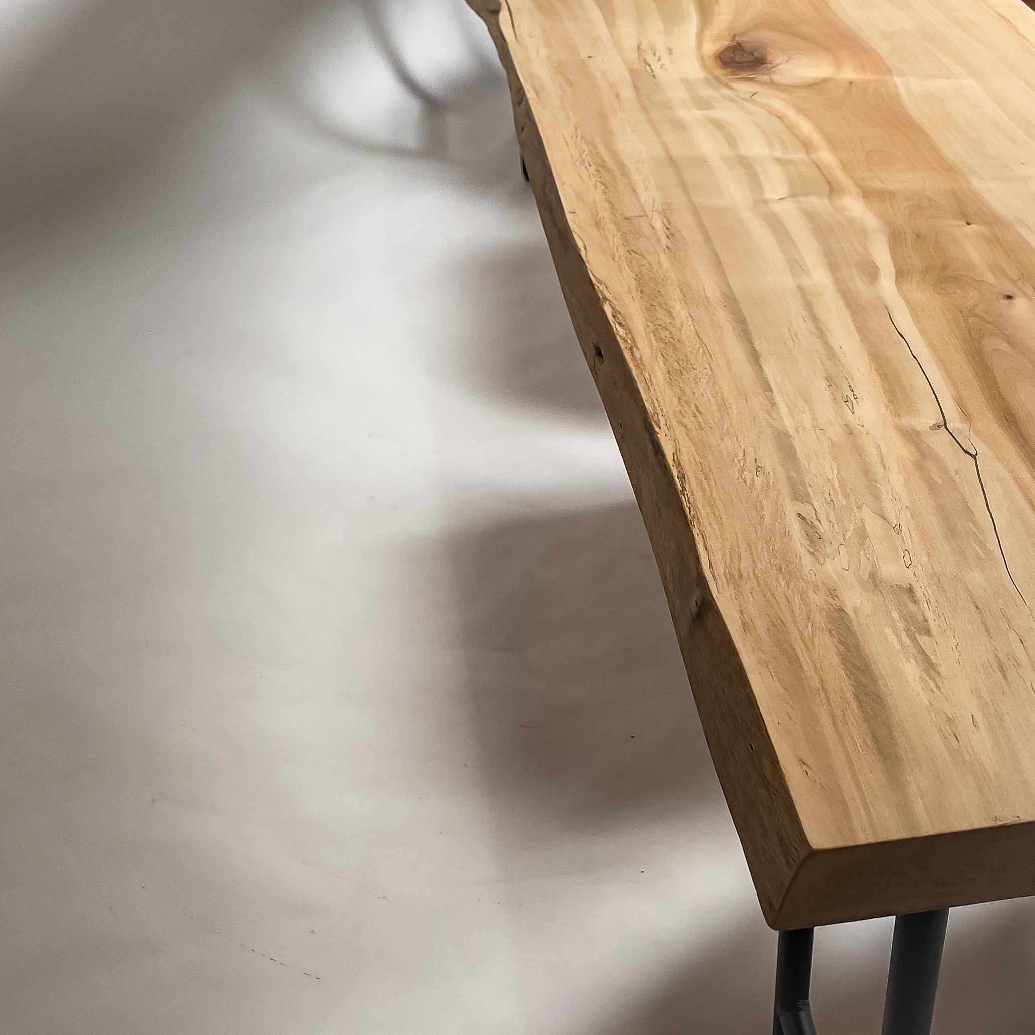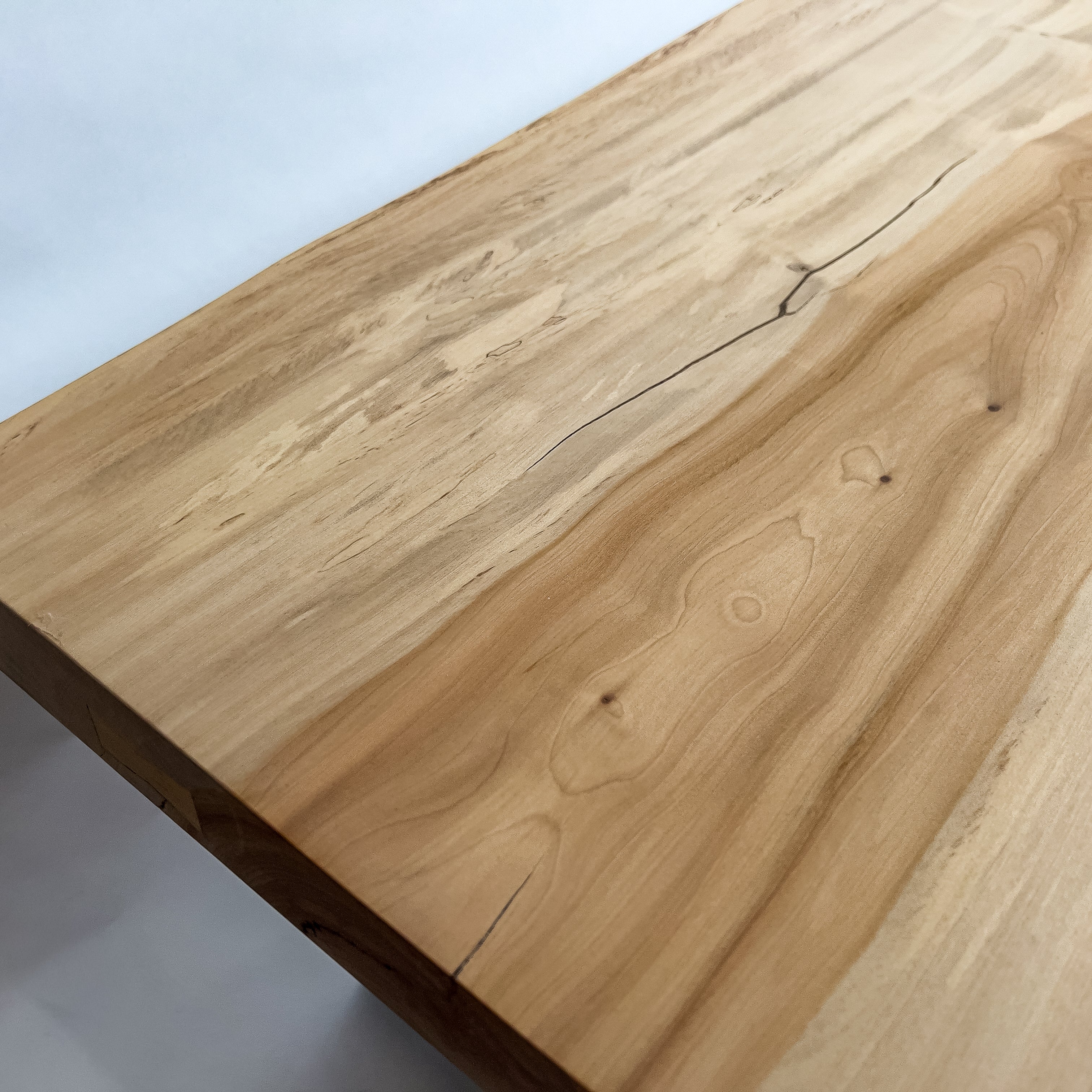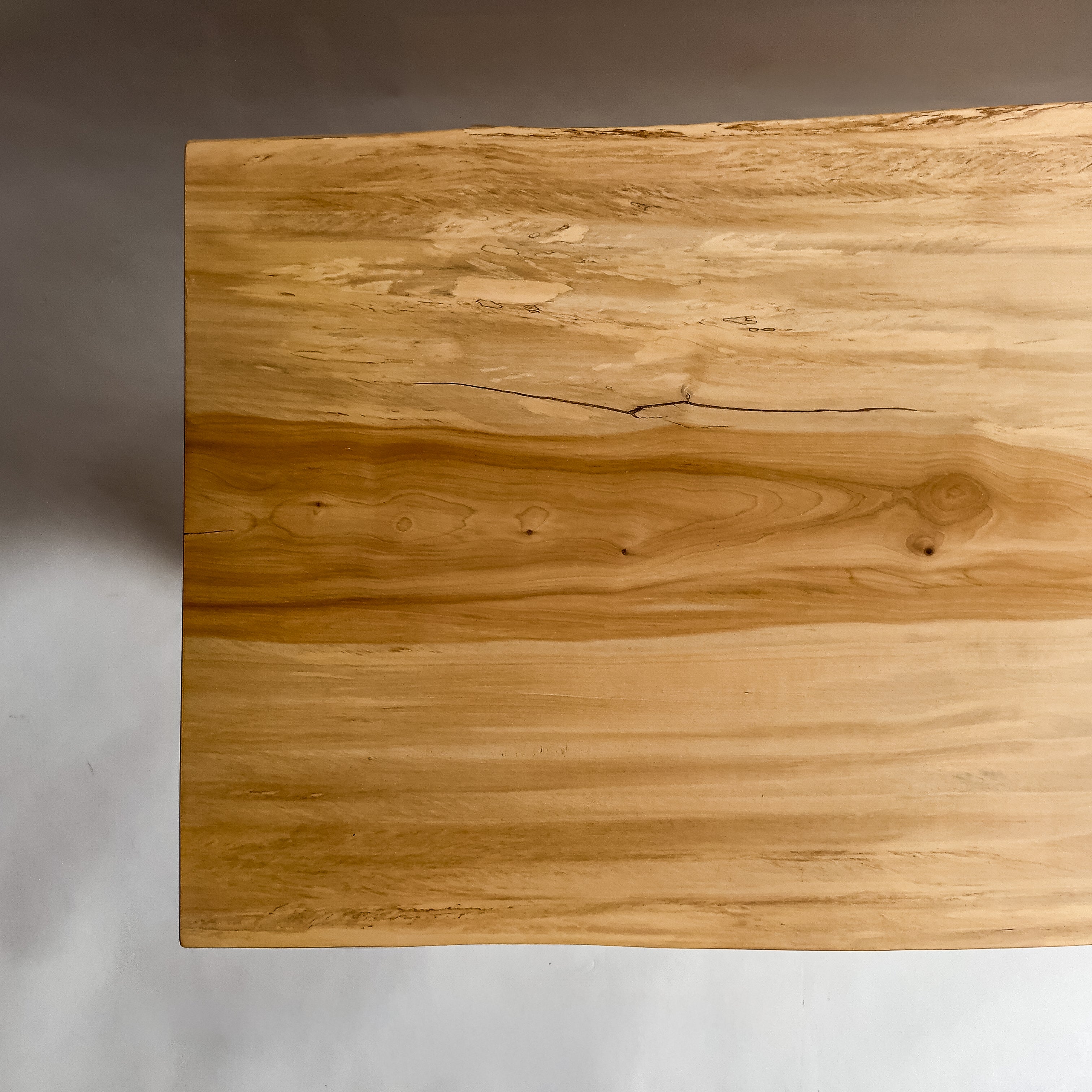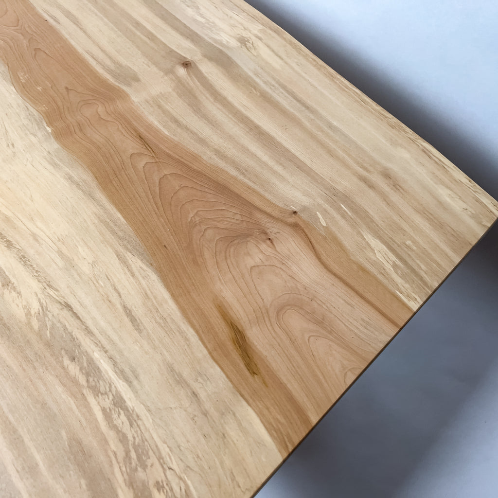淡い乳白色に蜂蜜色が走り、年輪は穏やかに連なります。成長期の揺らぎが生んだ縮み杢が面に静かな奥行きを添え、山で伸びた時間を映す表情。躍動を残した仕上げ、空間に柔らかな光を落とします。
