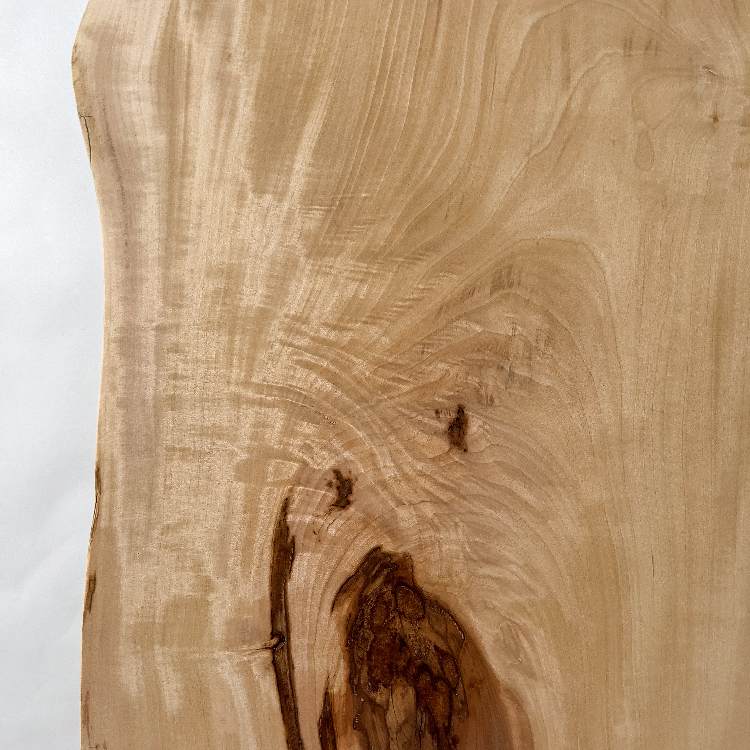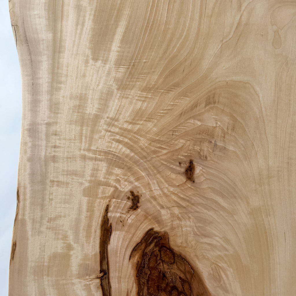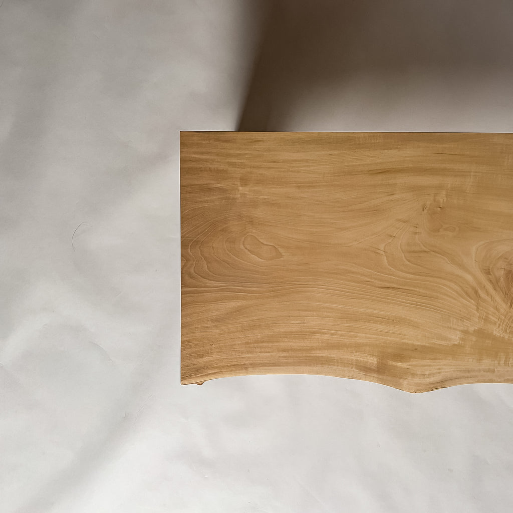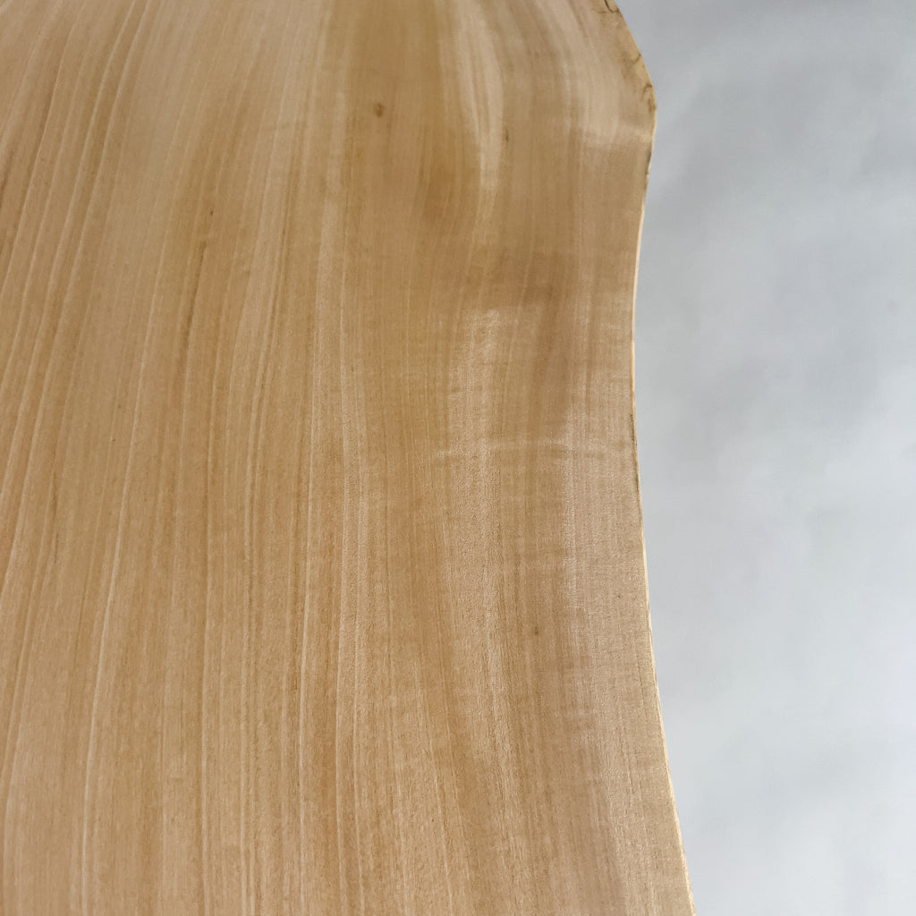 山の寒暖差の中で育った栃は、ゆっくりと年輪を重ね、縮み杢の揺らぎを宿します。色味はやさしく、光を含む木目が水面のように広がります。躍動を削ぎ落とさず、耳の動きを残す仕上げ。暮らしに静かな温度を添える一枚です。