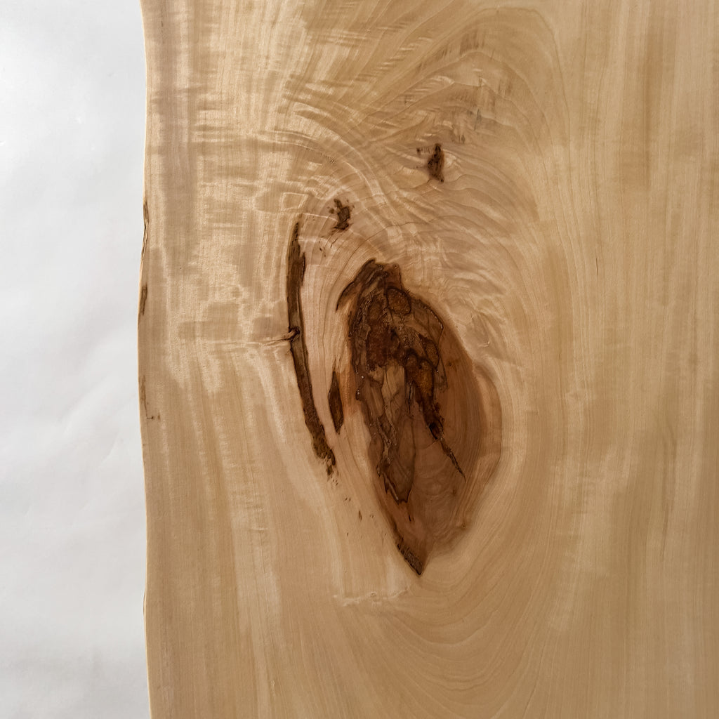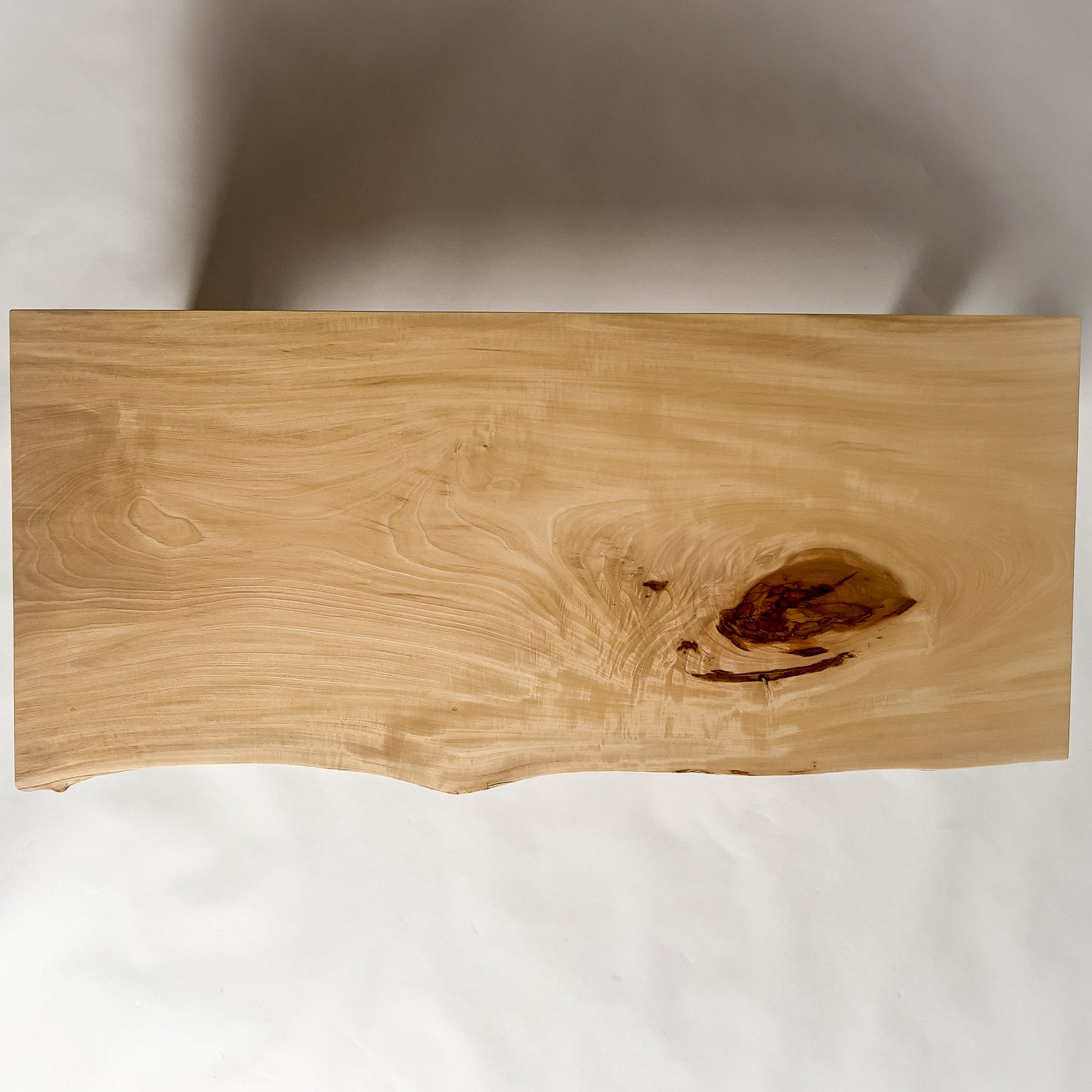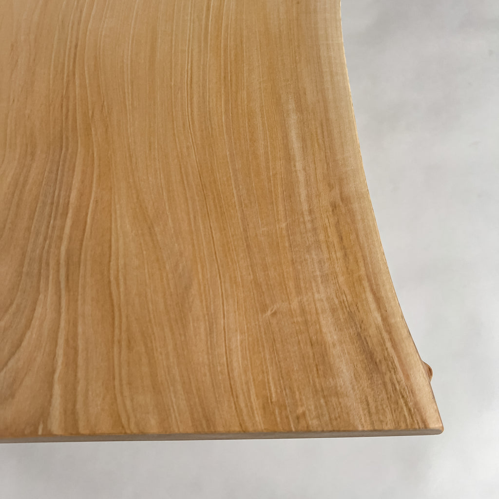 山の寒暖差の中で育った栃は、ゆっくりと年輪を重ね、縮み杢の揺らぎを宿します。色味はやさしく、光を含む木目が水面のように広がります。躍動を削ぎ落とさず、耳の動きを残す仕上げ。暮らしに静かな温度を添える一枚です。