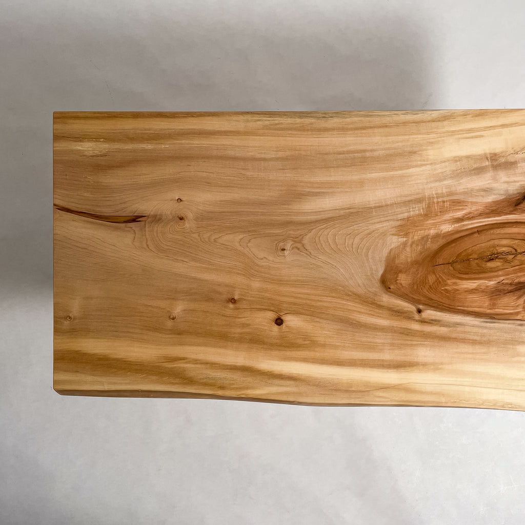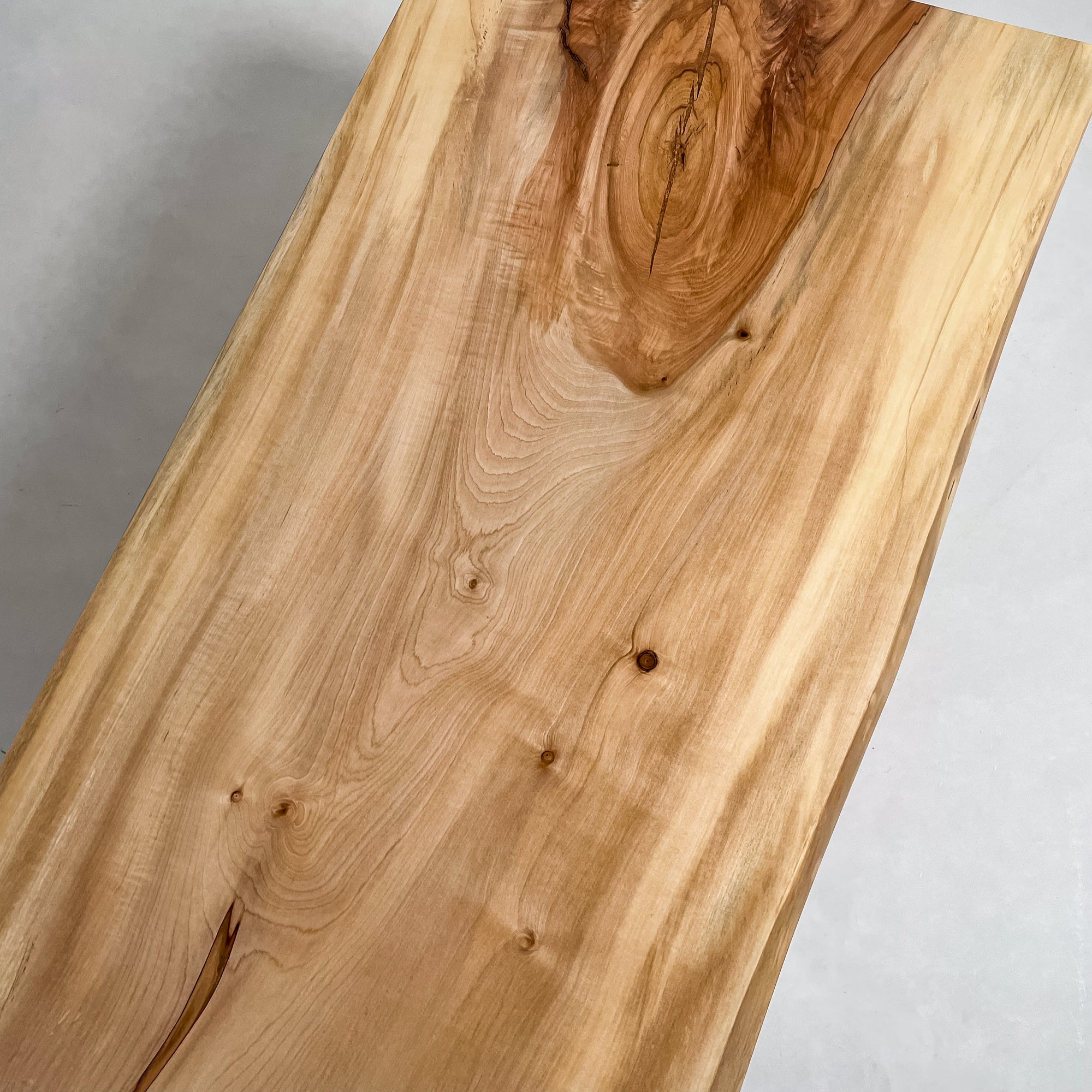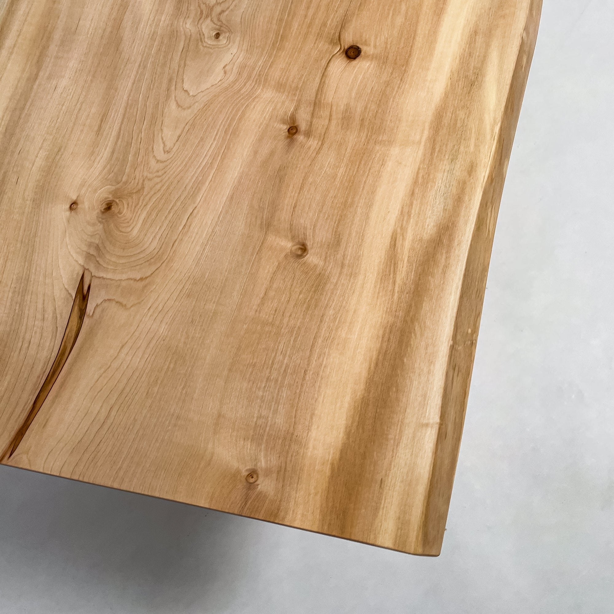 中央に向かってわずかに膨らむ輪郭と、右側に集まる濃色の杢が対比をつくり、軽やかな色味の中に動きが残る栃の一枚です。幅1100mmの扱いやすいサイズで、日常使いのテーブルとして空間に自然に収まります。