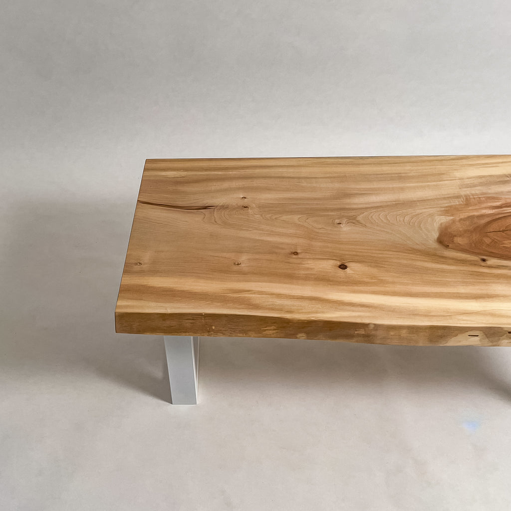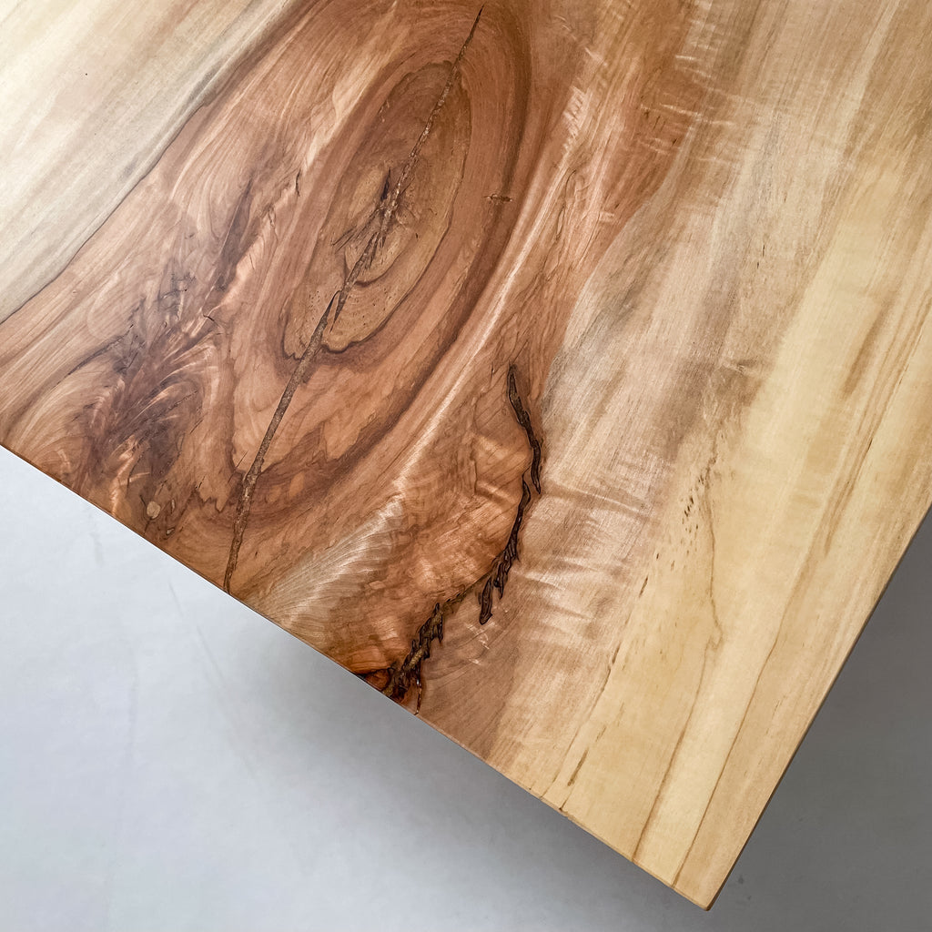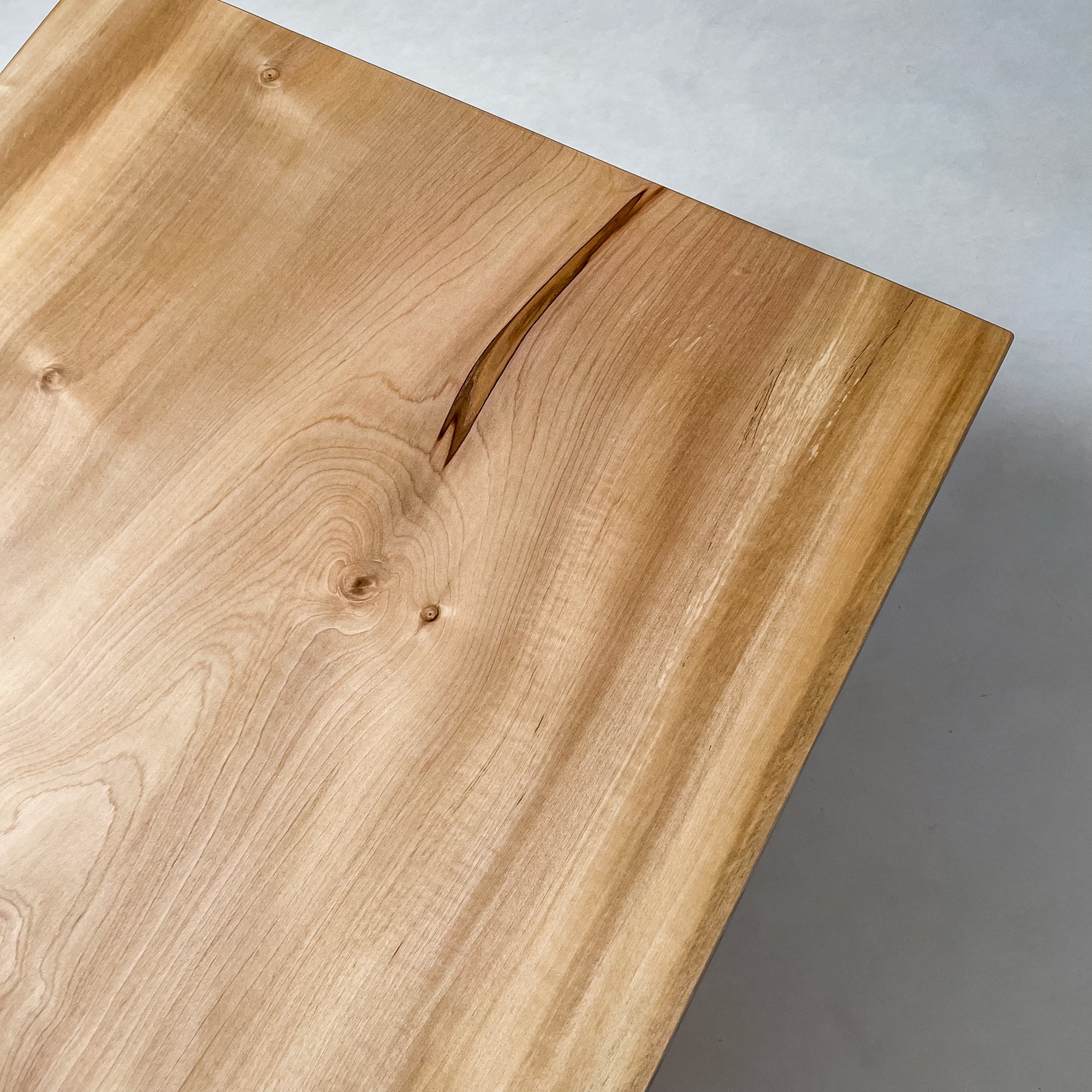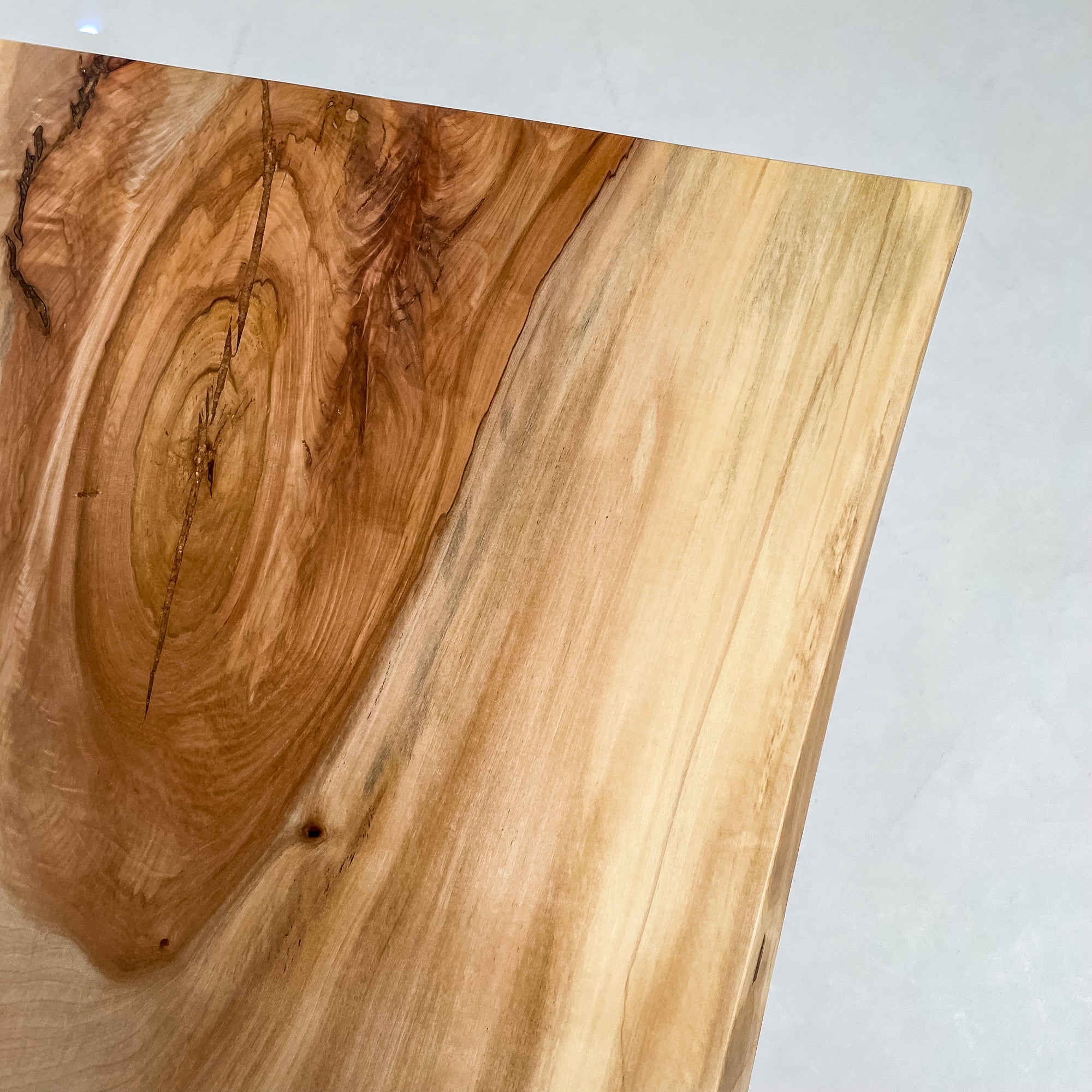 中央に向かってわずかに膨らむ輪郭と、右側に集まる濃色の杢が対比をつくり、軽やかな色味の中に動きが残る栃の一枚です。幅1100mmの扱いやすいサイズで、日常使いのテーブルとして空間に自然に収まります。