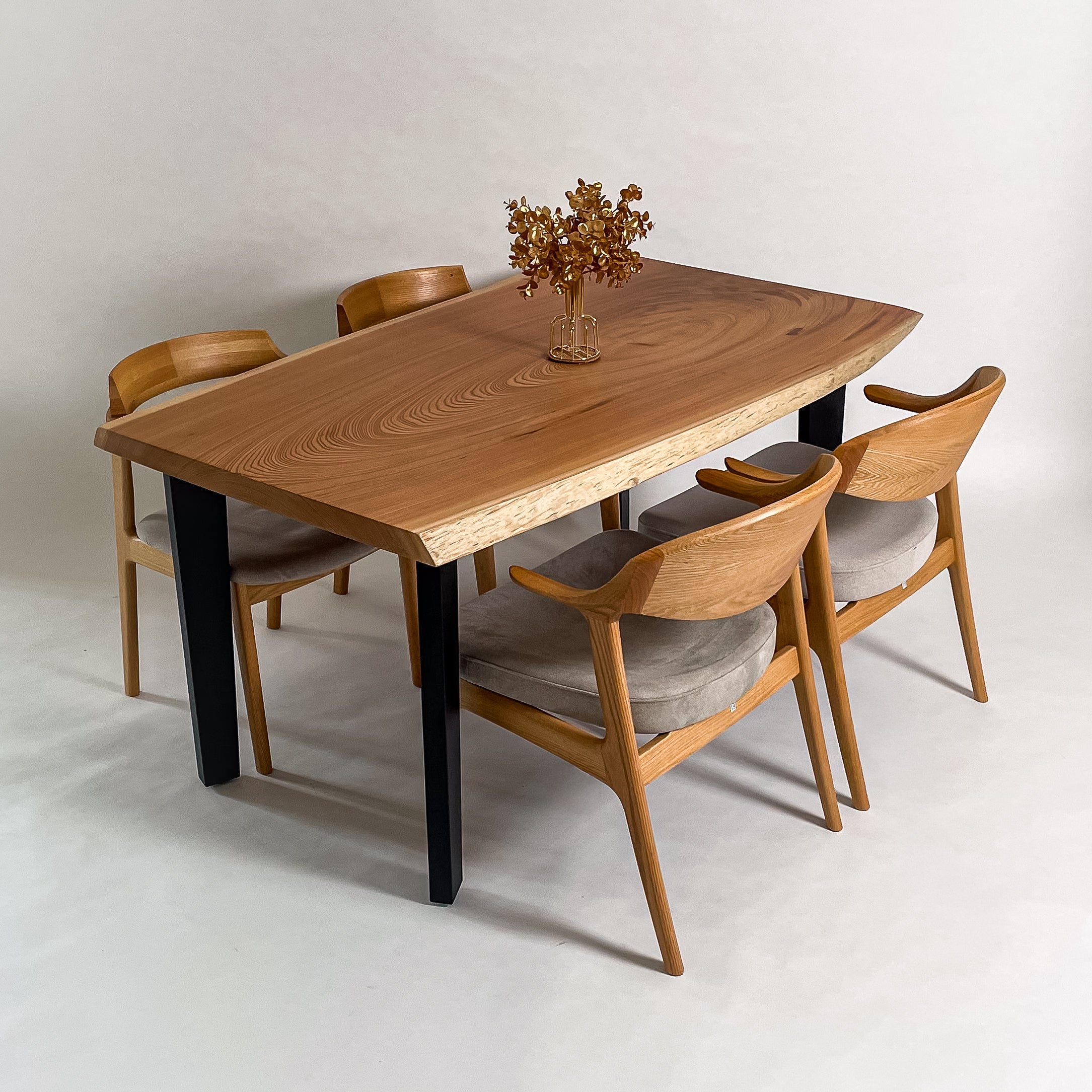 「際立つ」「美しい」という語源を持つほど美しい杢目が魅力。また、国産材最高峰の硬さ・耐久性能を持ち傷がつきにくい特徴を持つ欅は、テーブルに適した上質な素材。