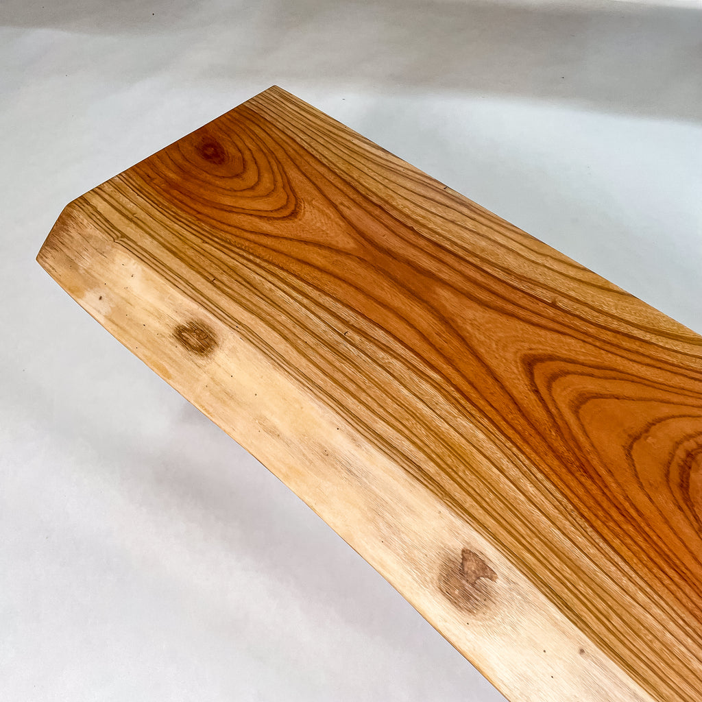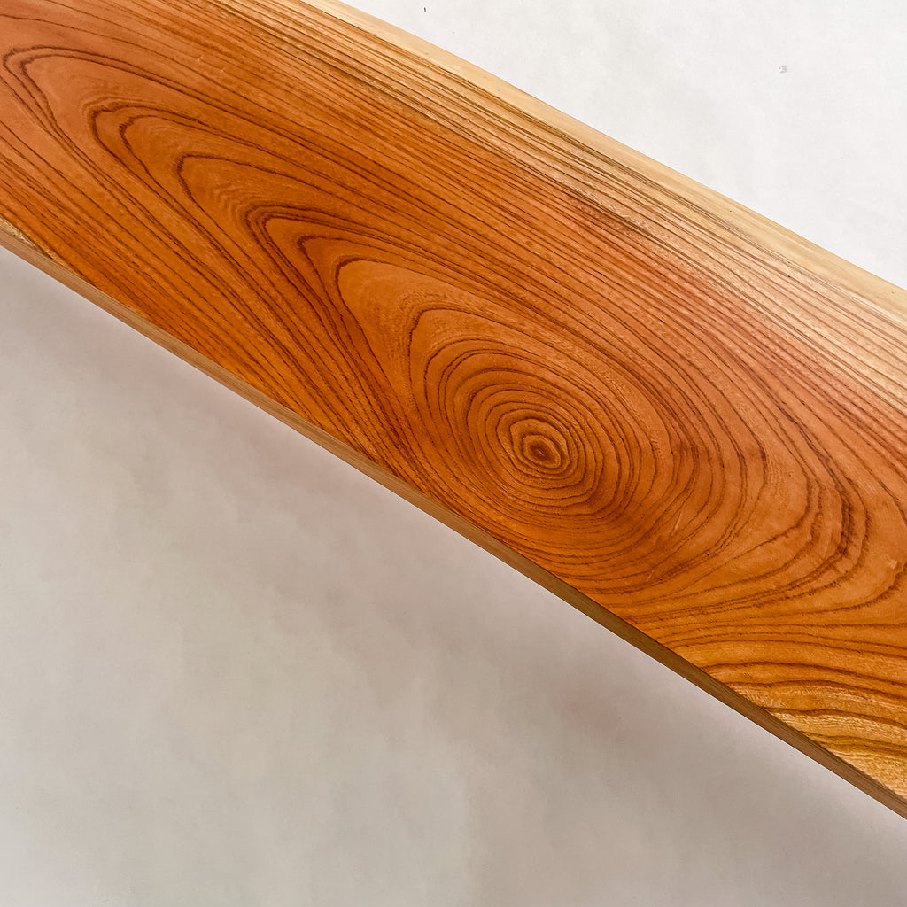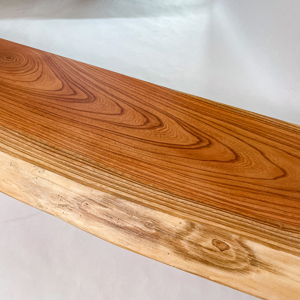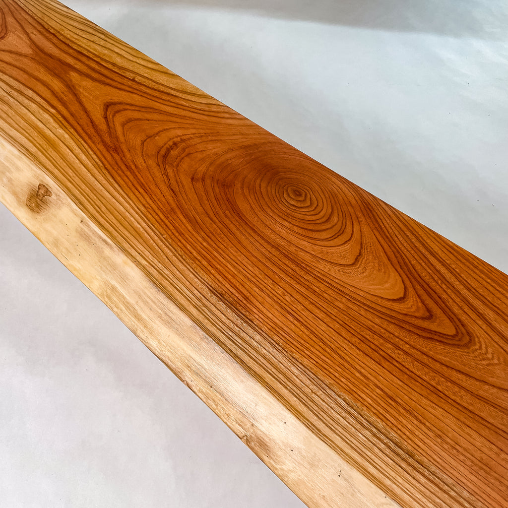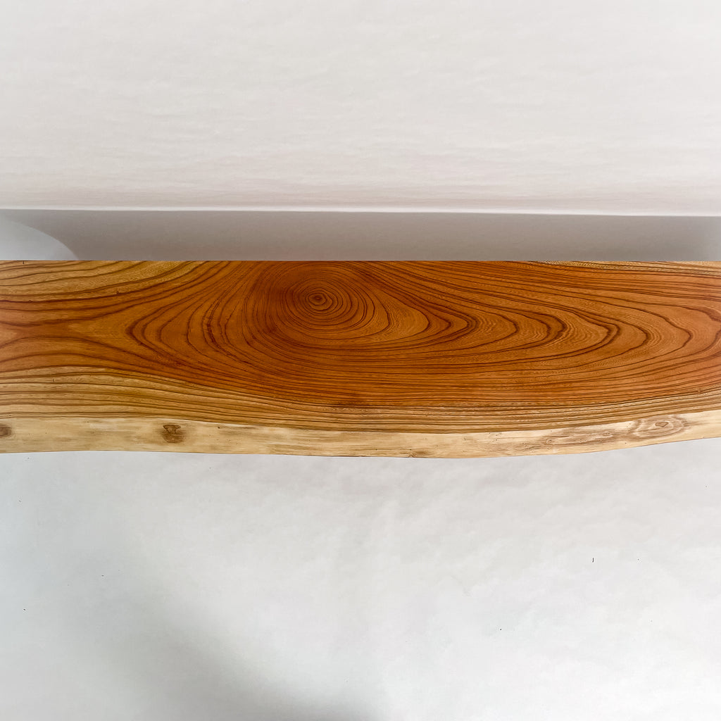 深みある赤褐色と生成りが交わる欅の年輪。長い年月を重ねた板目が流れるように広がり、自然の息遣いを残した上品な仕上げの一枚。欅が大地に根を張り巡らせた歴史と四季の移ろいが宿ります。