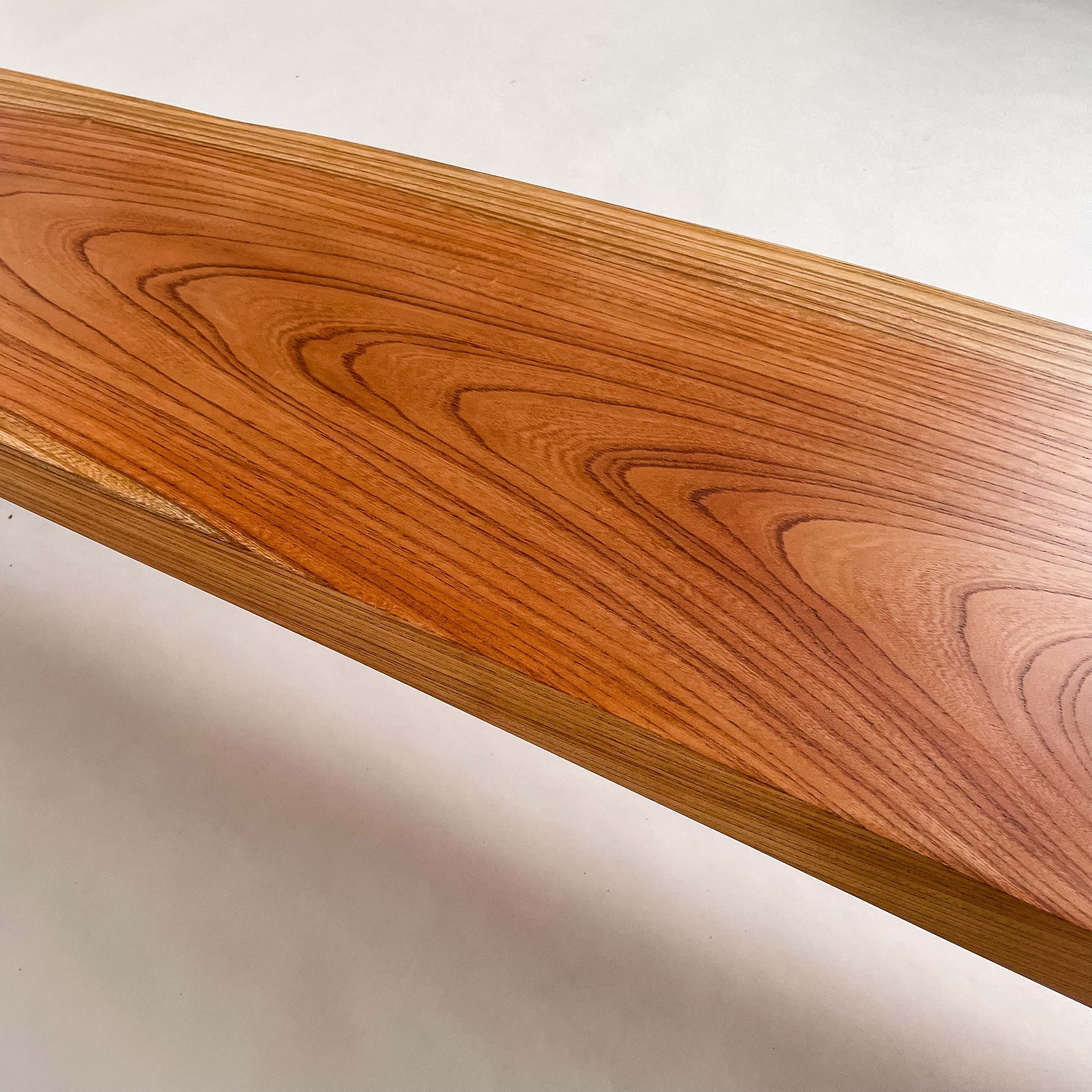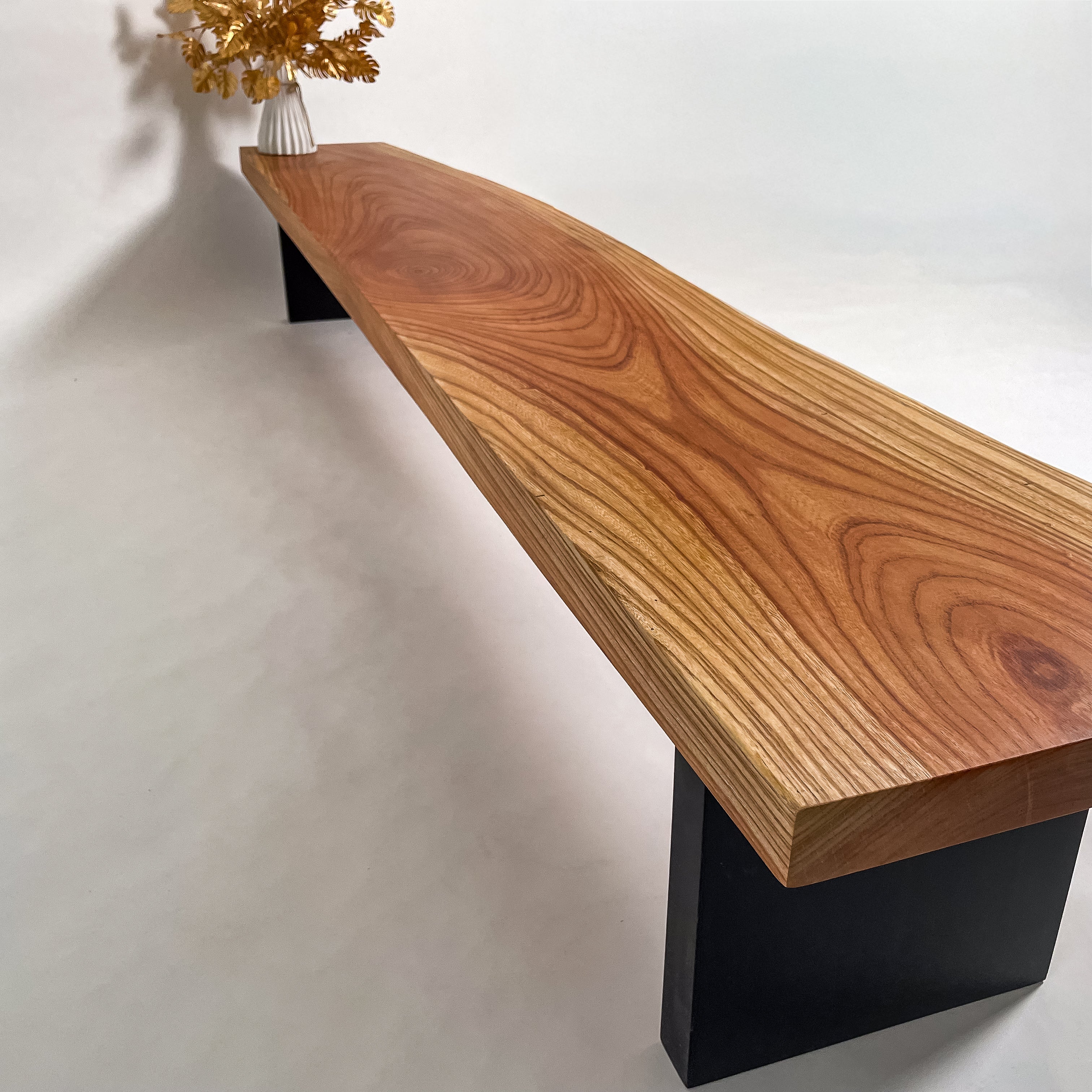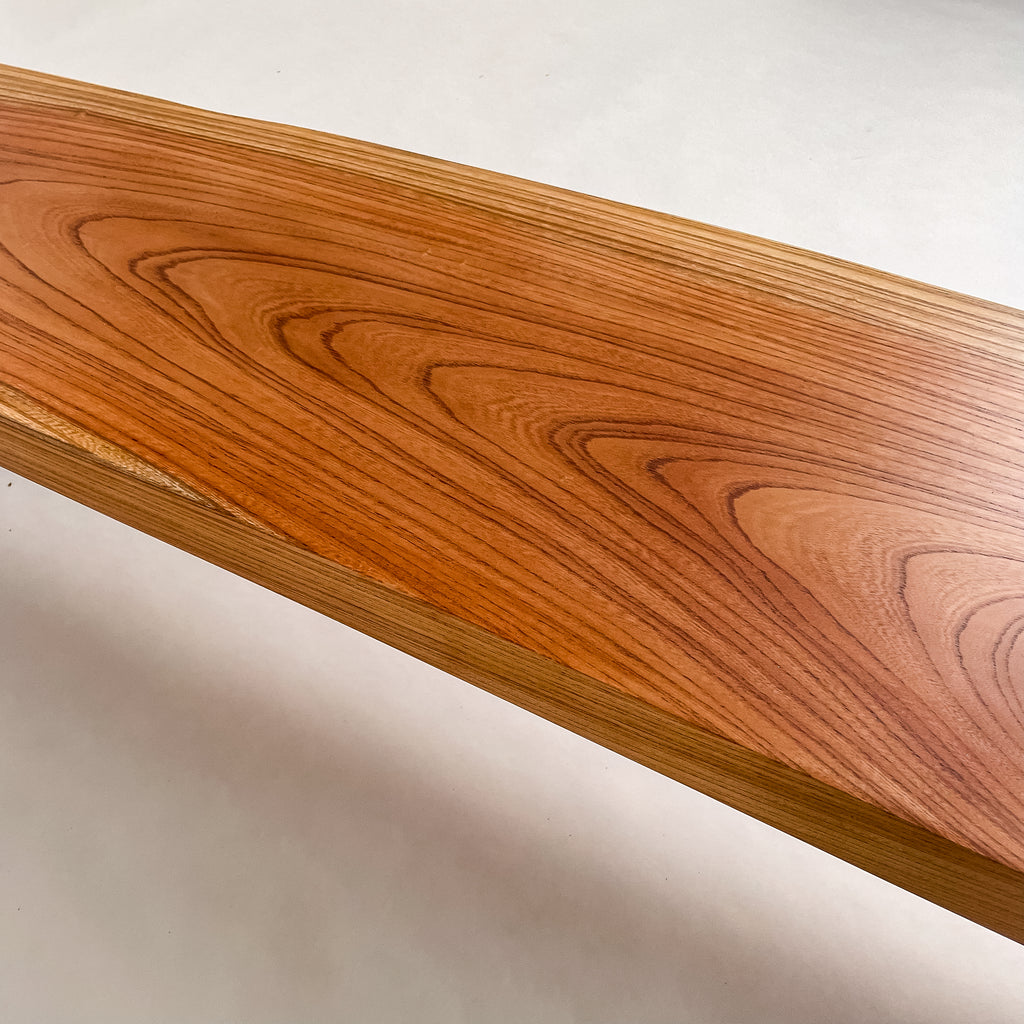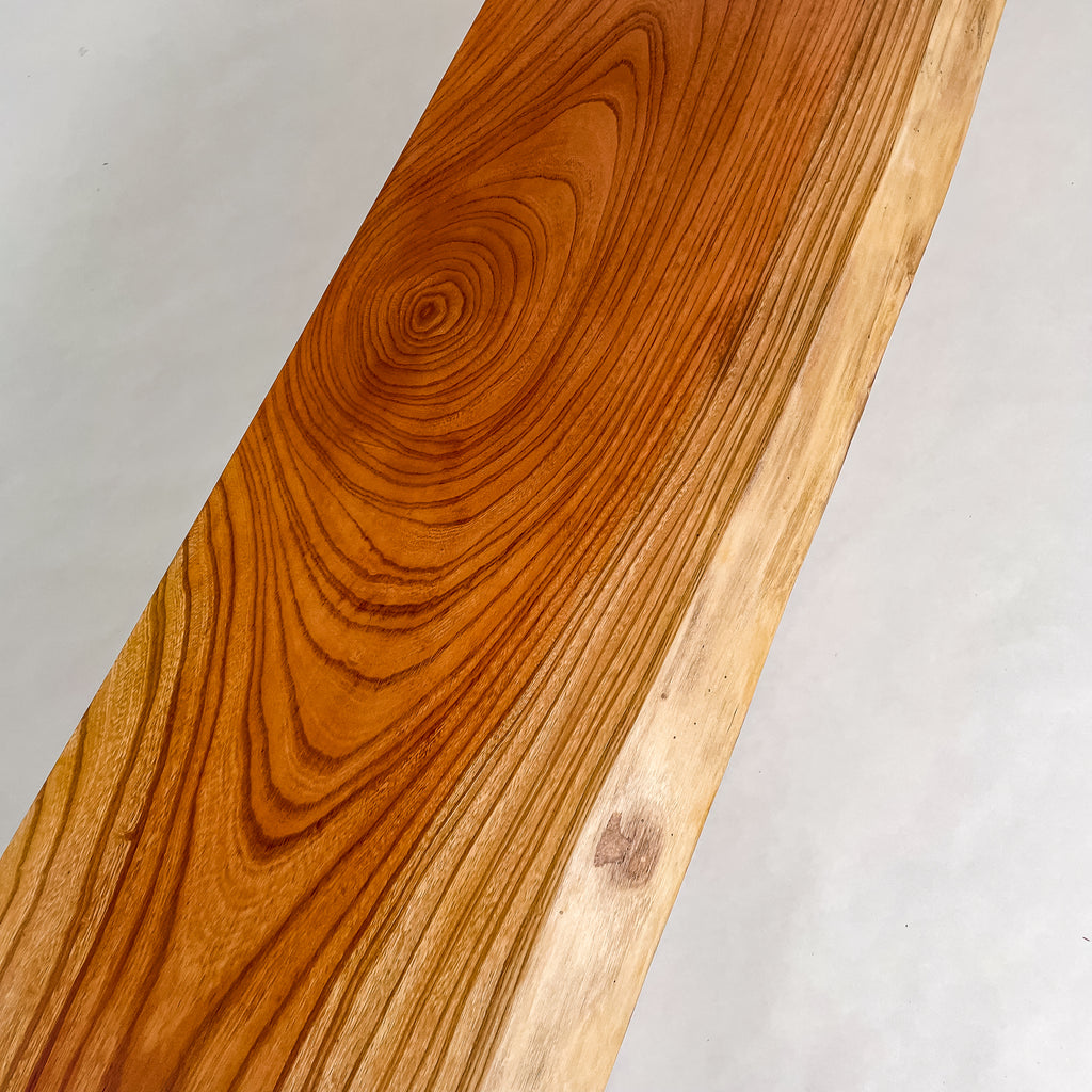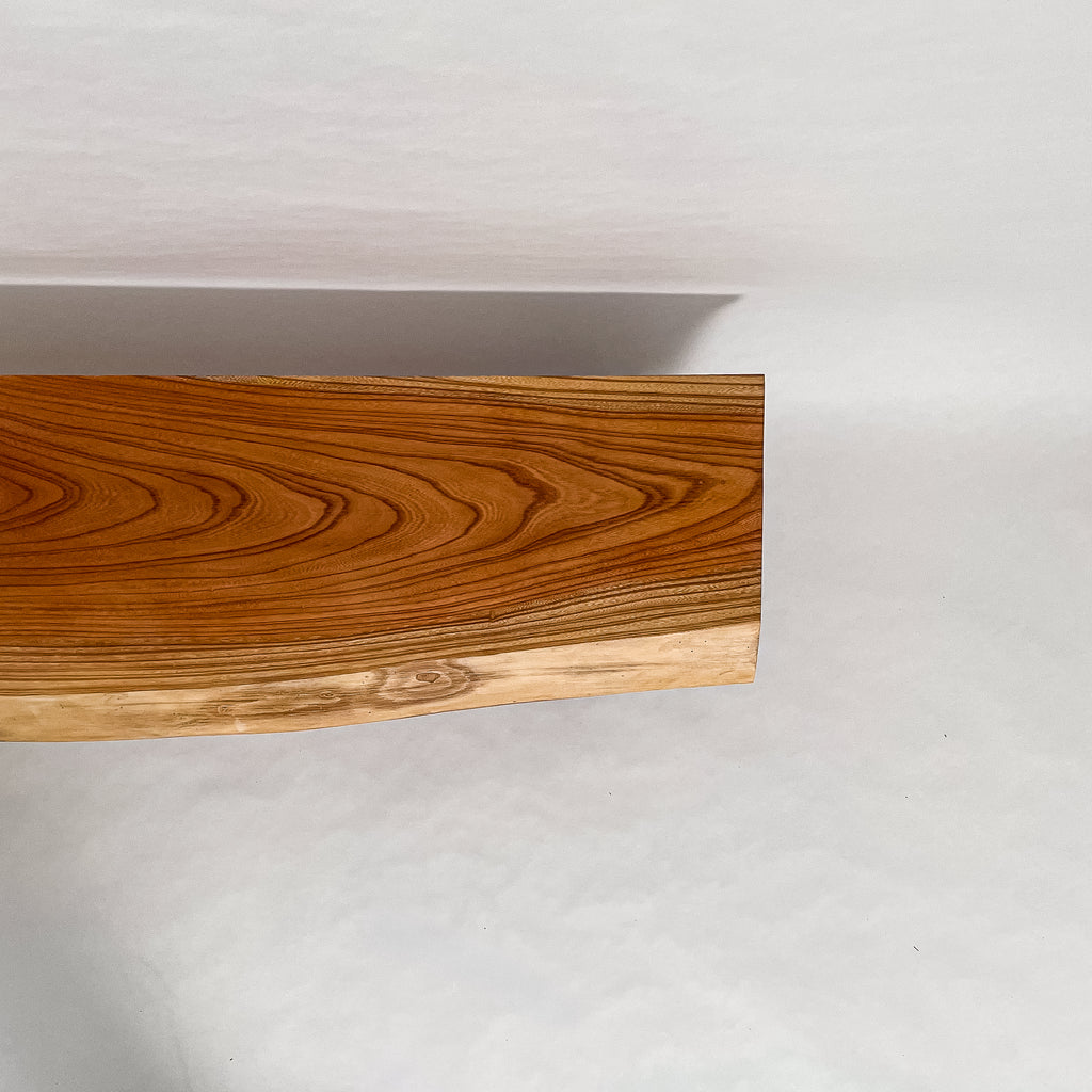 深みある赤褐色と生成りが交わる欅の年輪。長い年月を重ねた板目が流れるように広がり、自然の息遣いを残した上品な仕上げの一枚。欅が大地に根を張り巡らせた歴史と四季の移ろいが宿ります。