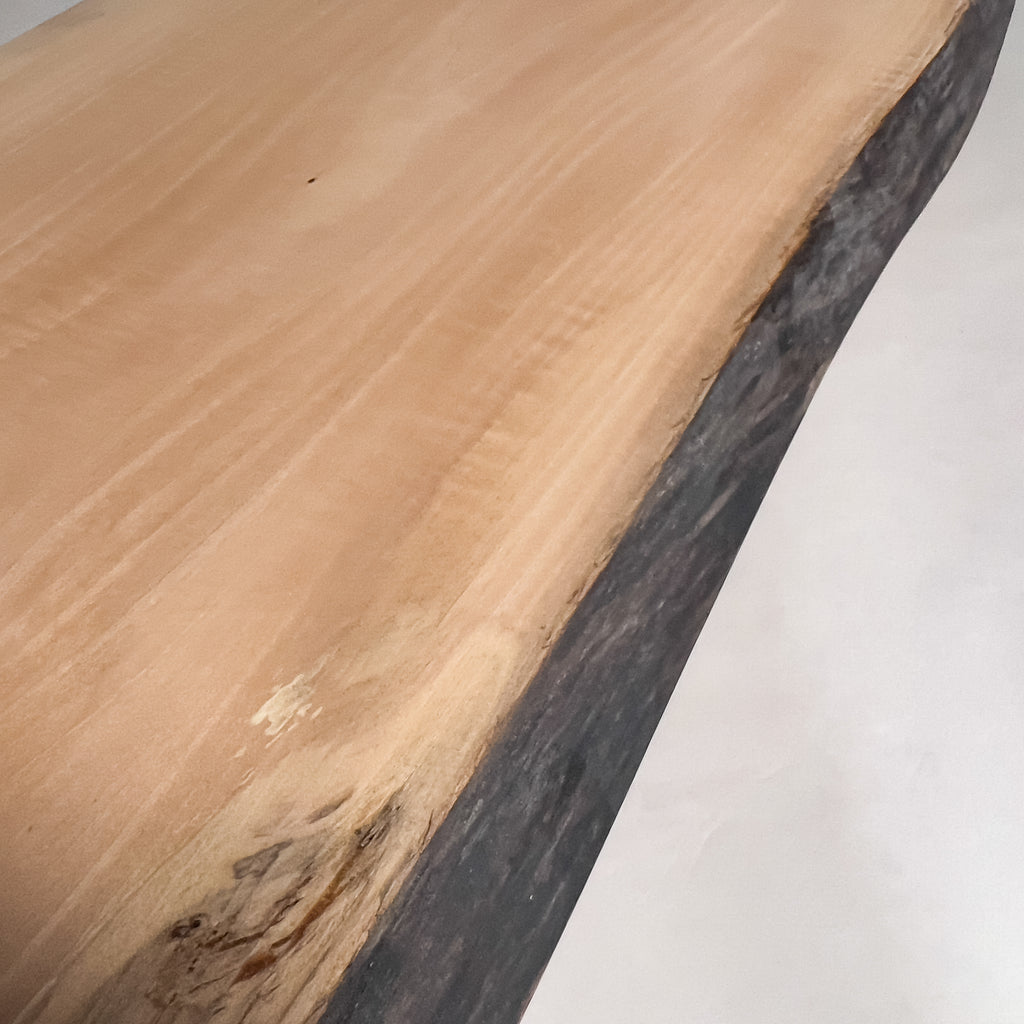 上品で落ち着きのある最高品質の「マットウレタン塗装」。鬼童銘木が磨き上げた技術により、すべての一枚板に独自の特殊塗装を施しています。