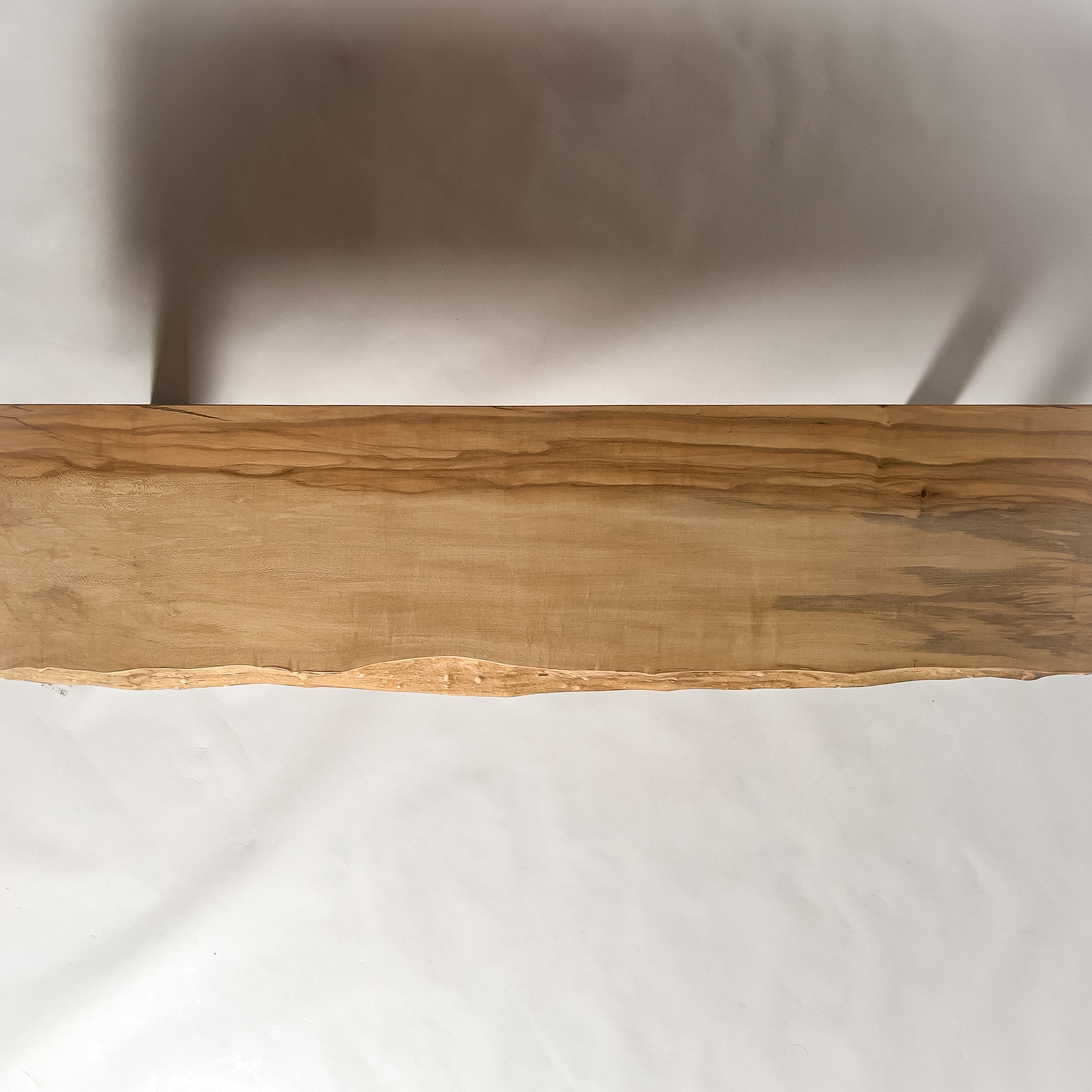 寒暖差のある土地でゆっくり育った楓です。年輪が細かく重なり、縮杢が現れました。淡い色味は光を含み、水面のように揺らぎます。耳の動きを残した上品な仕上げ、静かな躍動感が空間に穏やかに広がります。