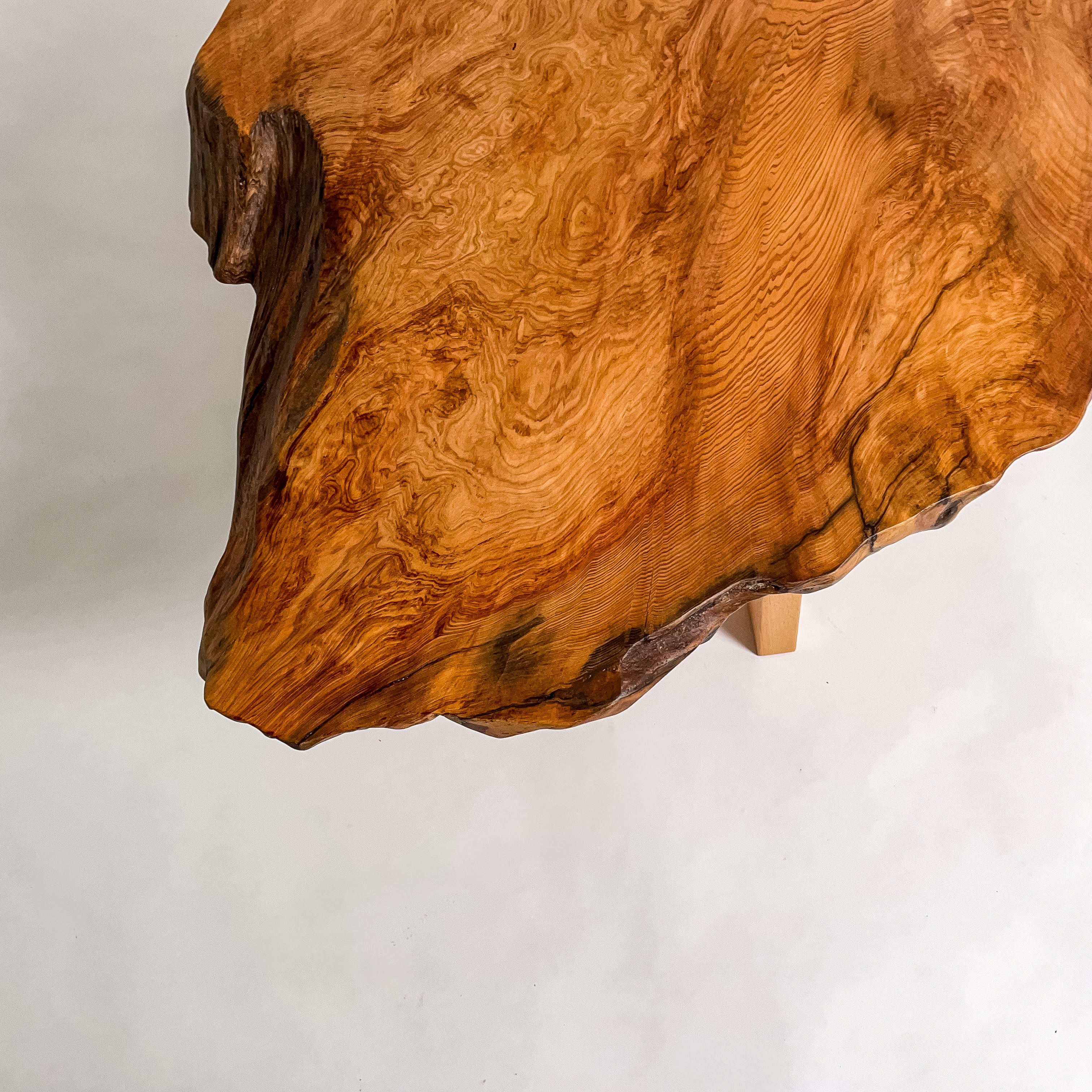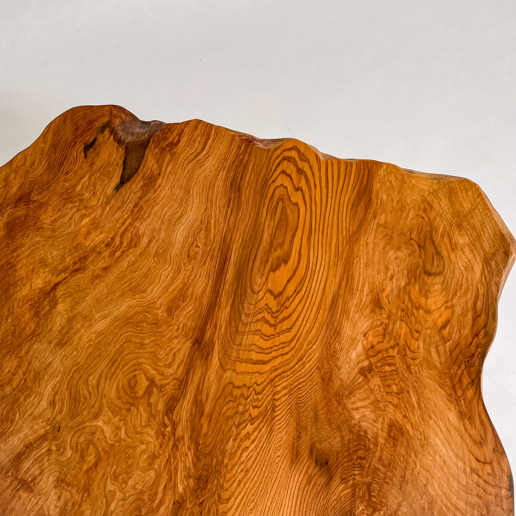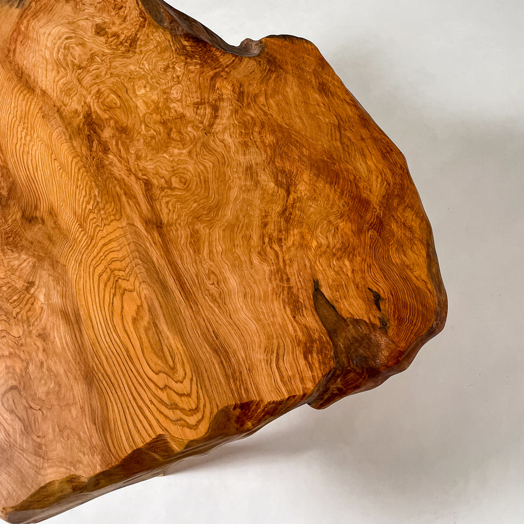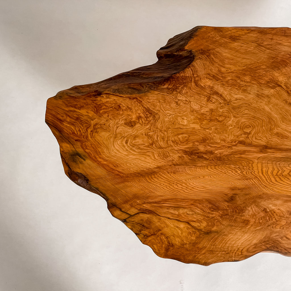 1993年に世界遺産に認定されたことを機に伐採禁止となり、圧倒的な希少価値を誇る一枚板。千年を超える樹齢が作る、緻密で鮮やかな杢目は圧巻。