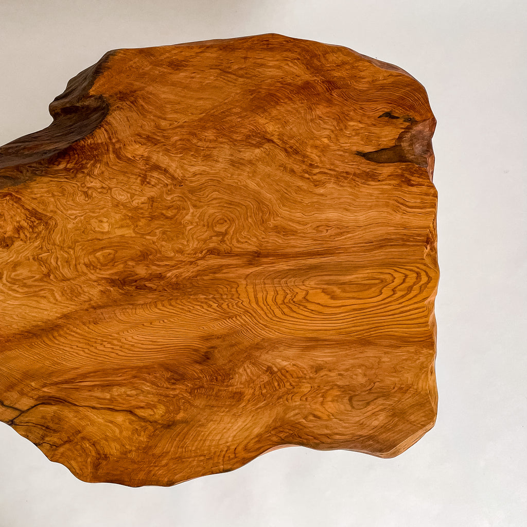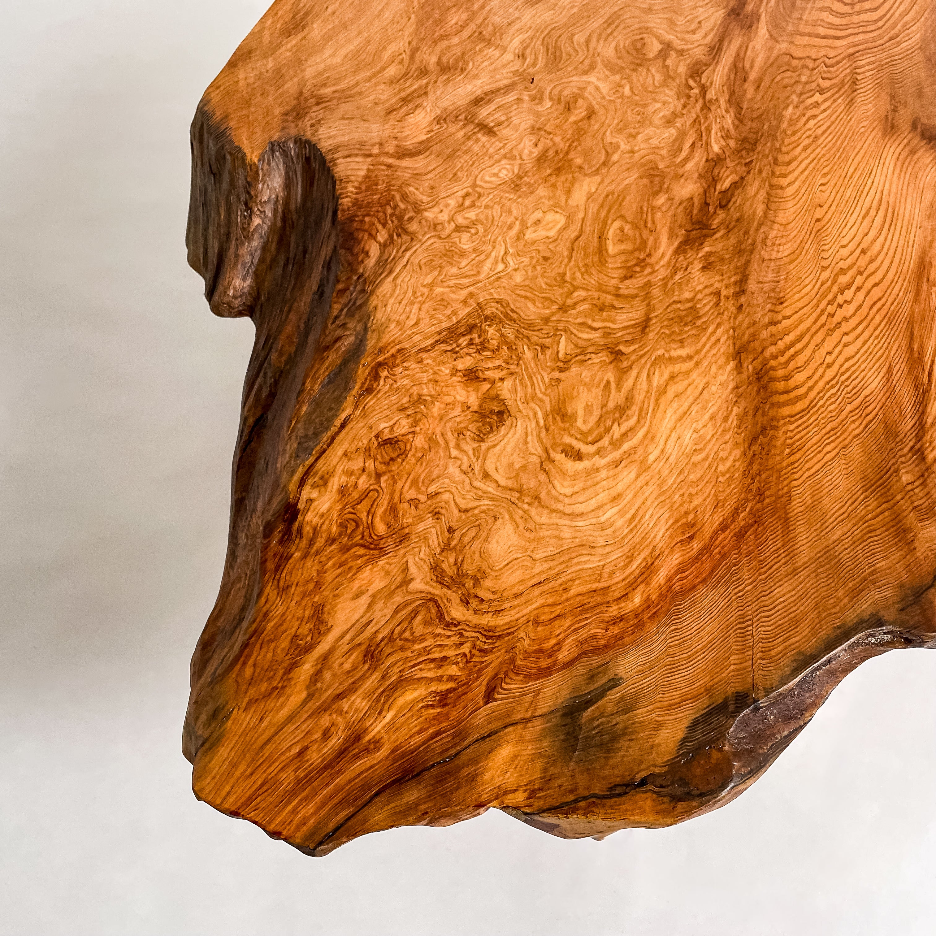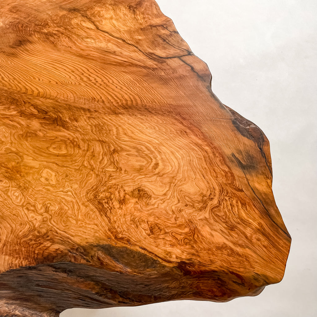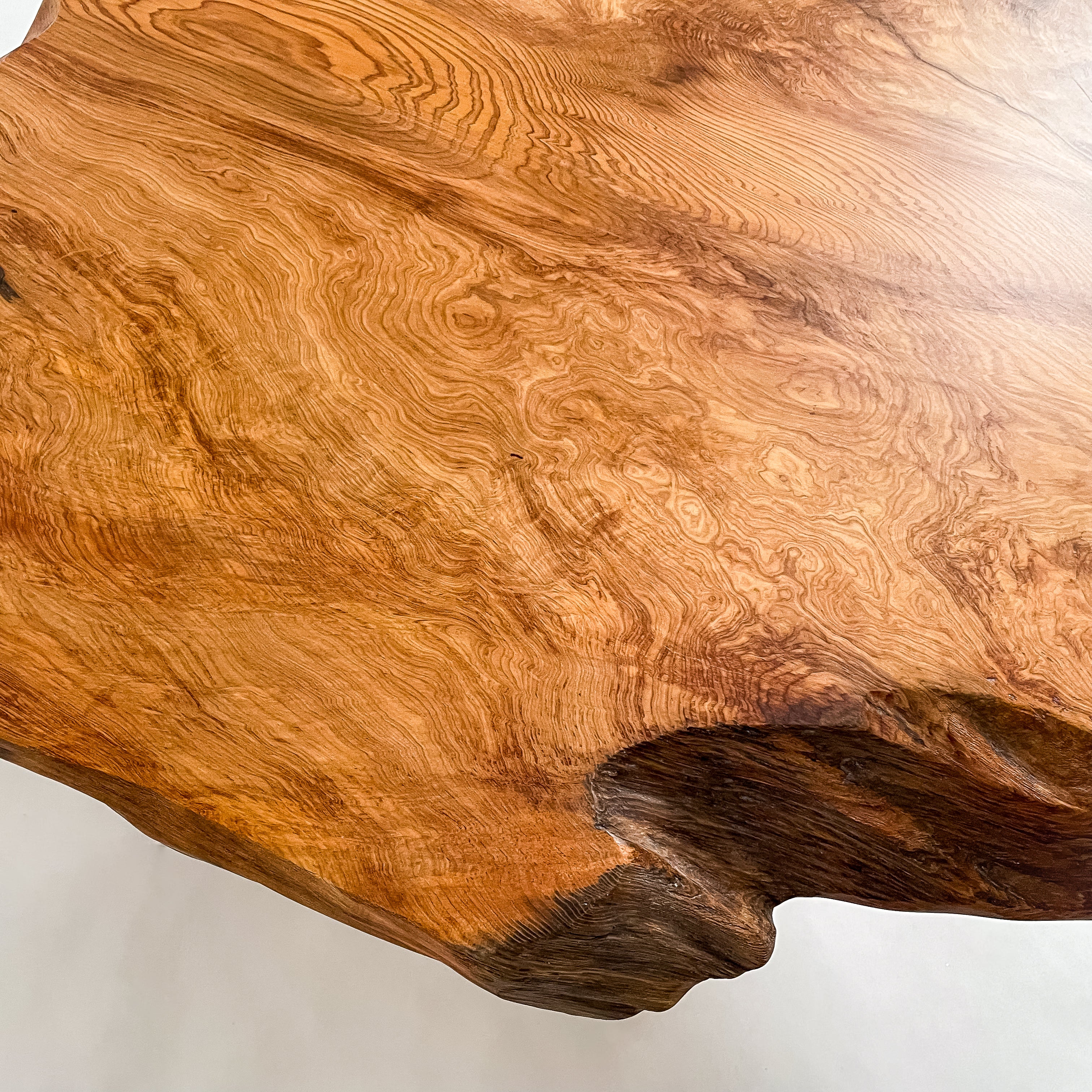 1993年に世界遺産に認定されたことを機に伐採禁止となり、圧倒的な希少価値を誇る一枚板。千年を超える樹齢が作る、緻密で鮮やかな杢目は圧巻。