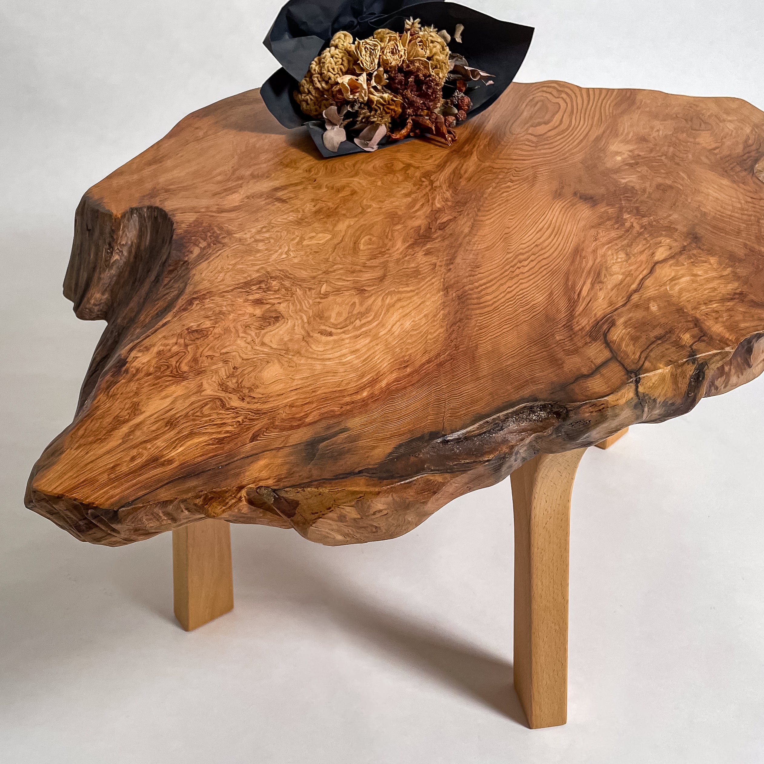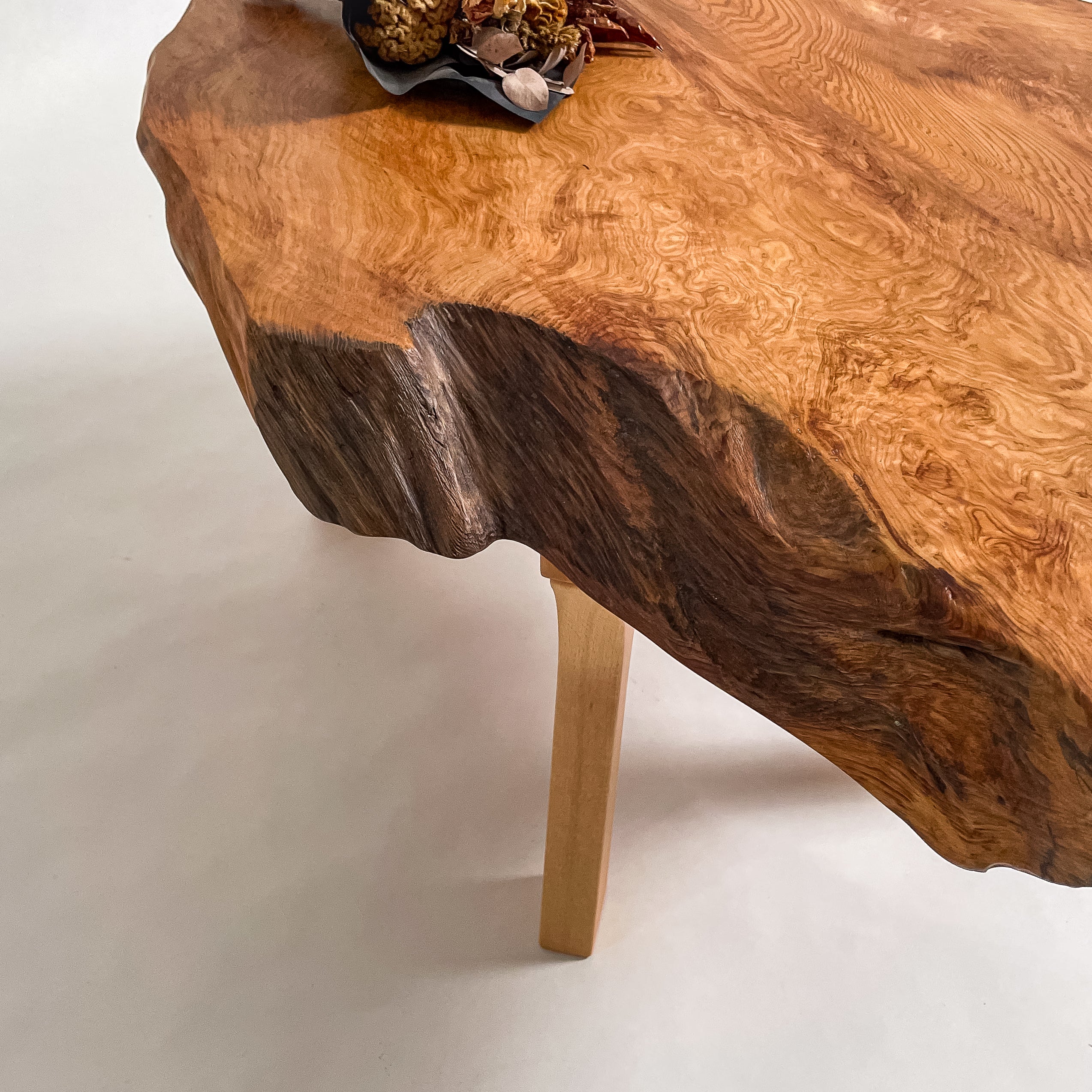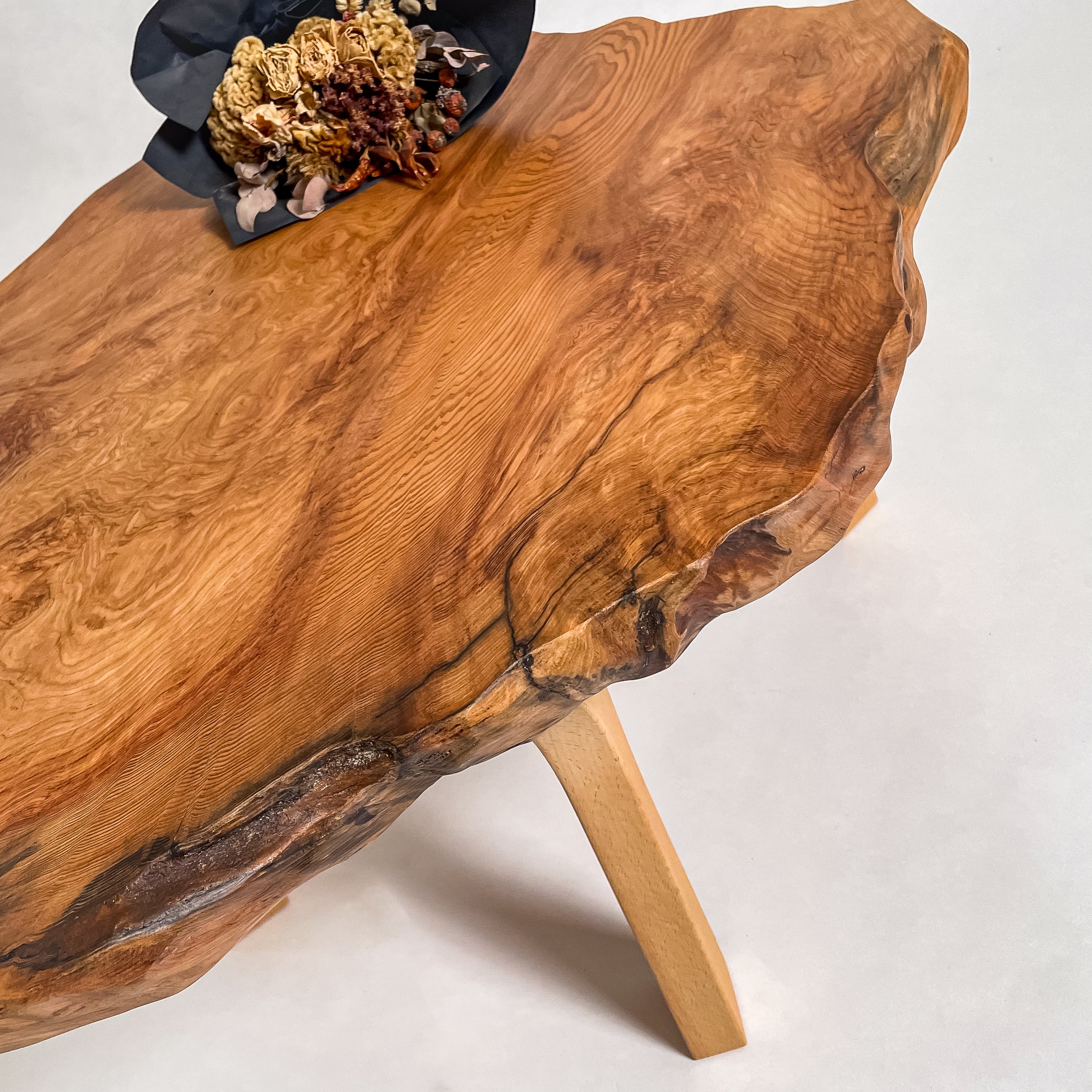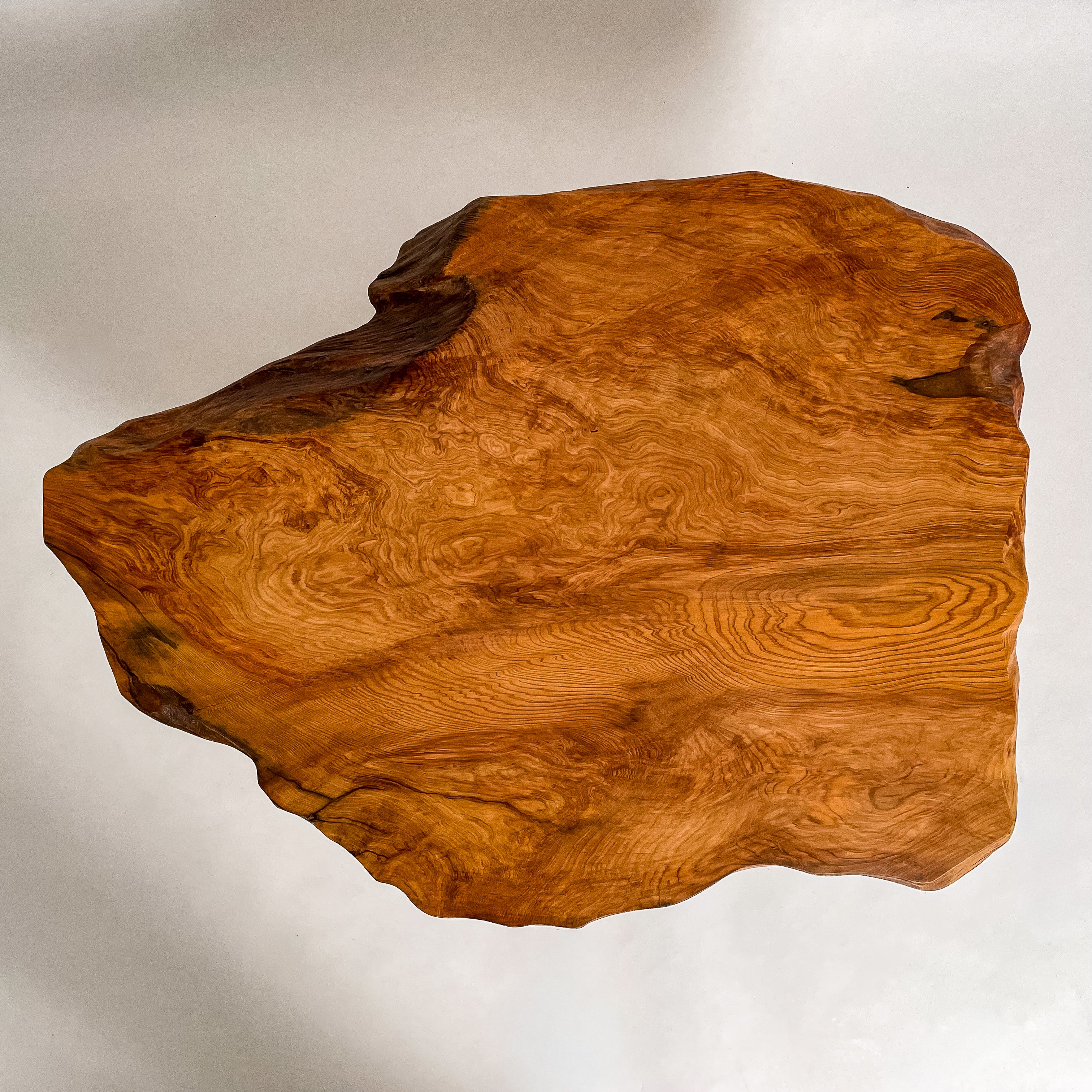 1993年に世界遺産に認定されたことを機に伐採禁止となり、圧倒的な希少価値を誇る一枚板。千年を超える樹齢が作る、緻密で鮮やかな杢目は圧巻。