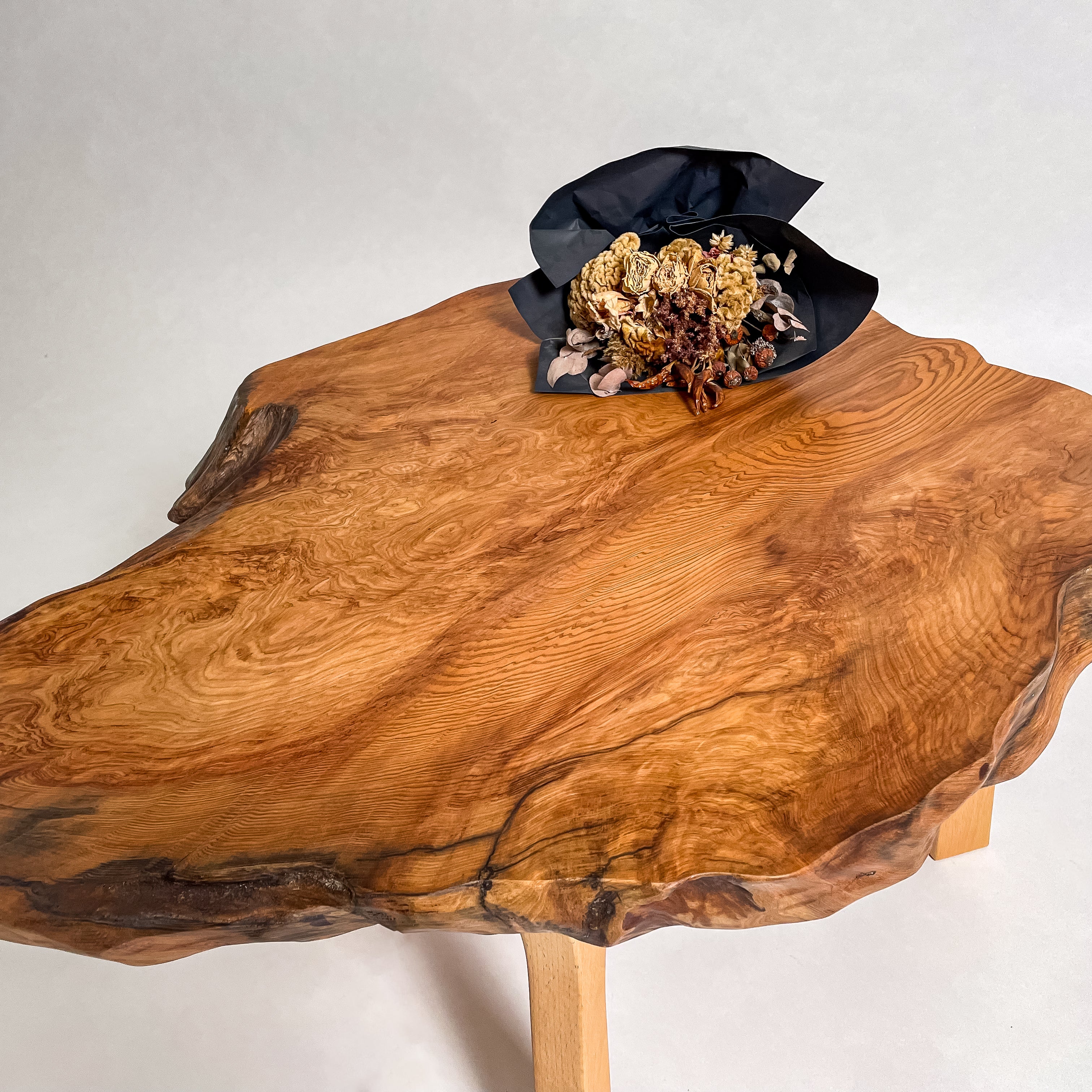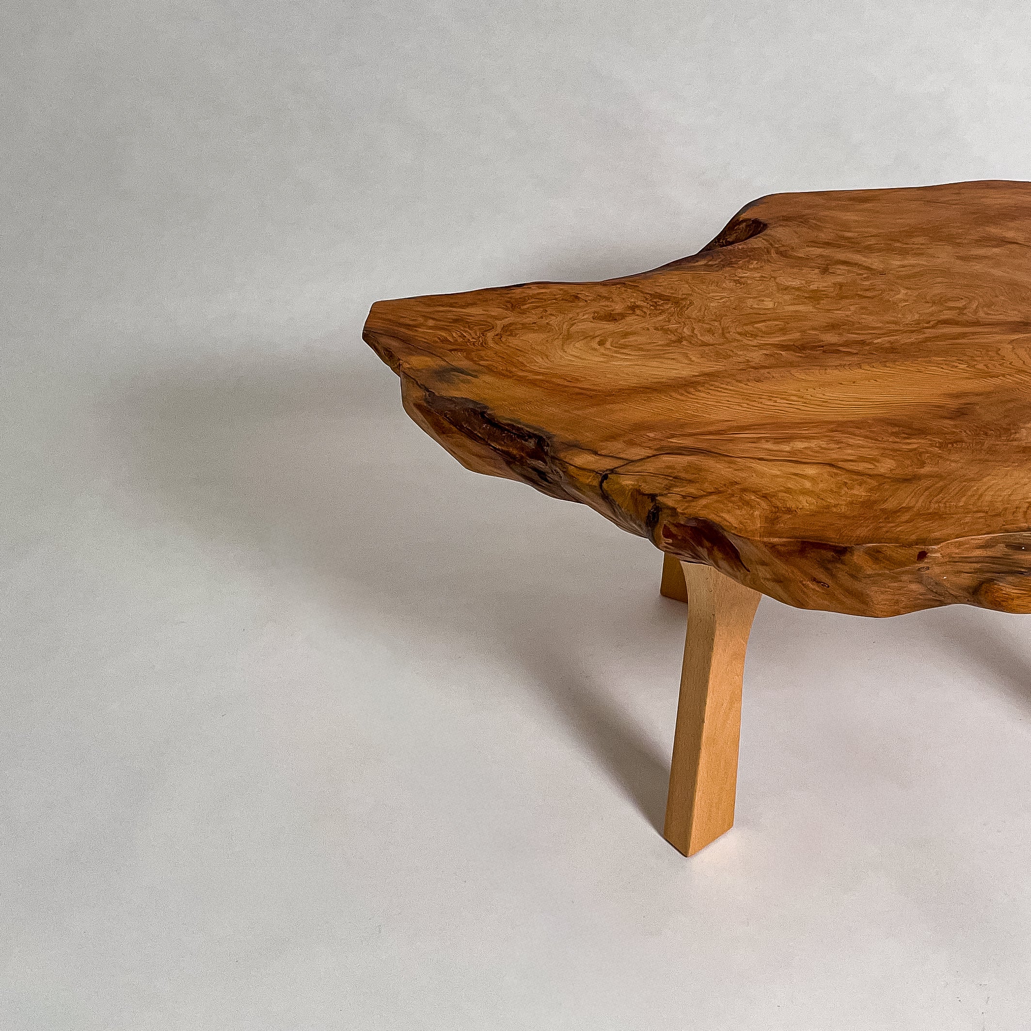 複数の板をつなぎ合わせたものとは異なり、途切れることなく続く杢目は自然の美しさをそのまま映し出します。
