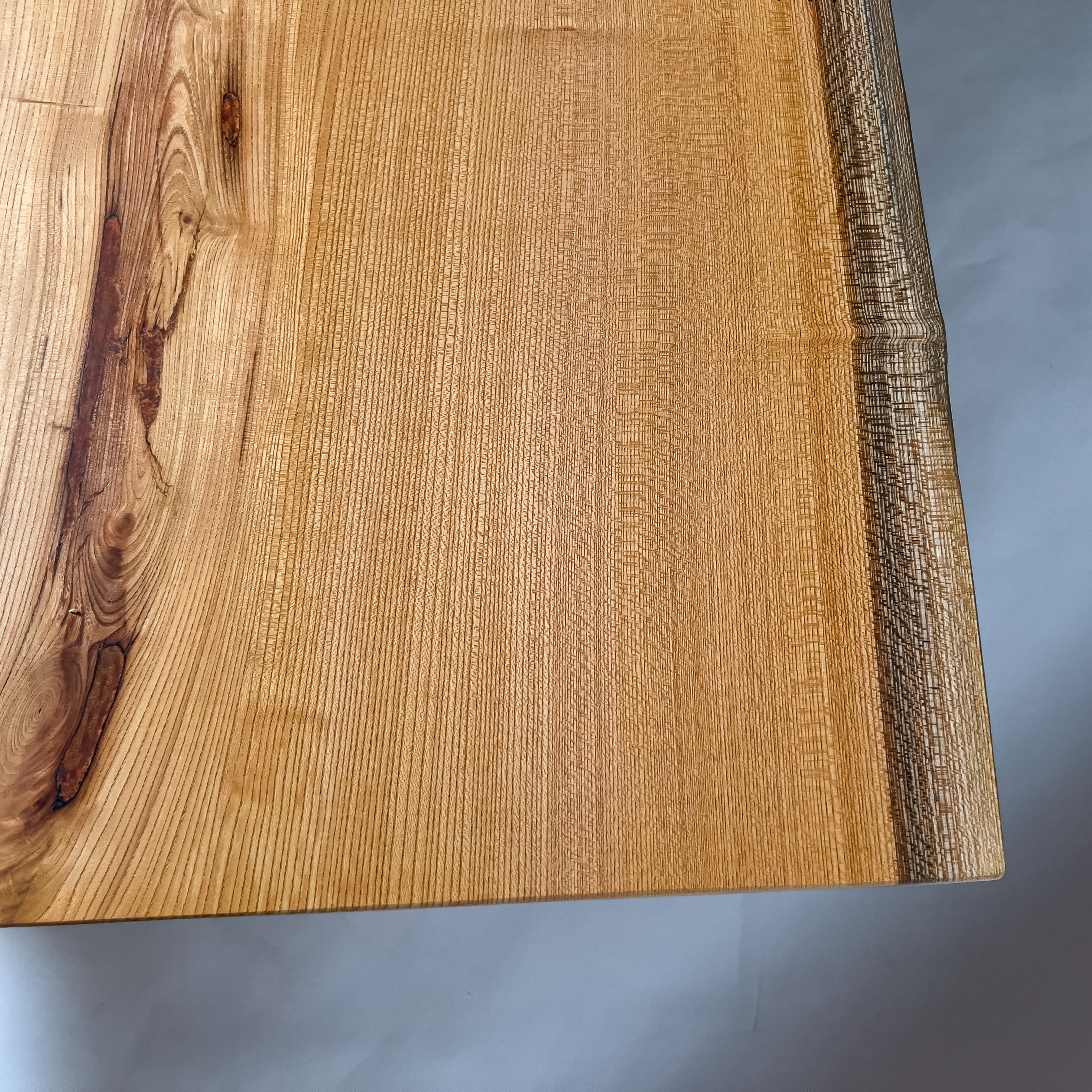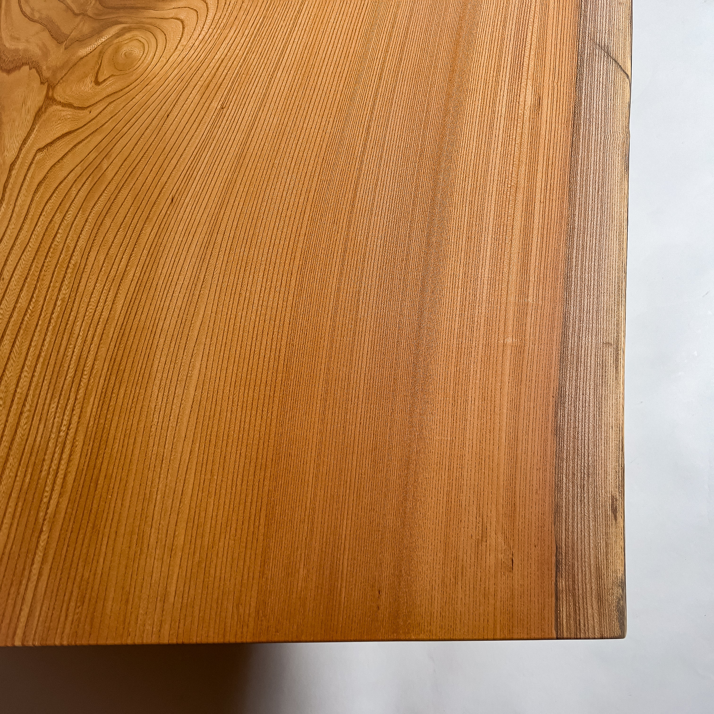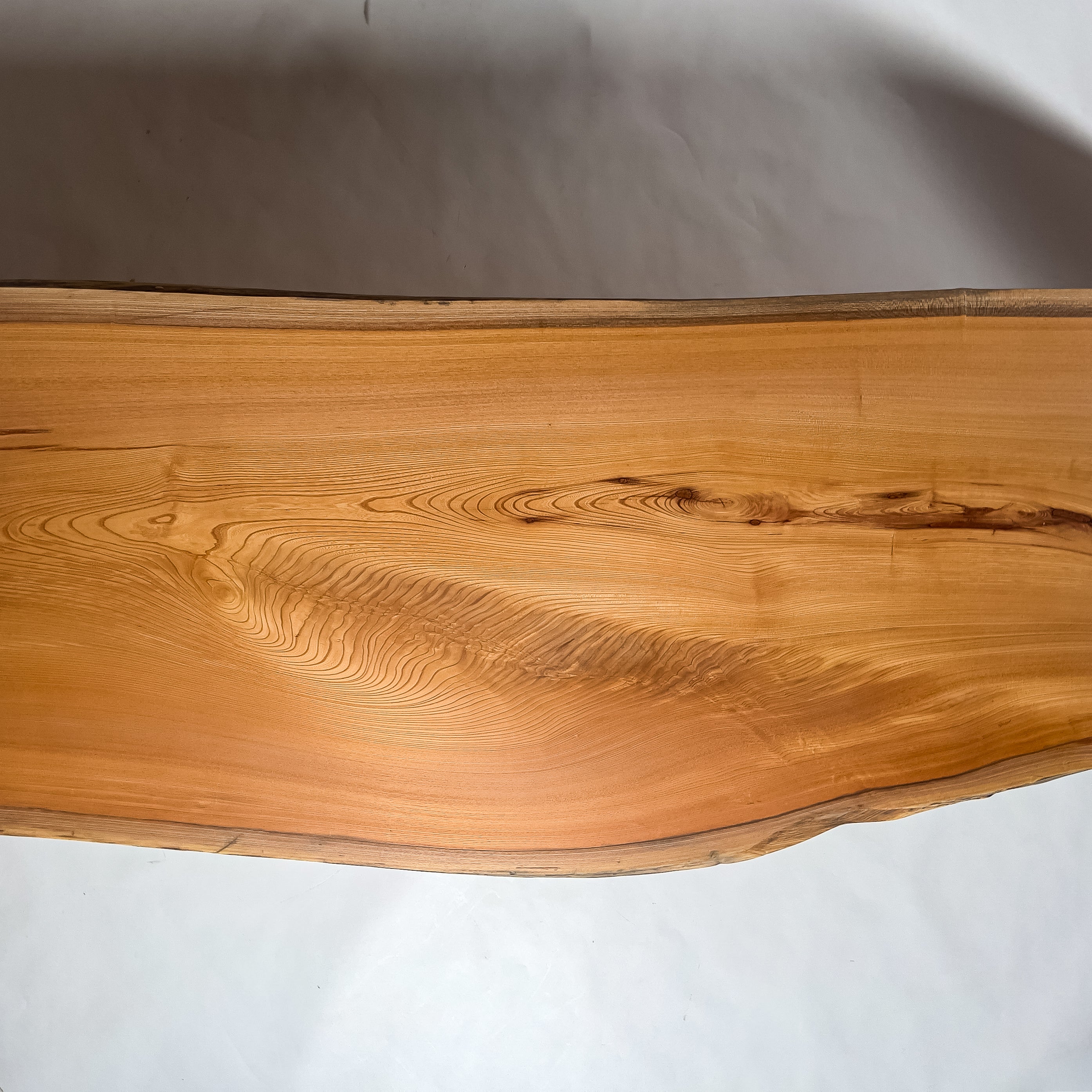 整った流れの木目と穏やかな色味に、自然縁の動きが重なり、空間の軸として佇まう一枚板。
