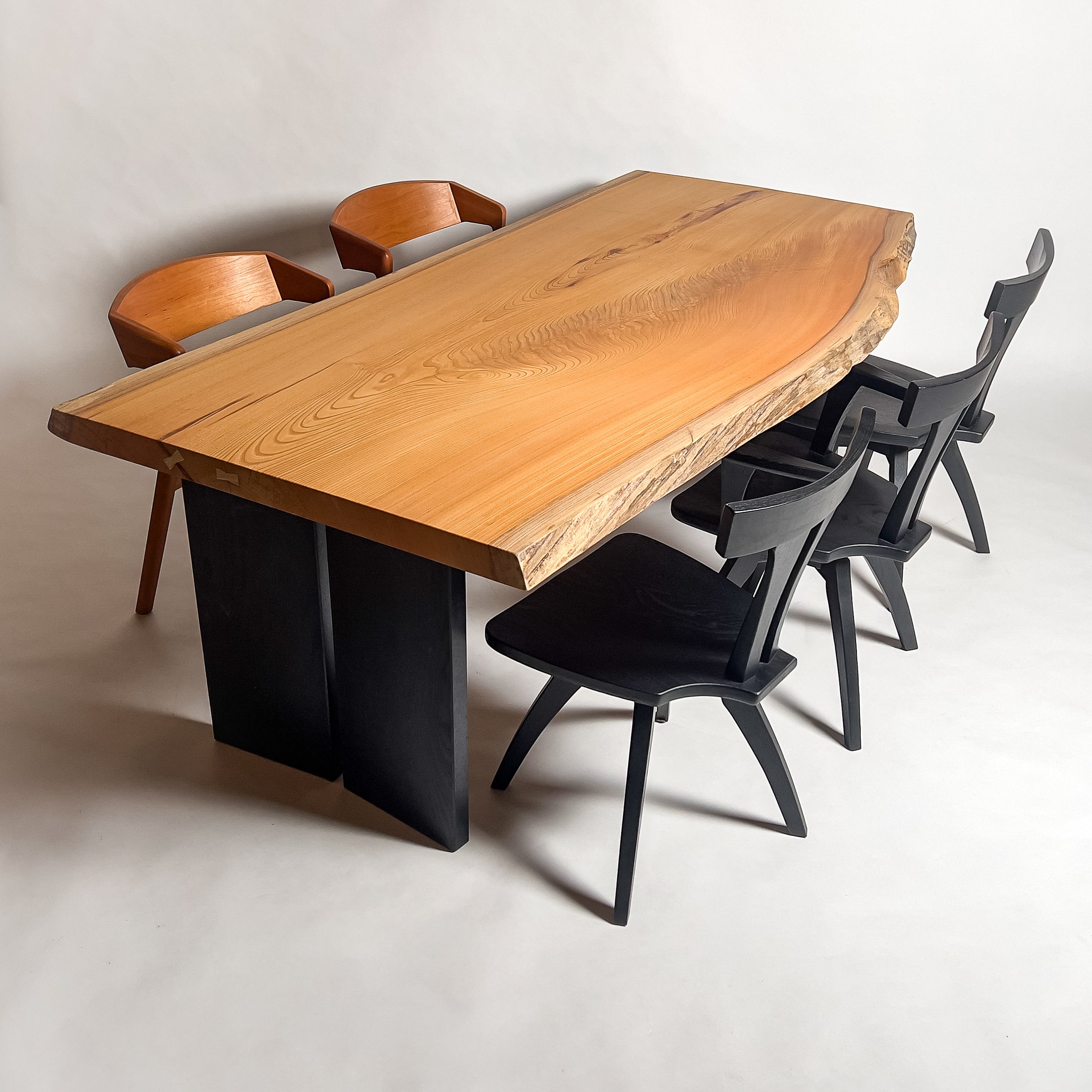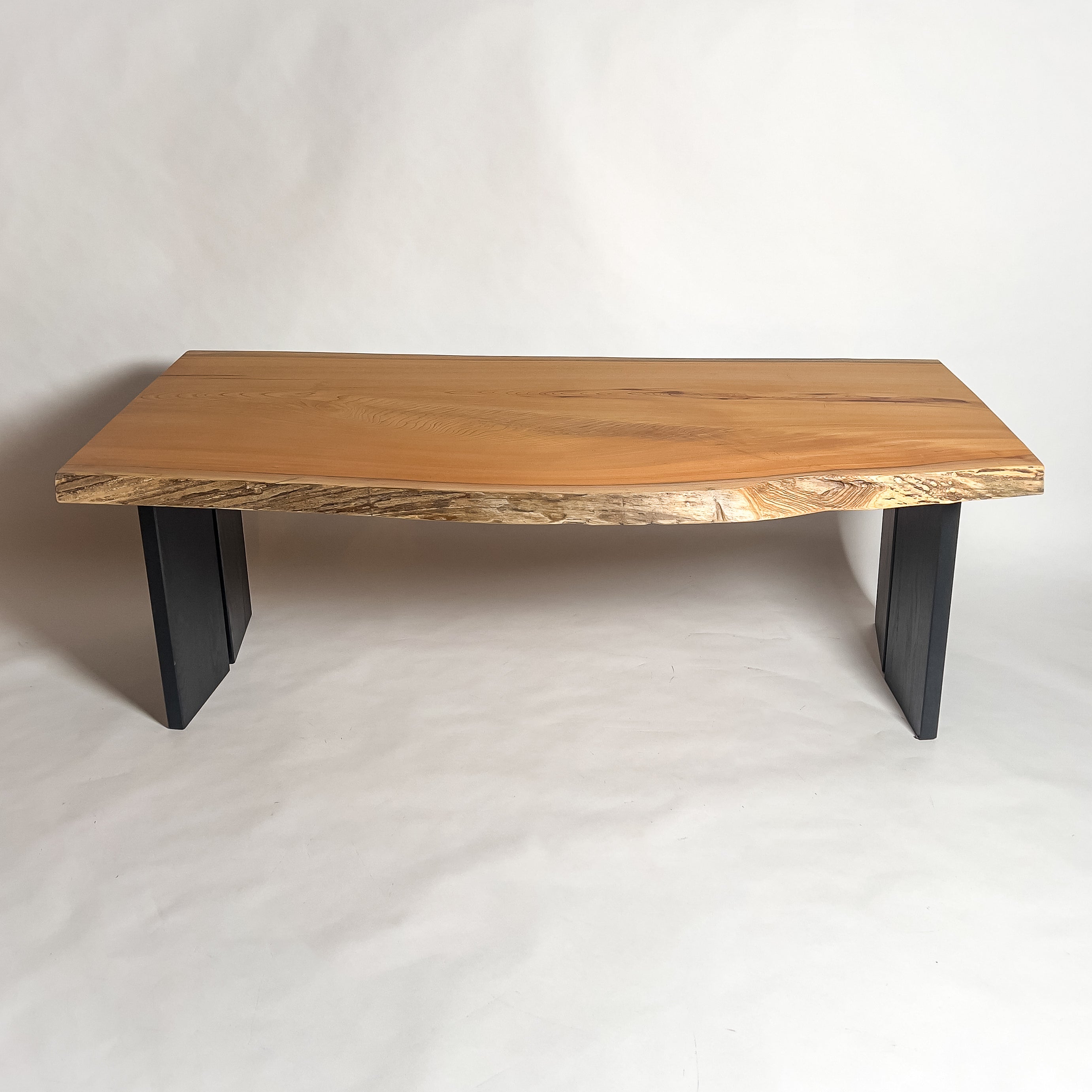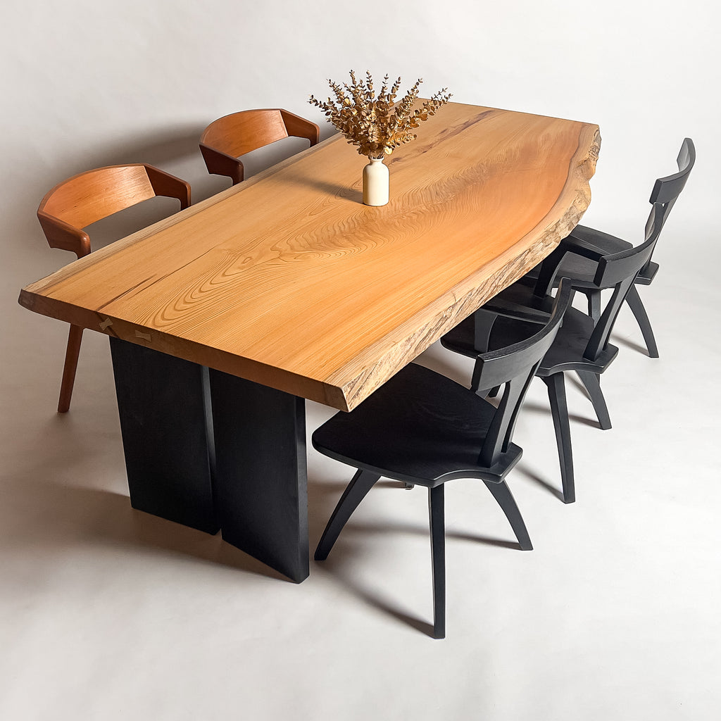 整った流れの木目と穏やかな色味に、自然縁の動きが重なり、空間の軸として佇まう一枚板。