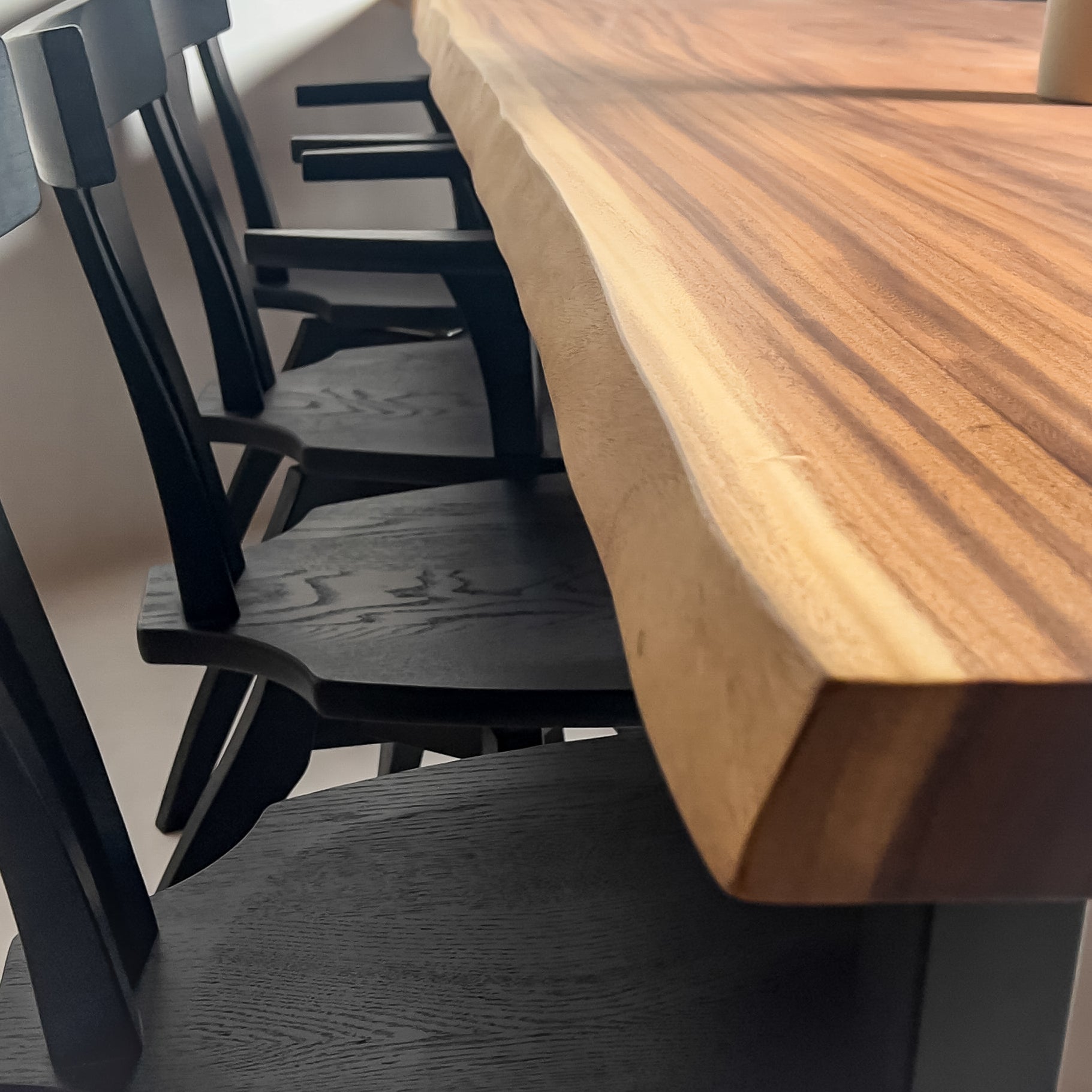 現代の空間に映えるモダンな佇まいを意識しつつ、一枚板ごとに素材感と存在感の出方を見極め、加工を行います。造形を整えすぎず、木が本来持つ表情を残すことを大切にしています。 ![]() |
