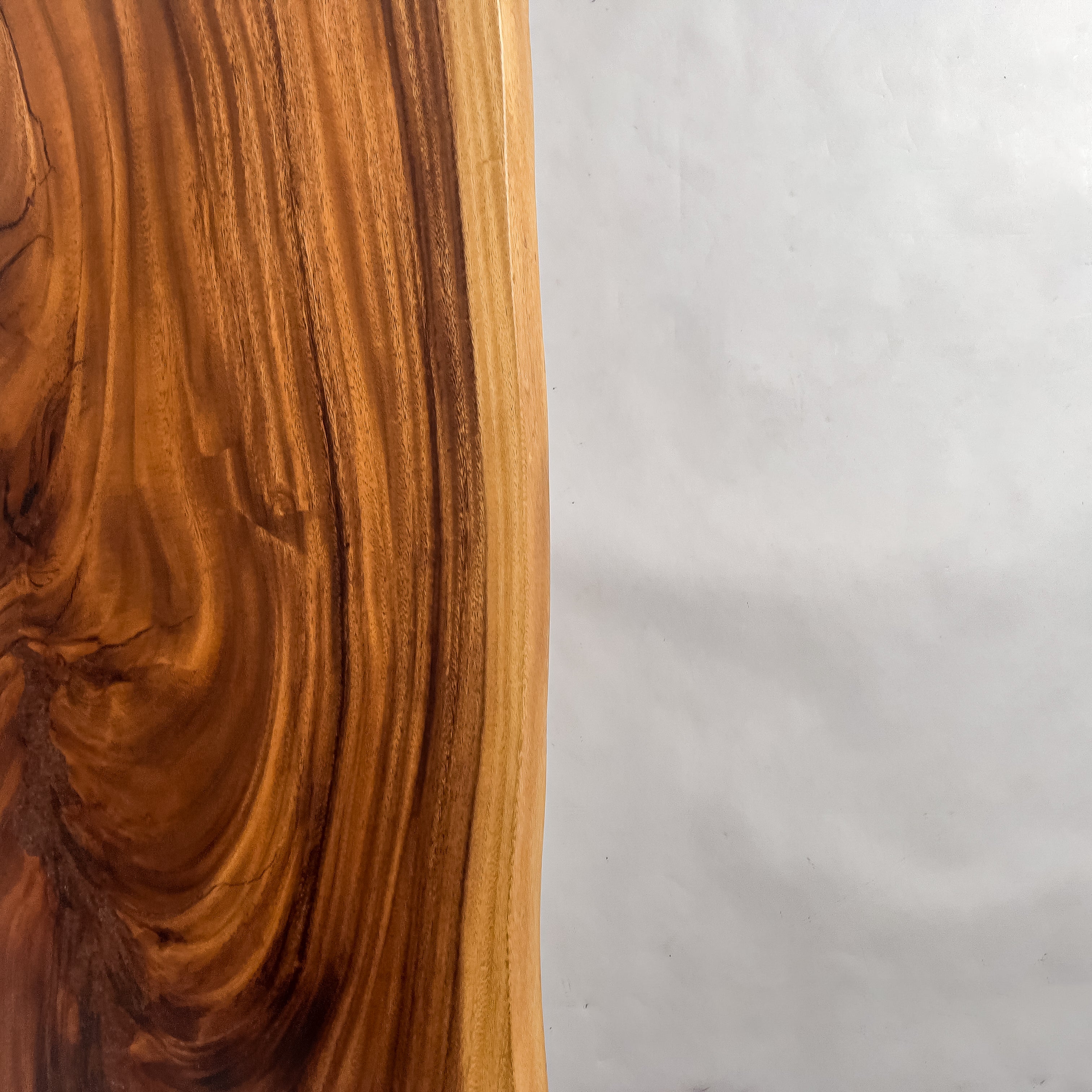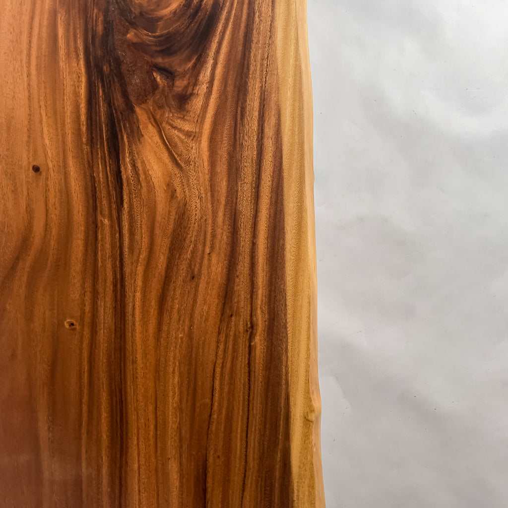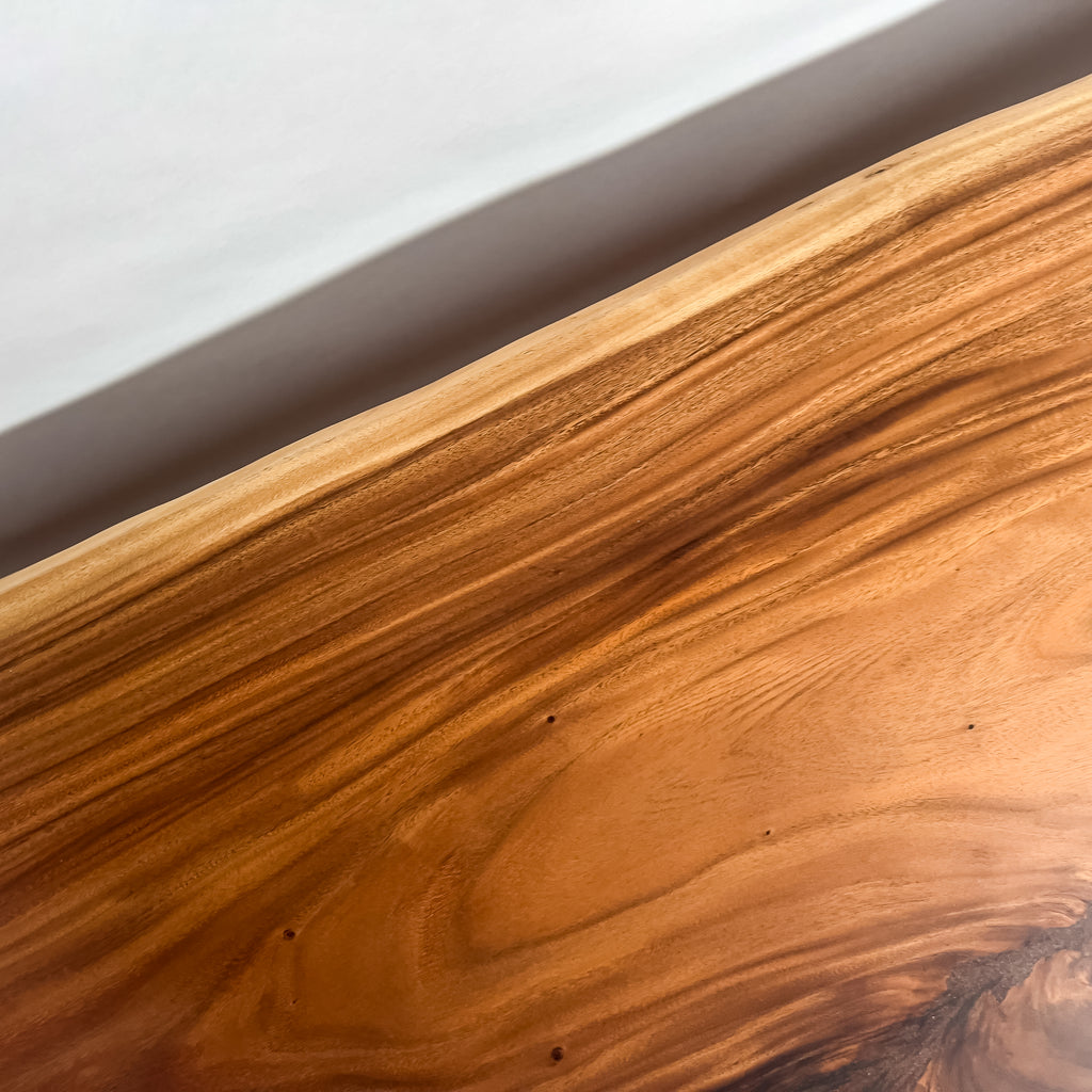 この一枚板の希少性:高い 天板中央から長手途中にかけて木目のうねりと濃淡が連続し、耳際まで形状のまとまりが保たれています。広い奥行きでこの流れを崩さず成立させるには原木条件と製材位置が限定され、同条件でも木目の分断や耳の荒れが生じやすいため希少性が高いです。 |