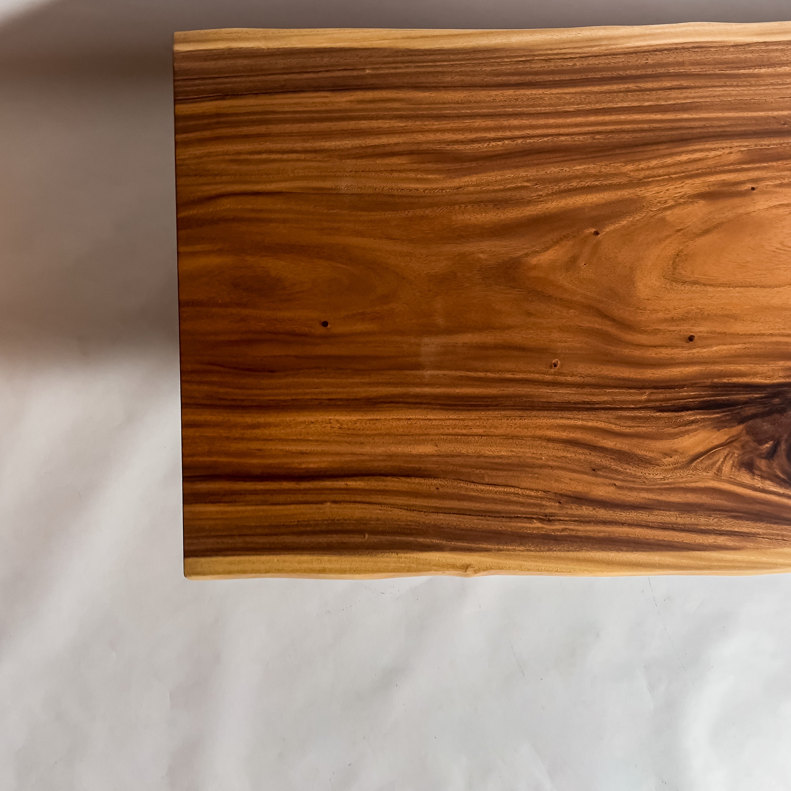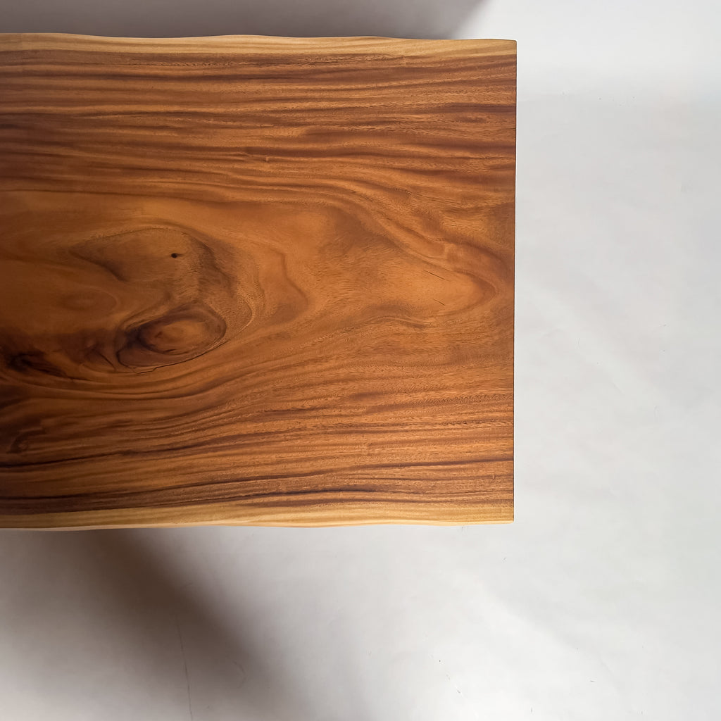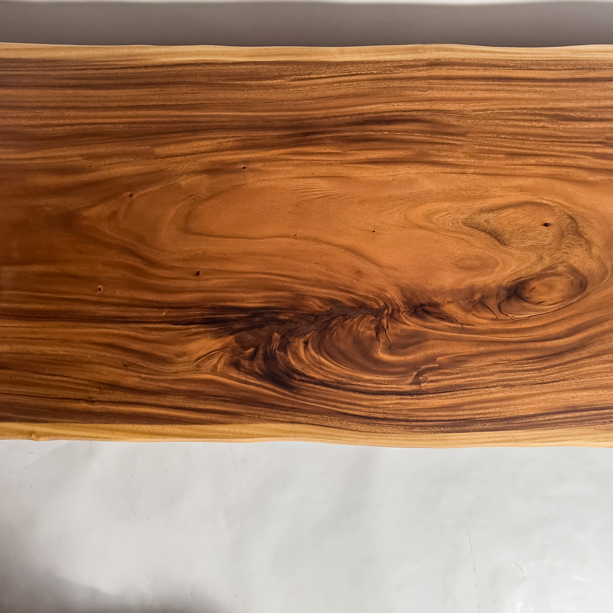 この一枚板の希少性:高い 天板中央から長手途中にかけて木目のうねりと濃淡が連続し、耳際まで形状のまとまりが保たれています。広い奥行きでこの流れを崩さず成立させるには原木条件と製材位置が限定され、同条件でも木目の分断や耳の荒れが生じやすいため希少性が高いです。 |