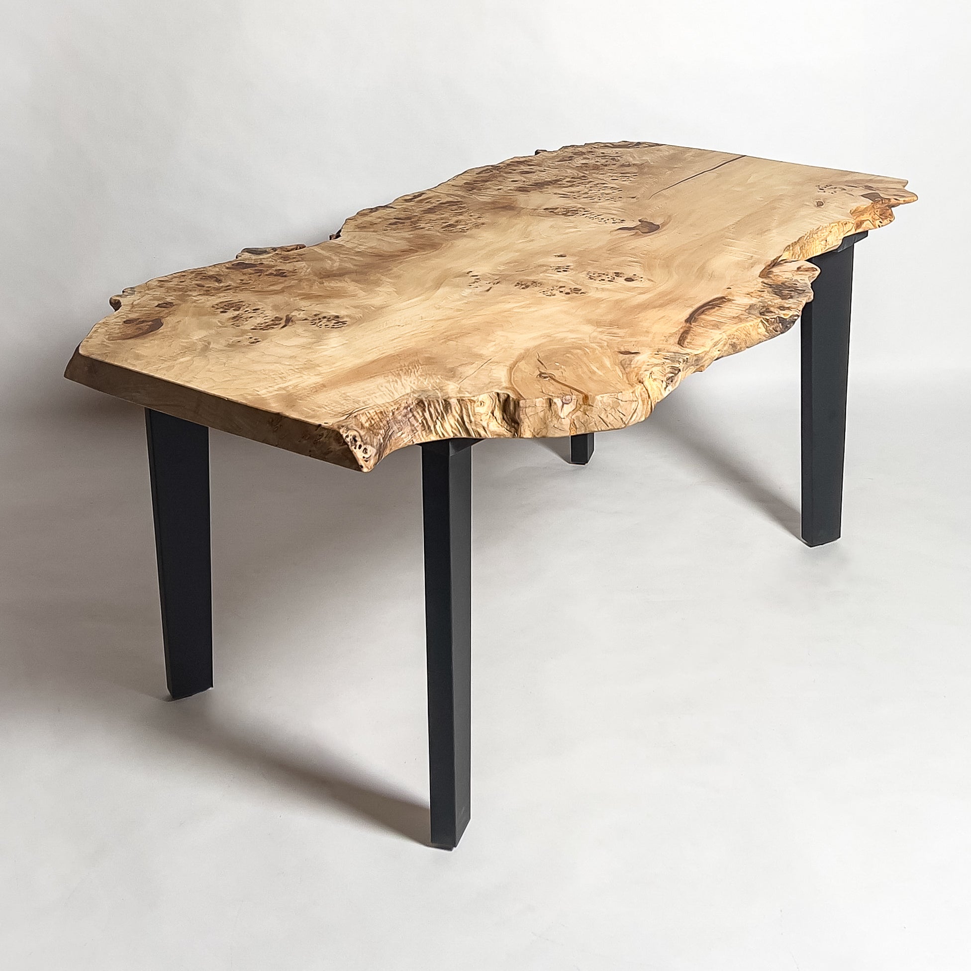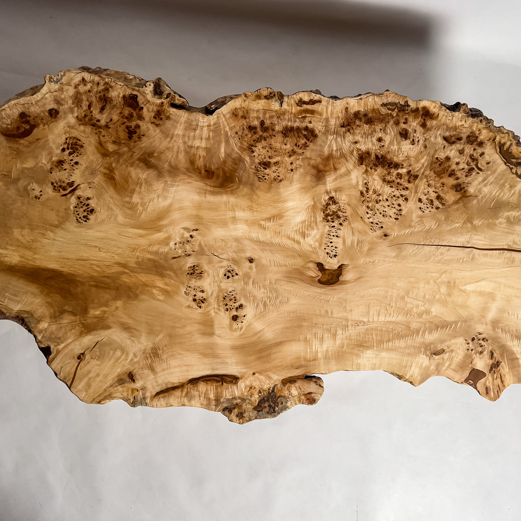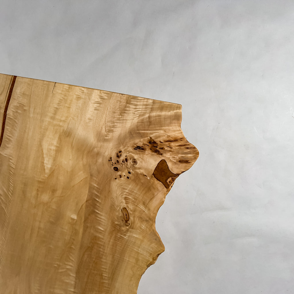 動きのある木目と明るい色味、輪郭の抑揚が重なり、空間に自然な流れをもたらす一枚板。