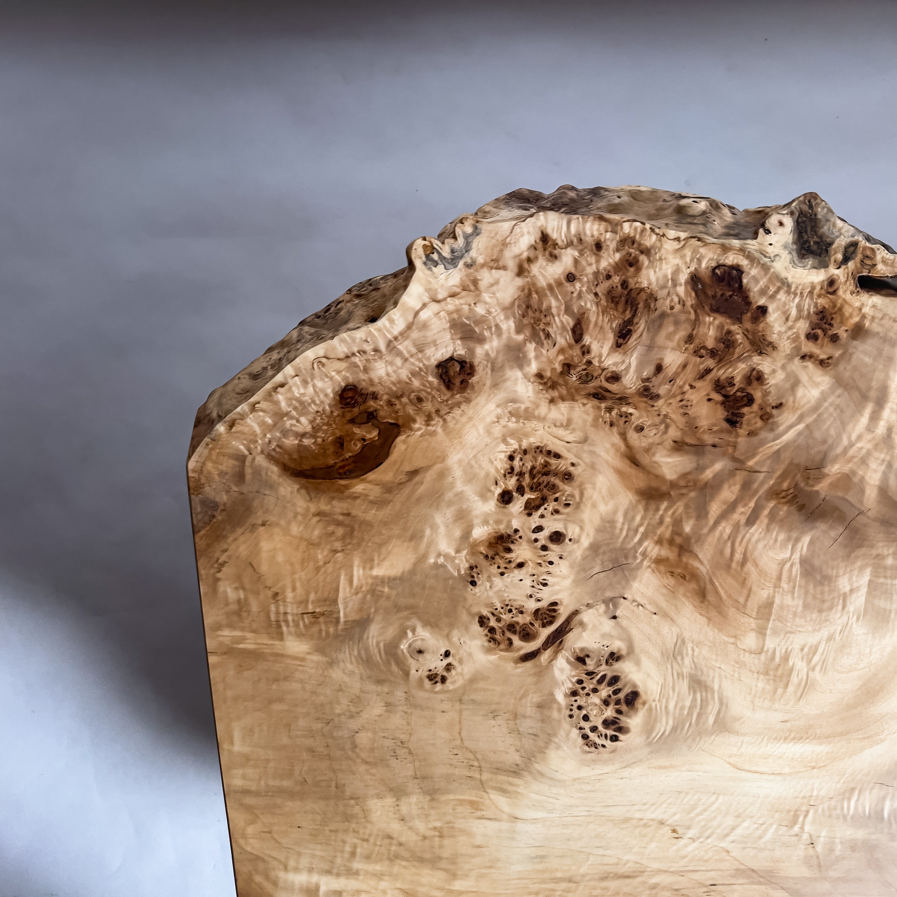 この一枚板の希少性:非常に高い 奥行きの深い範囲で木目のうねりと節周辺の表情が連続し、耳の起伏も同時に現れています。これらが揃う個体は限られ、同条件での再入荷が難しいため希少性が高いです。 |