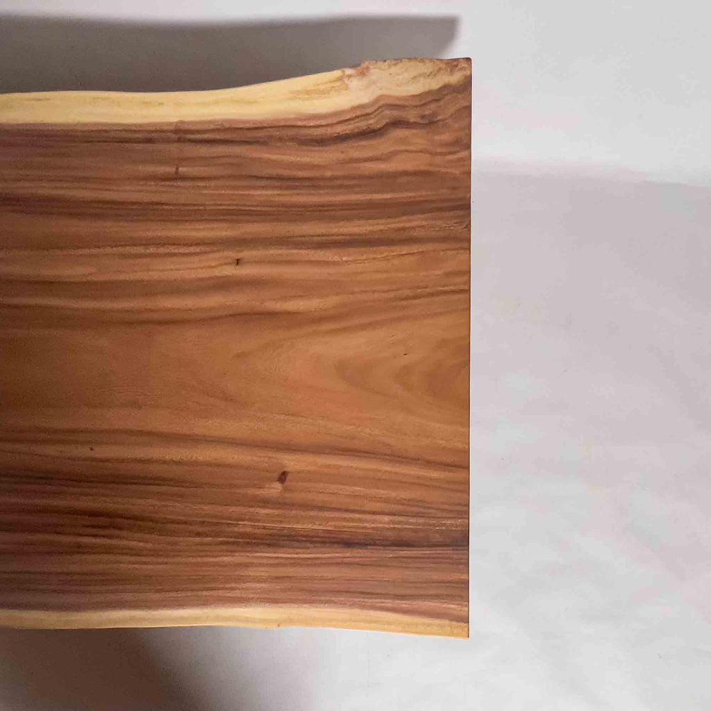 中央をゆるやかに横切る濃淡の帯と、外側に残る淡い耳が対比をつくり、この一枚の面に穏やかな動きを生んでいます。温暖な地域で大きく育つモンキーポッドらしく、成長の早さが生む幅のある面と色の重なりが、自然の時間をそのまま残した佇まいを形づくっています。