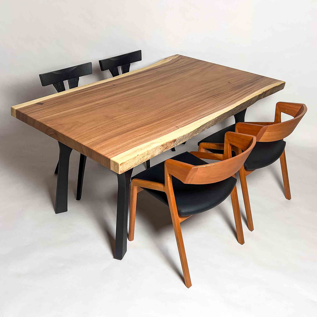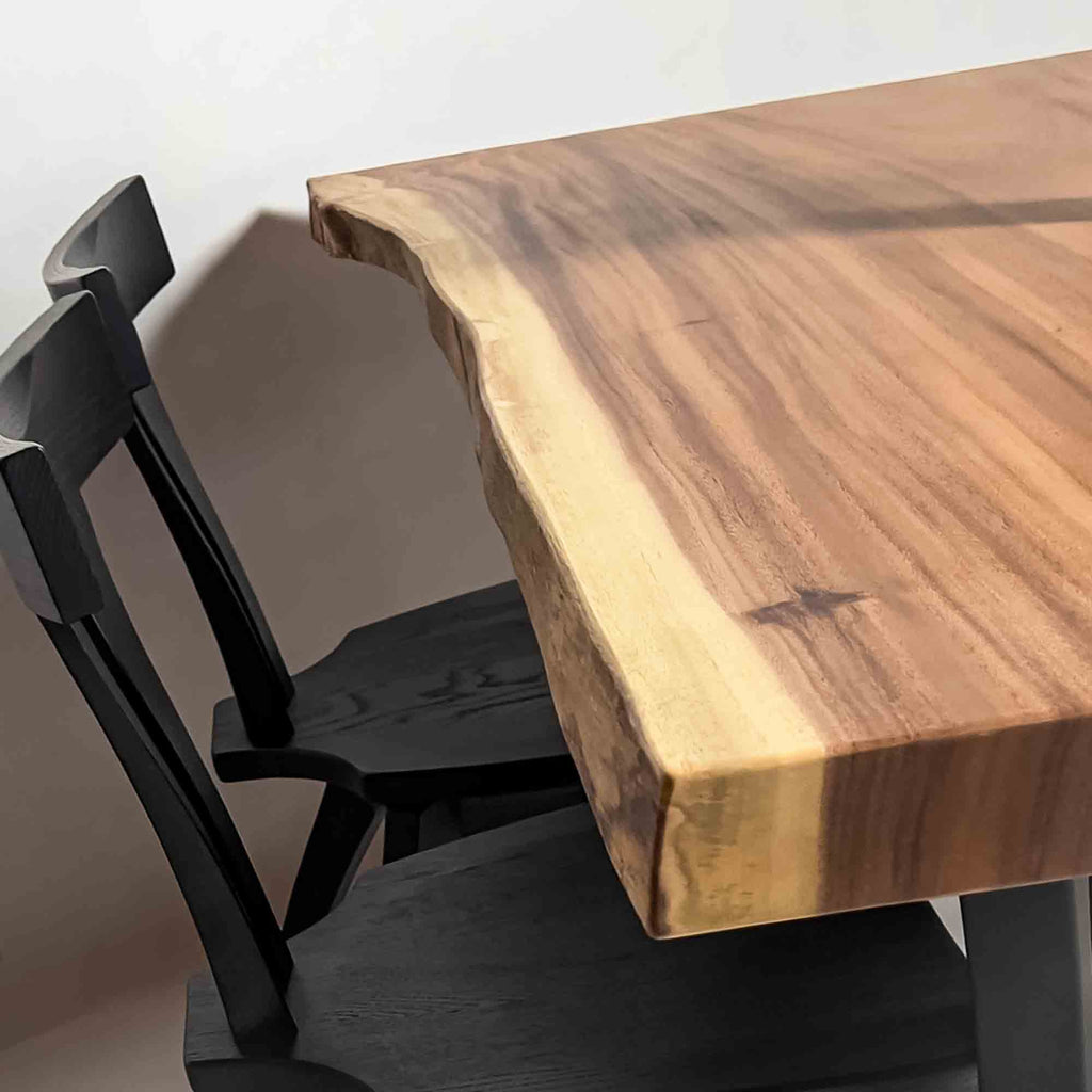 現代の空間に映えるモダンな佇まいを意識しつつ、一枚板ごとに素材感と存在感の出方を見極め、加工を行います。造形を整えすぎず、木が本来持つ表情を残すことを大切にしています。 ![]() |