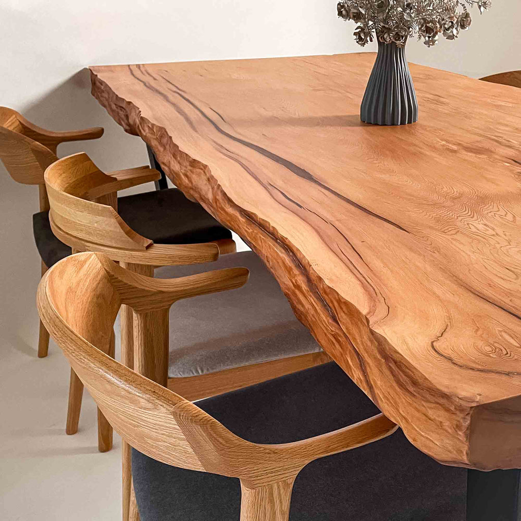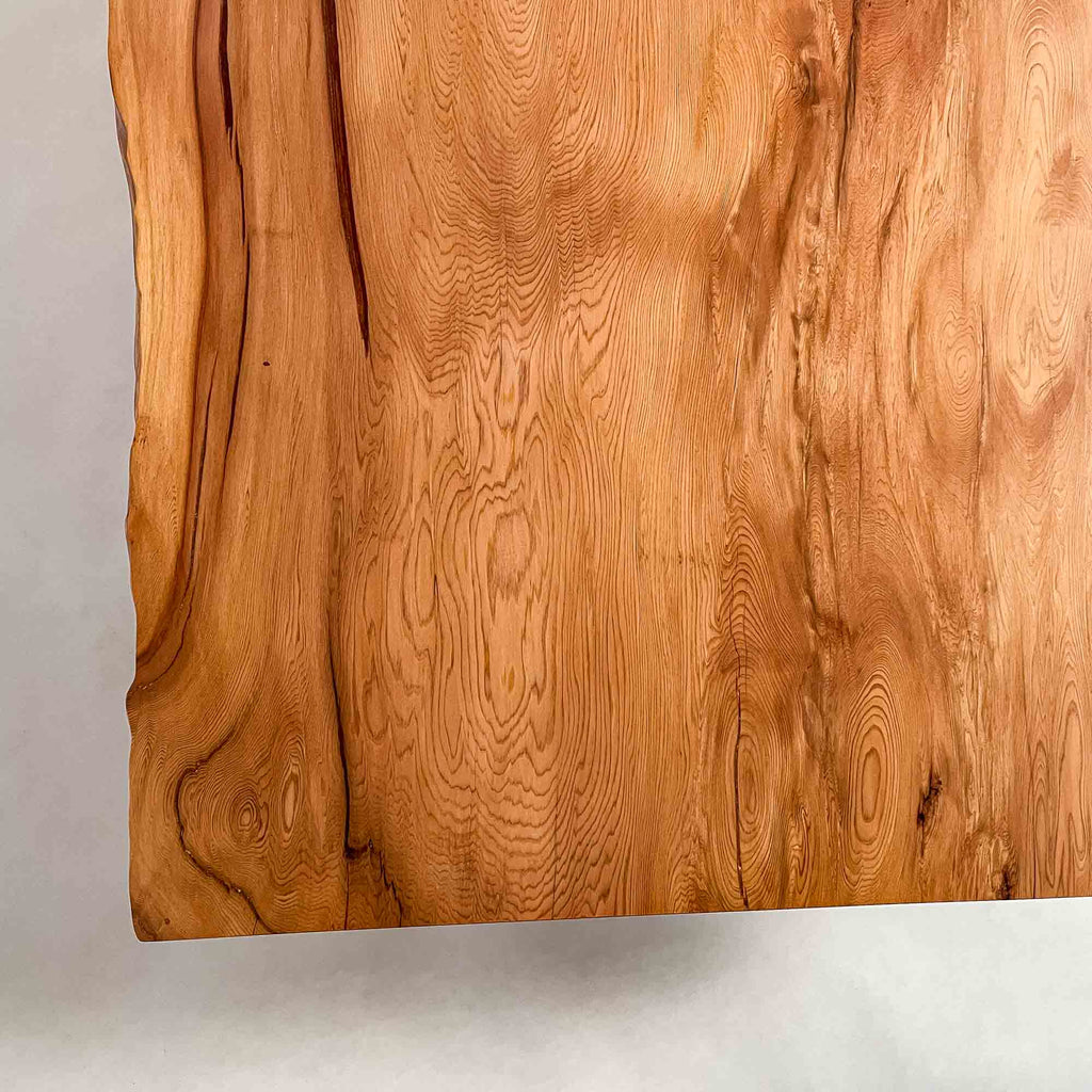 長い時間で積層した年輪が濃淡と筋として現れ、揺らぐ輪郭とともに暮らしの中心に自然な基準をつくります。