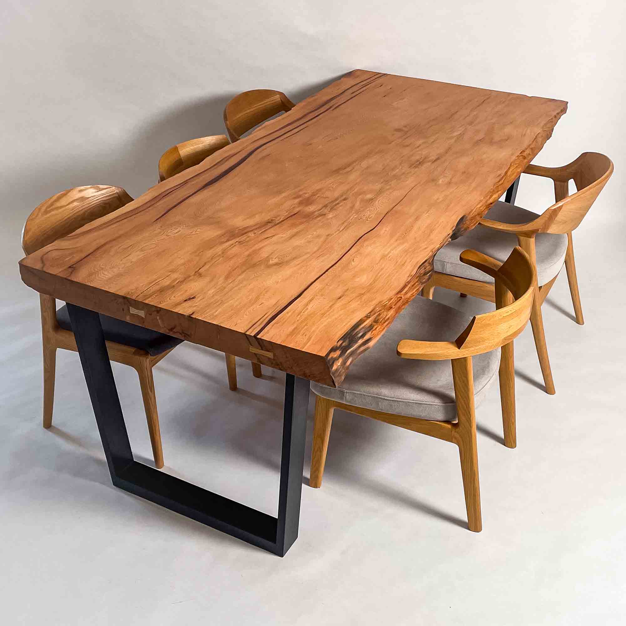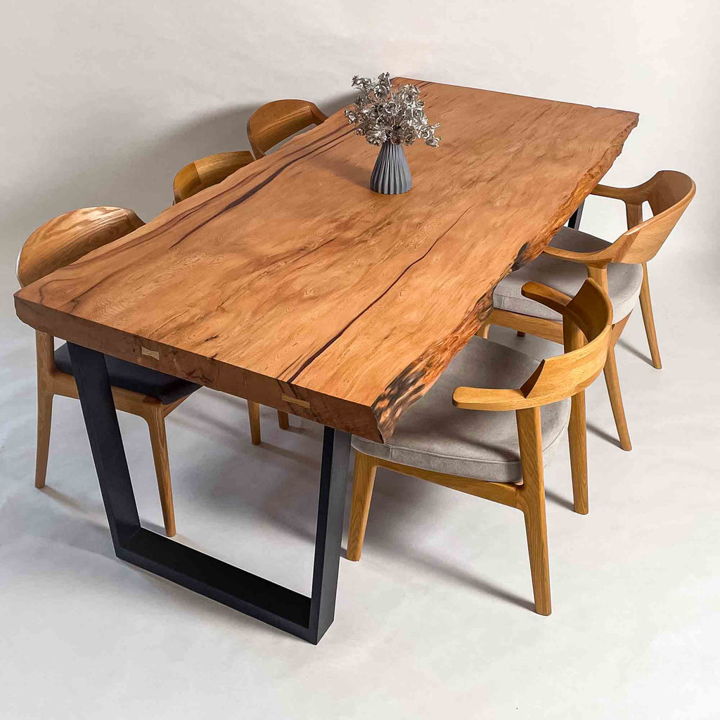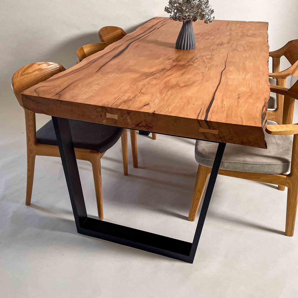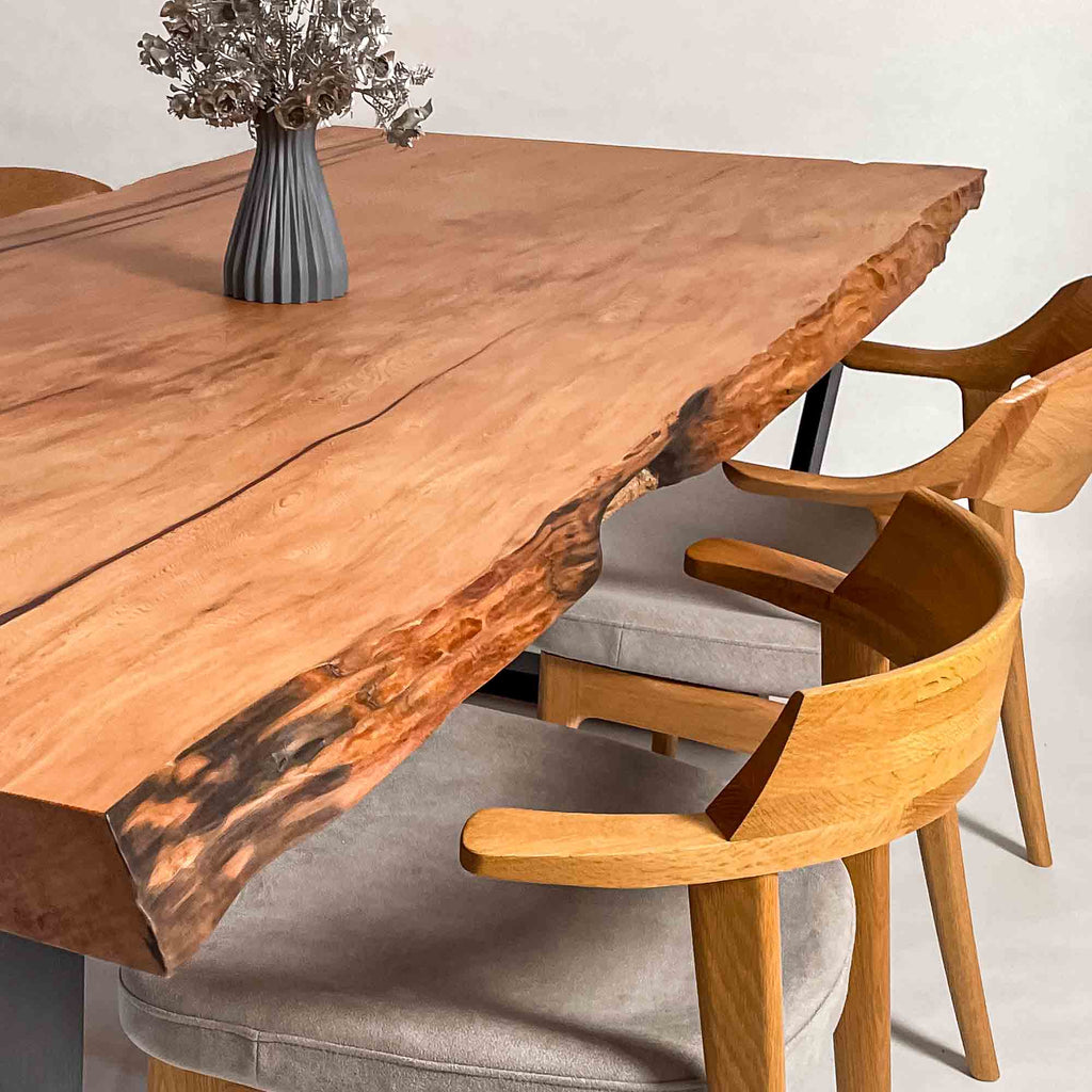 空間相性:モダン 直線的な脚と対比する揺らぎある輪郭と濃色筋が、無機質な空間に木目の流れを加え高相性です。