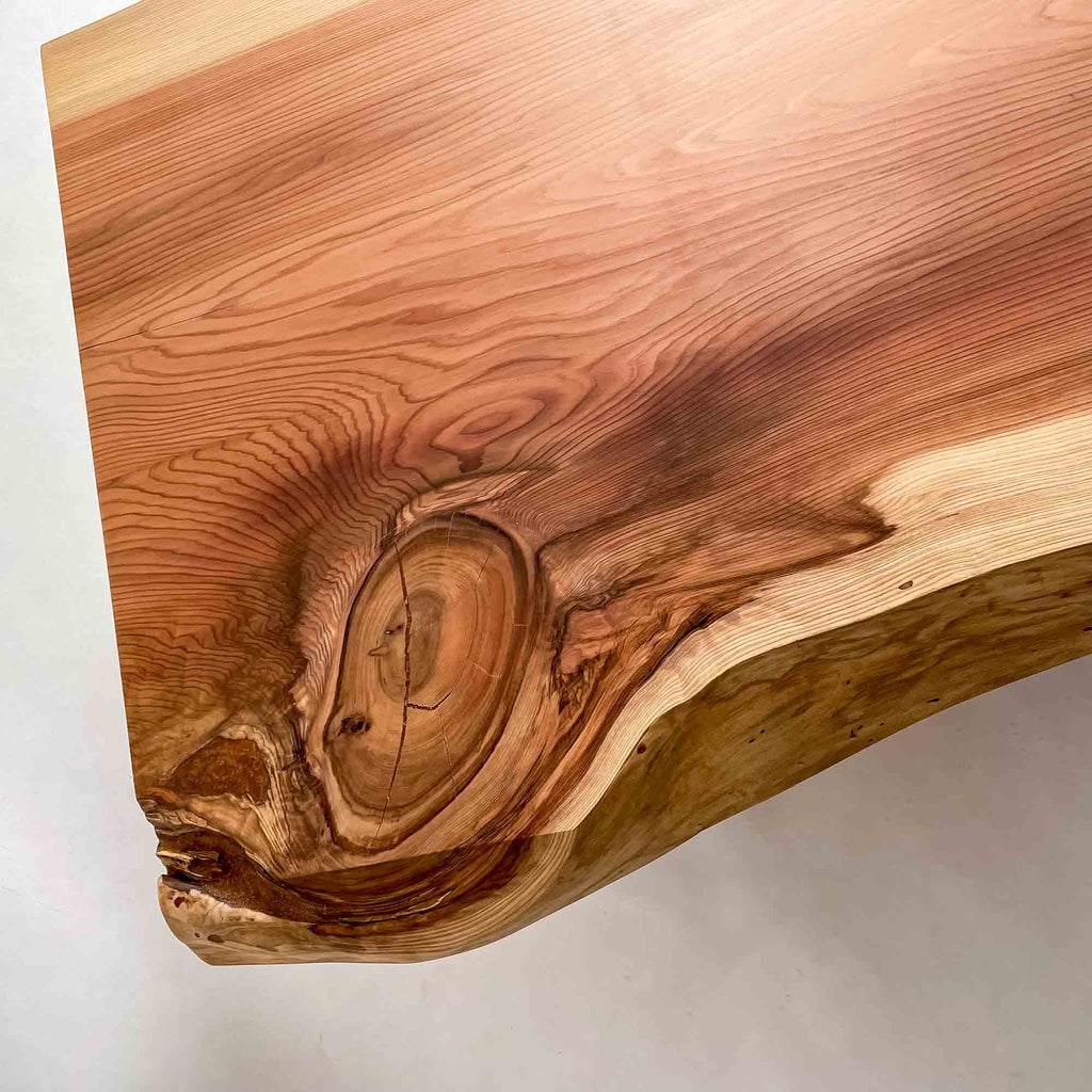 複数の板をつなぎ合わせたものとは異なり、途切れることなく続く杢目は自然の美しさをそのまま映し出します。