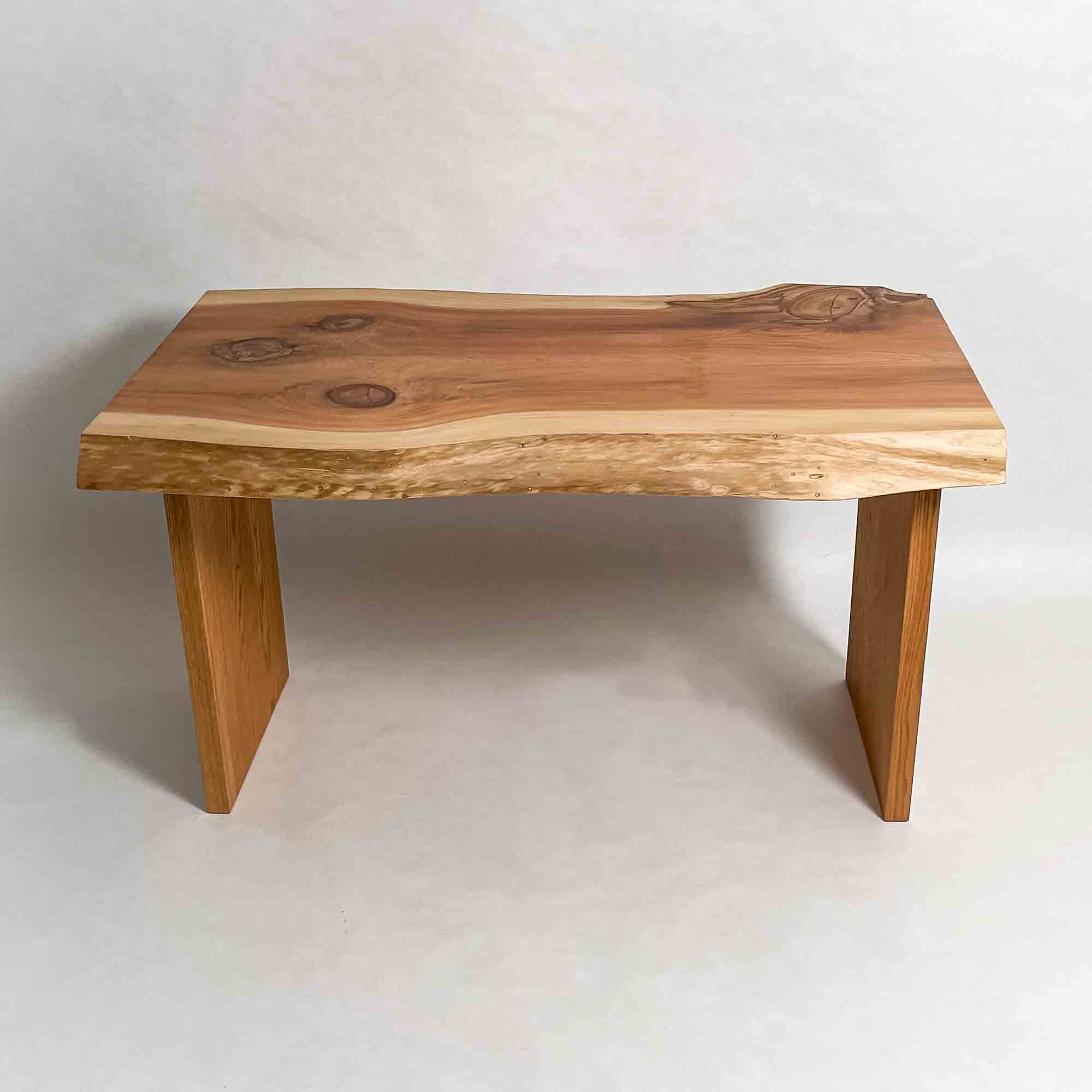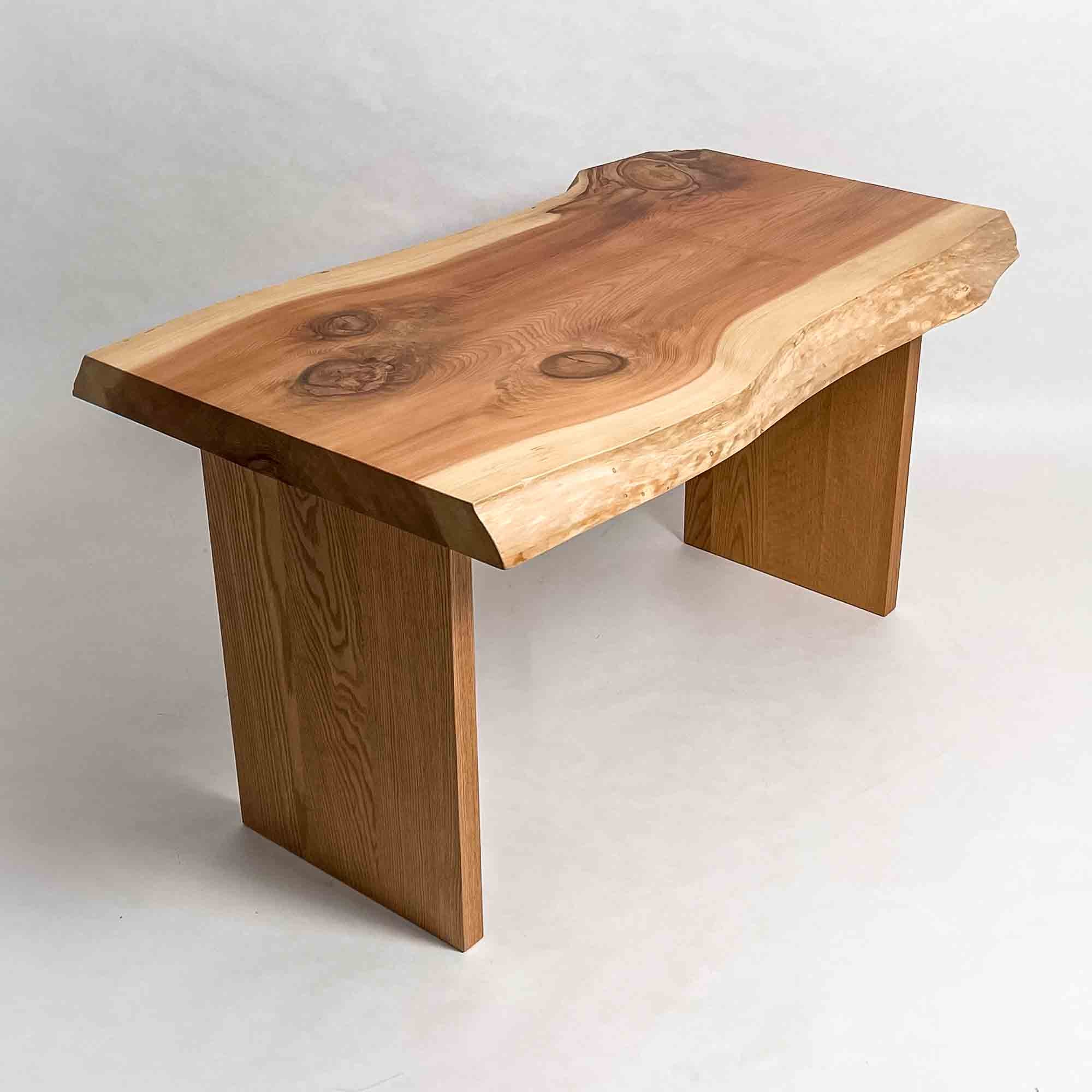 両側が緩やかにくびれる非対称の輪郭に、中央へ流れる整った木目と複数の節が重なり、視線が自然と一点に集まる構成で、小ぶりながら空間に明確な芯を生み出す一枚です。