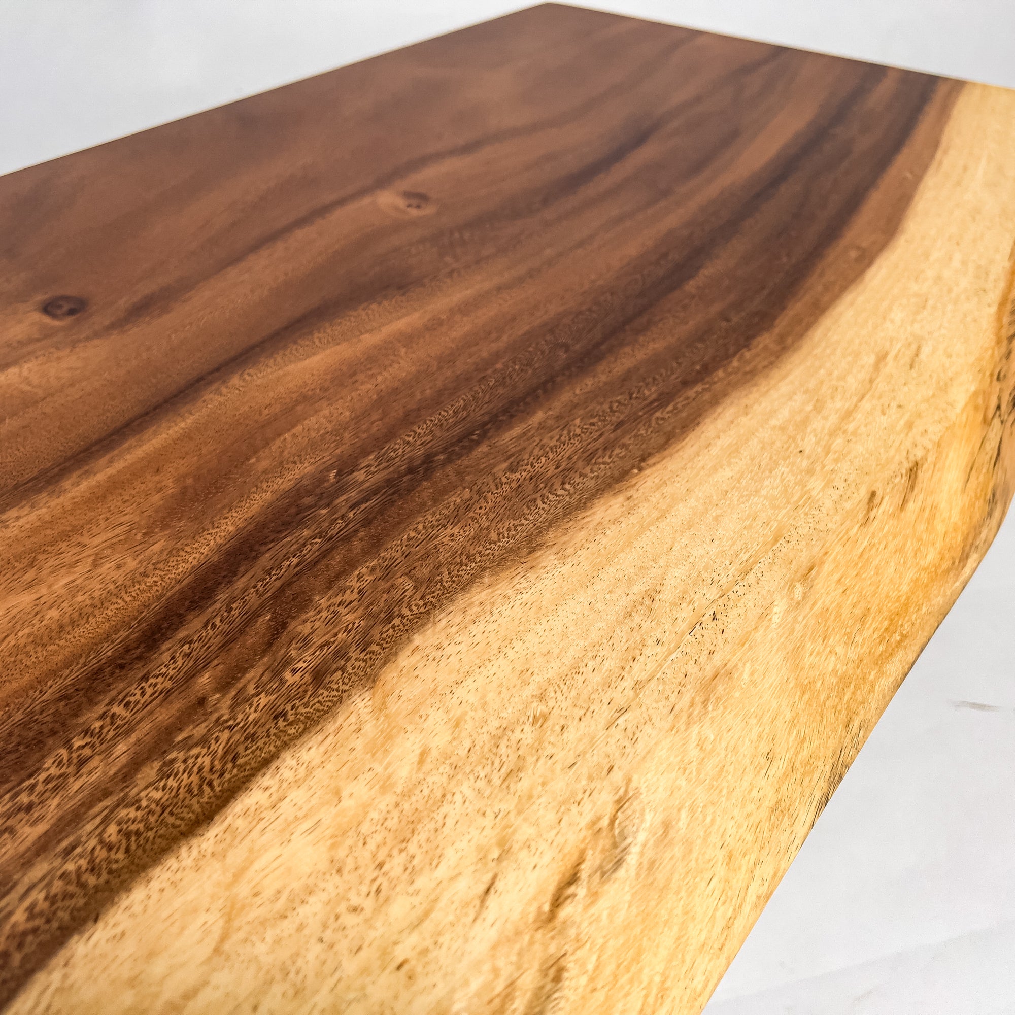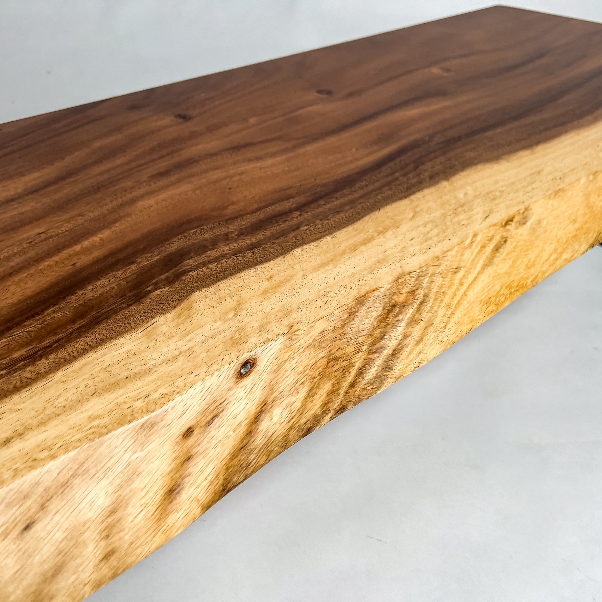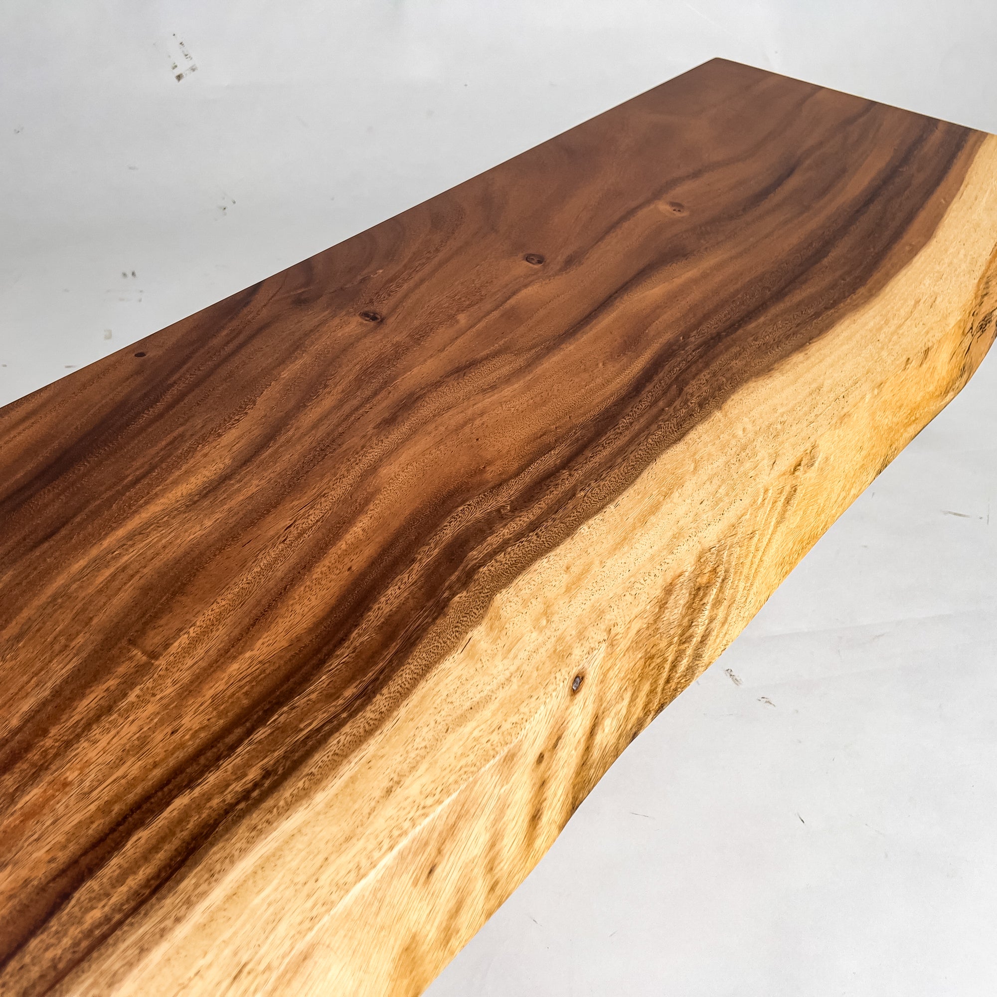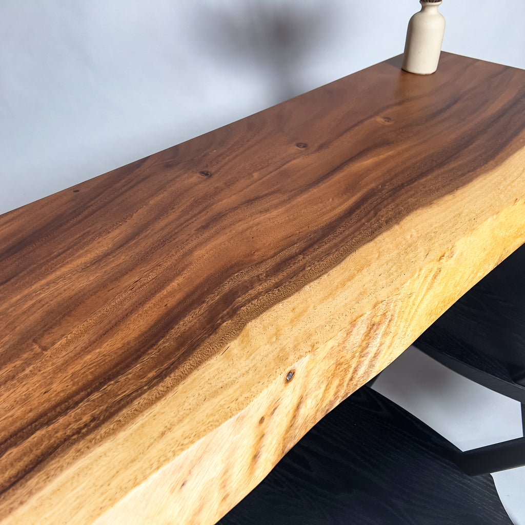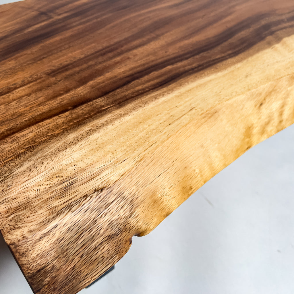 木材の中心部分の心材は濃いダーク色を持ち、耳・皮の部分となる辺材は白い色味が特徴的。綺麗ではっきりと異なるコントラストが美しいモンキーポッド。一枚板の最大の特徴である躍動感も強く感じることができ、お部屋のアクセントとしても活躍する一枚板です。