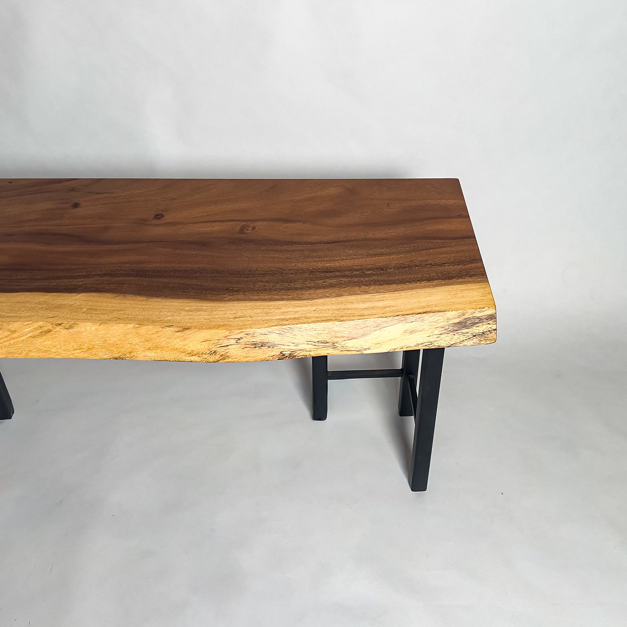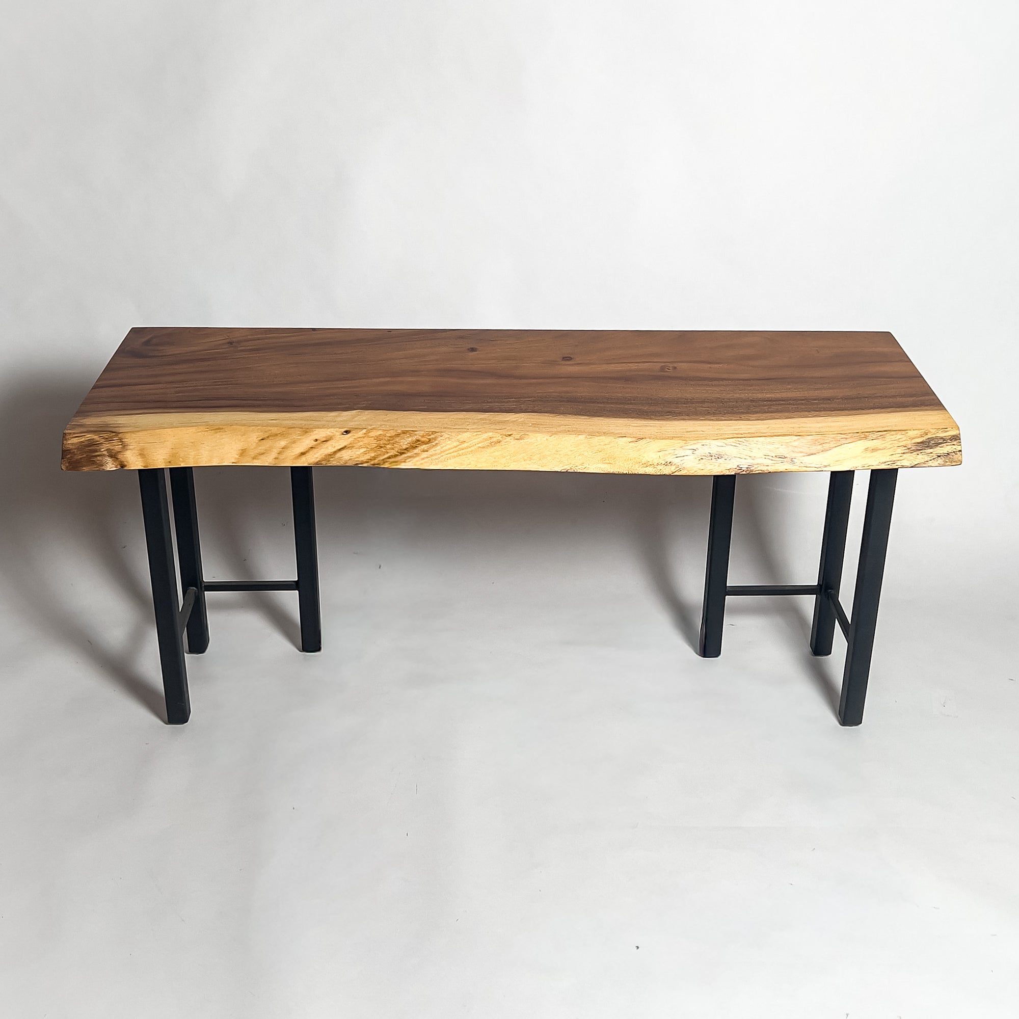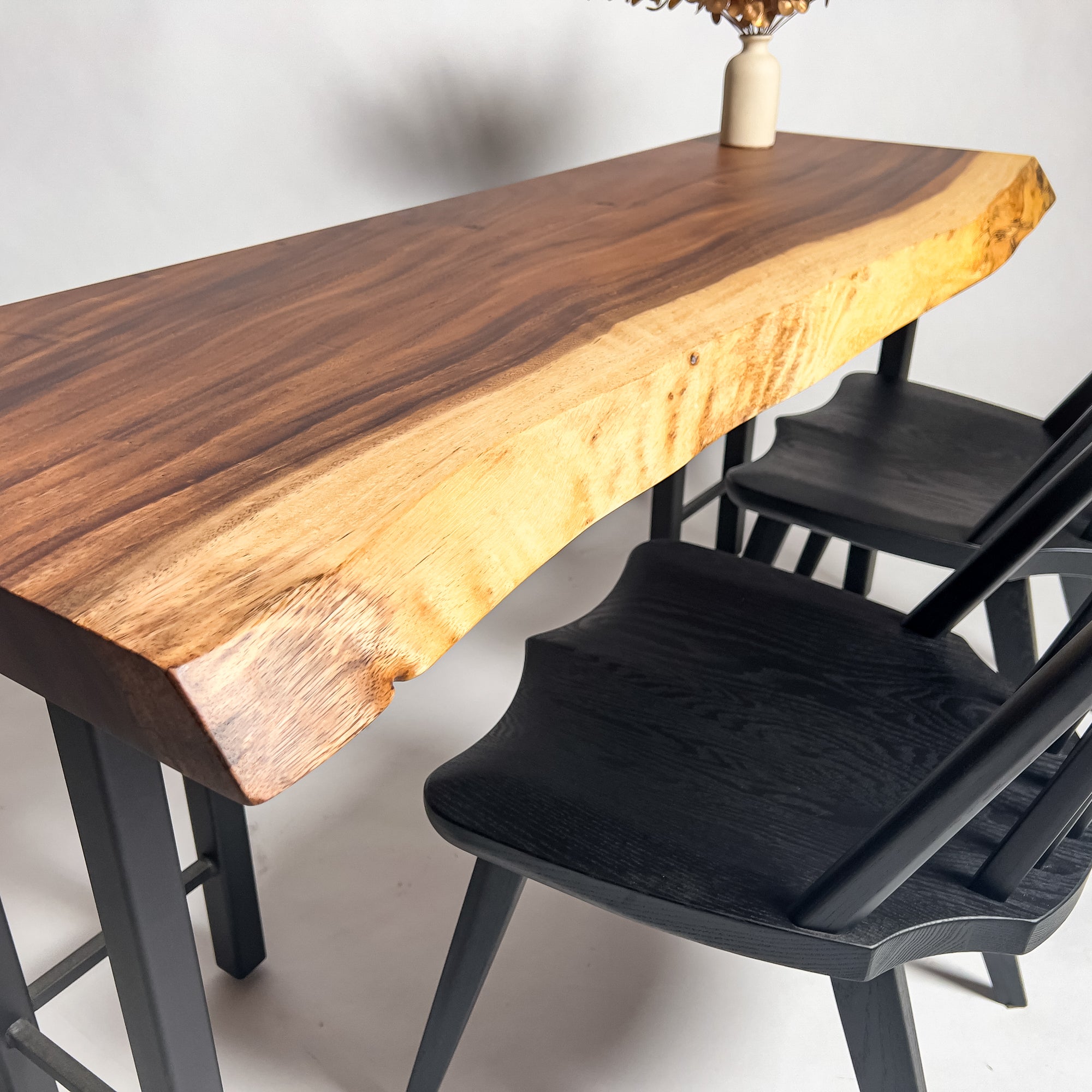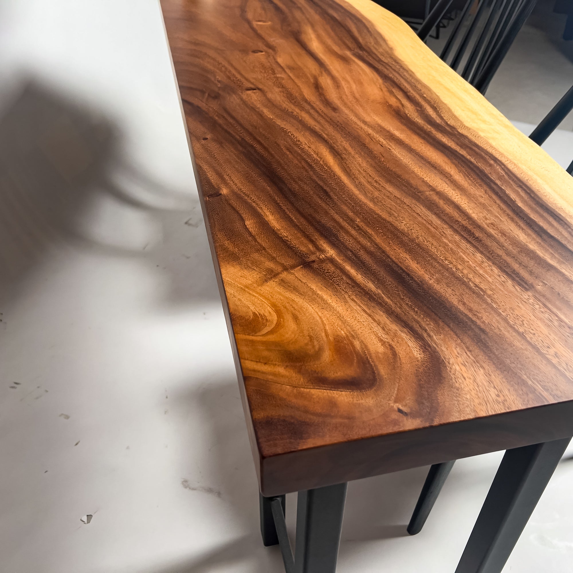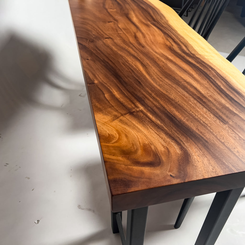 木材の中心部分の心材は濃いダーク色を持ち、耳・皮の部分となる辺材は白い色味が特徴的。綺麗ではっきりと異なるコントラストが美しいモンキーポッド。一枚板の最大の特徴である躍動感も強く感じることができ、お部屋のアクセントとしても活躍する一枚板です。