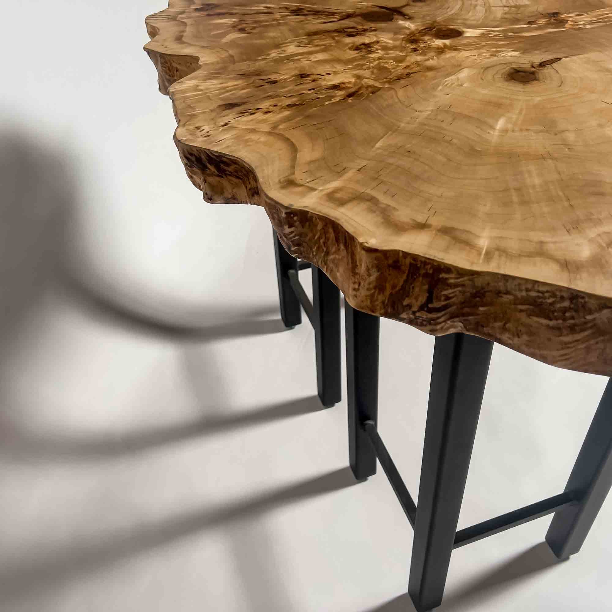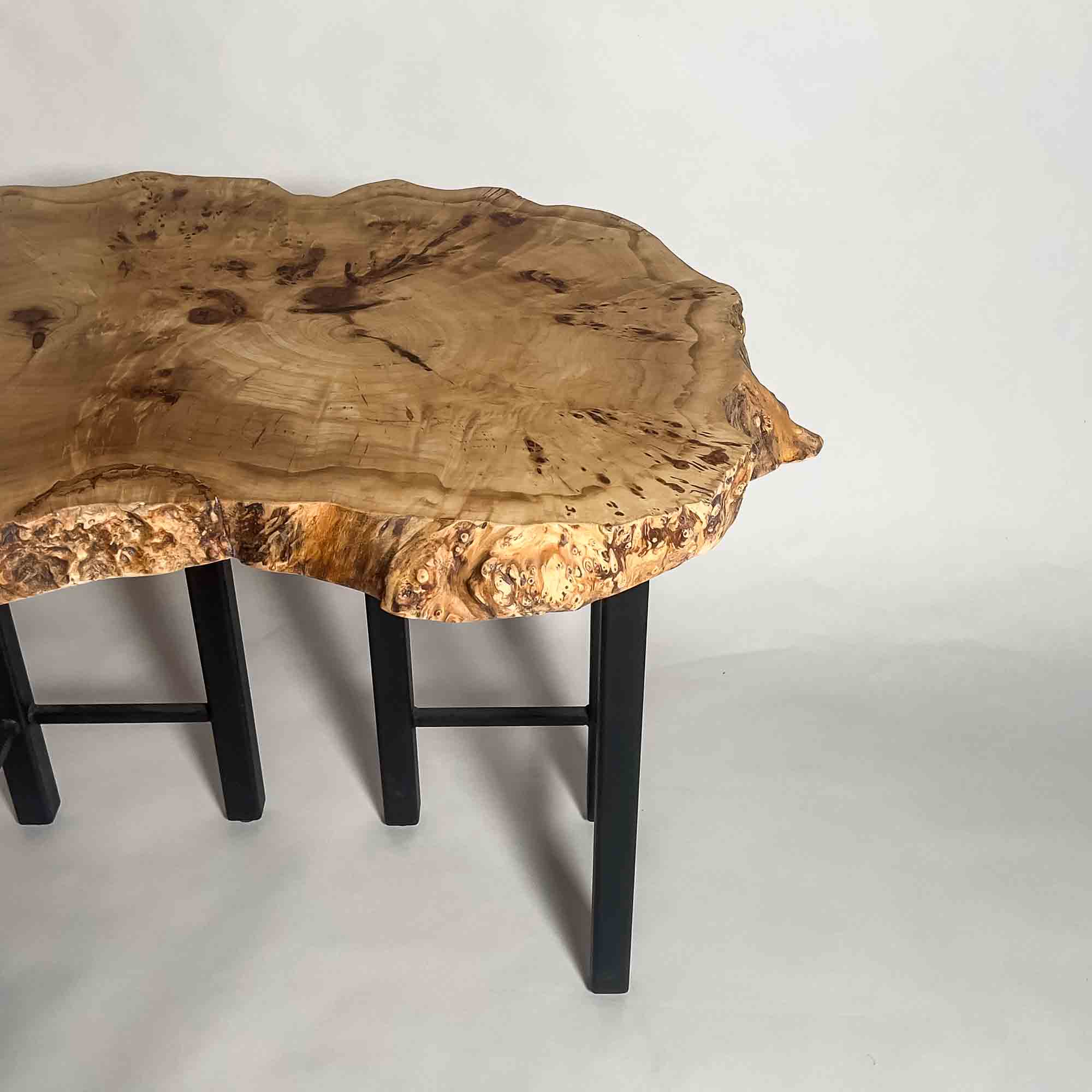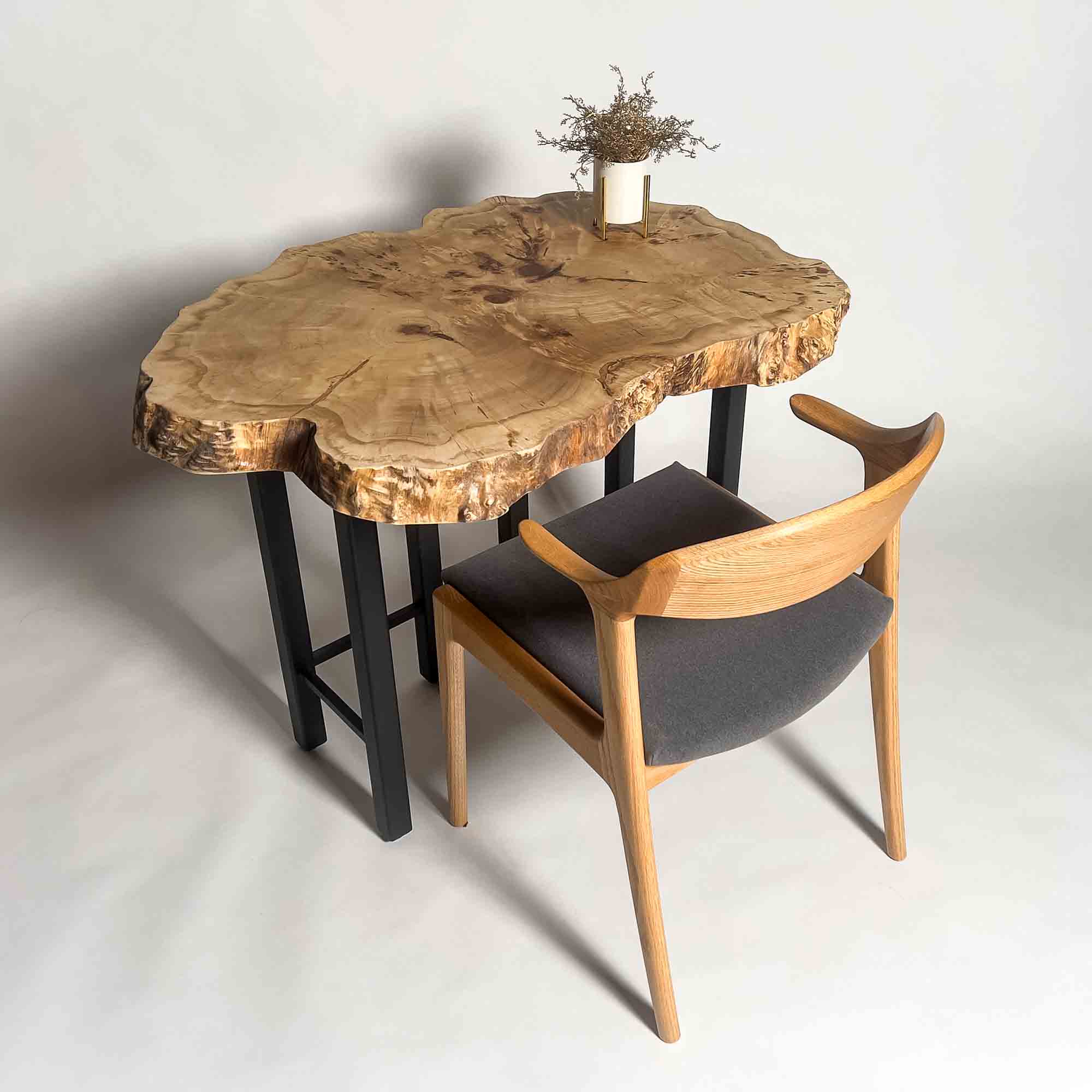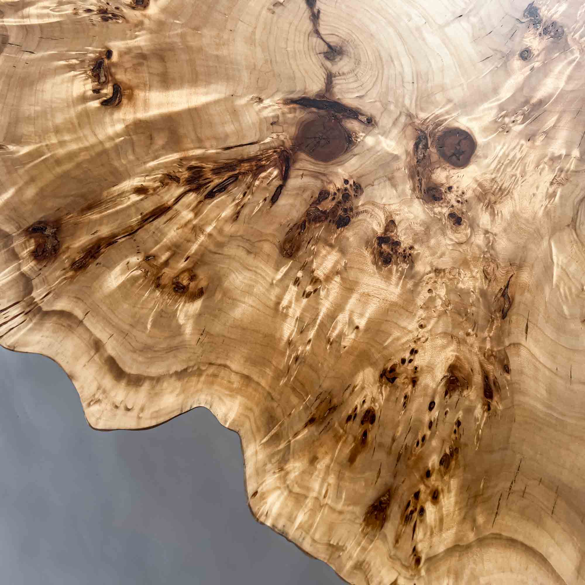 高級感漂う瘤杢(こぶもく)を持ち、荒々しく躍動的な形も魅力的なポプラ。立体感と光沢感ある杢目と雰囲気が魅力的でお部屋を上質で高級な印象に。白く煌びやかに輝き、一際異彩を放つ一枚板。