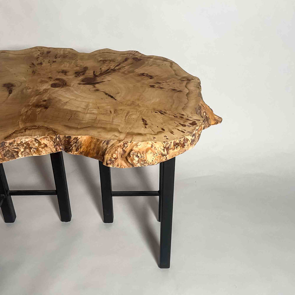 | 時代を超えて受け継がれる機能性と、現代の暮らしに寄り添うデザイン性を兼ね備えた一枚板家具の製作を手がける。 | 現代の空間に映えるモダンなデザイン性を取り入れながら、一枚板の持つ素材感と存在感を活かした加工・製作を行う。 | |