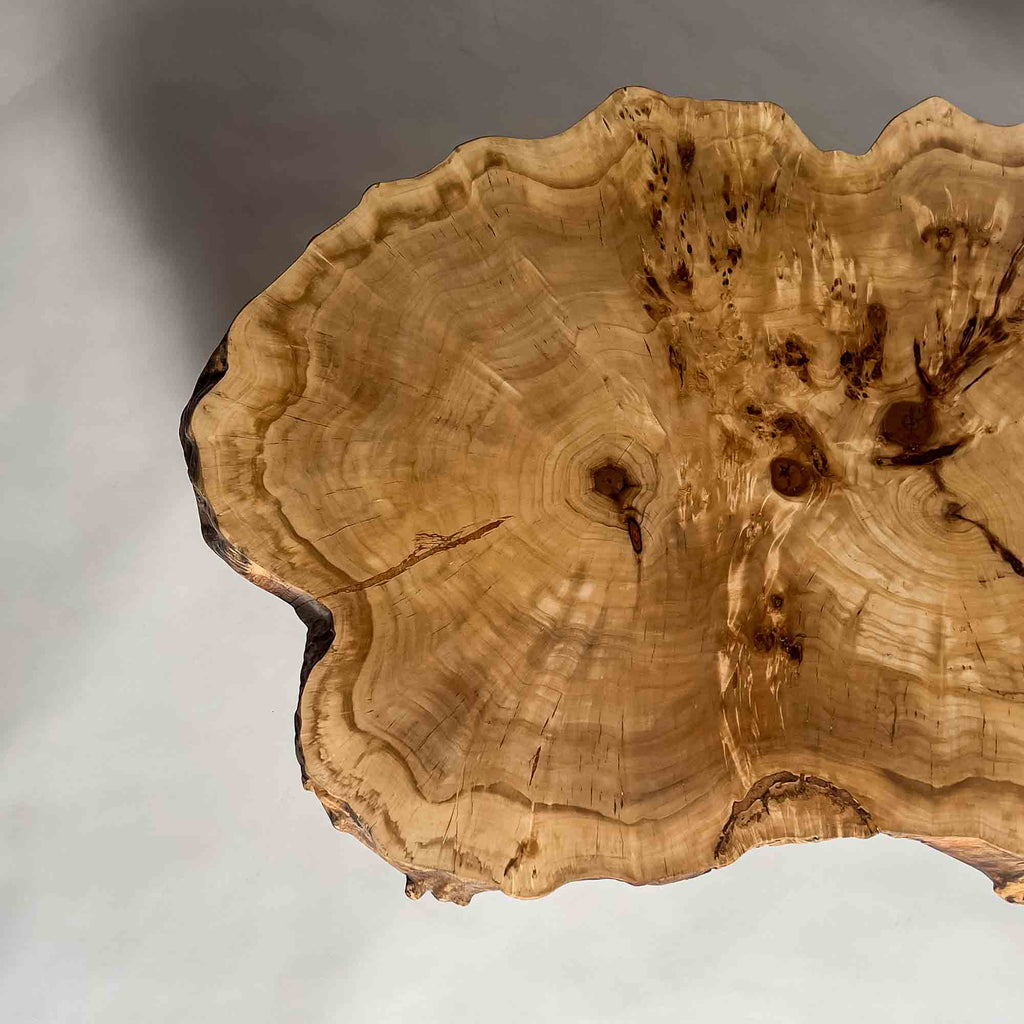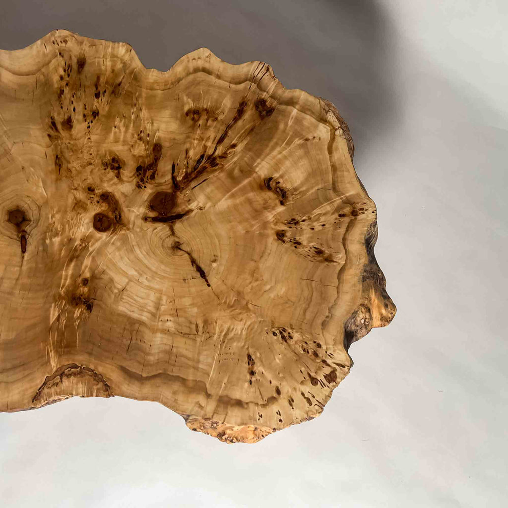 ポプラが大地でゆっくり育つあいだに重ねた年輪が、淡い色の中に流れるように広がっています。入り組んだ杢目は樹皮近くの動きがそのまま残ったもので、柔らかな模様がひとつの景色のように感じられます。自然の形を生かした加工で、凹凸の表情まで穏やかに手に伝わる質感。日々のそばに置きたい一枚。