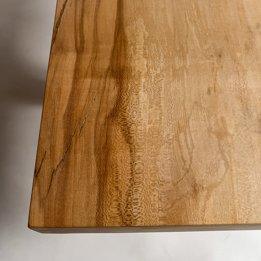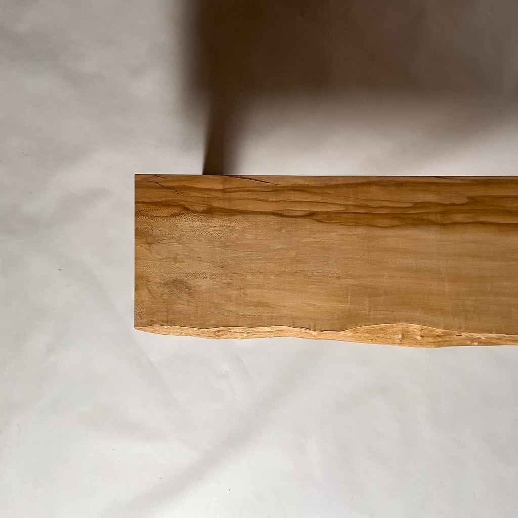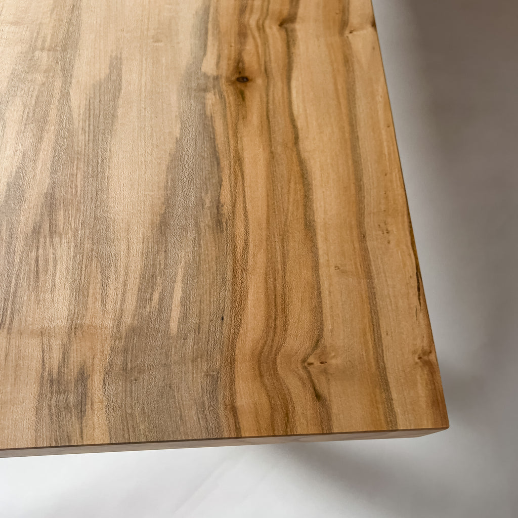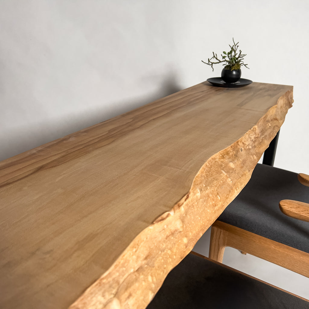 緻密で滑らかな木肌を持つ楓は、淡い乳白色と上品な光沢が魅力。硬く粘り強い性質を持つため一枚板テーブルに適し、経年変化で飴色へと深まる美しさと高い耐久性を兼ね備えています。